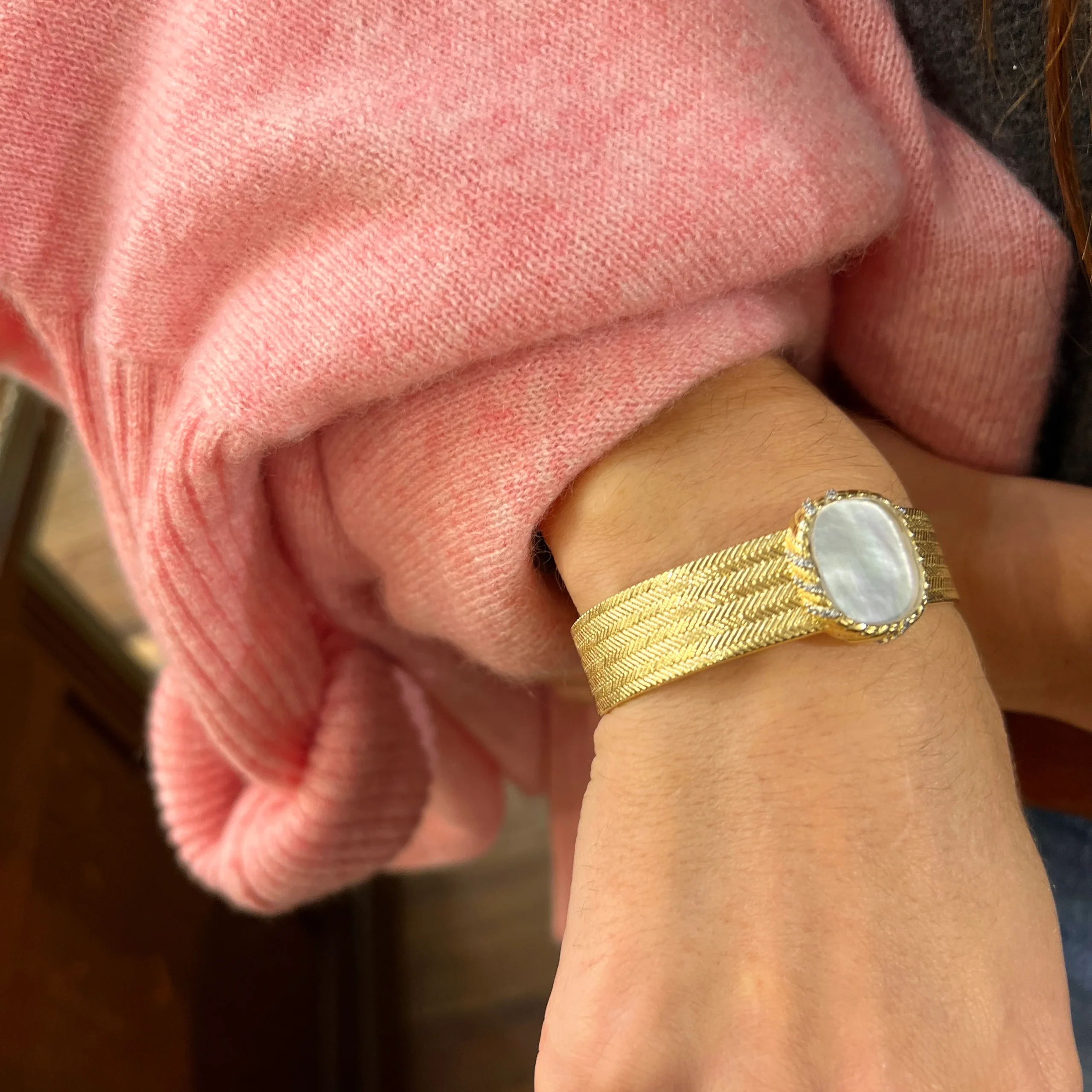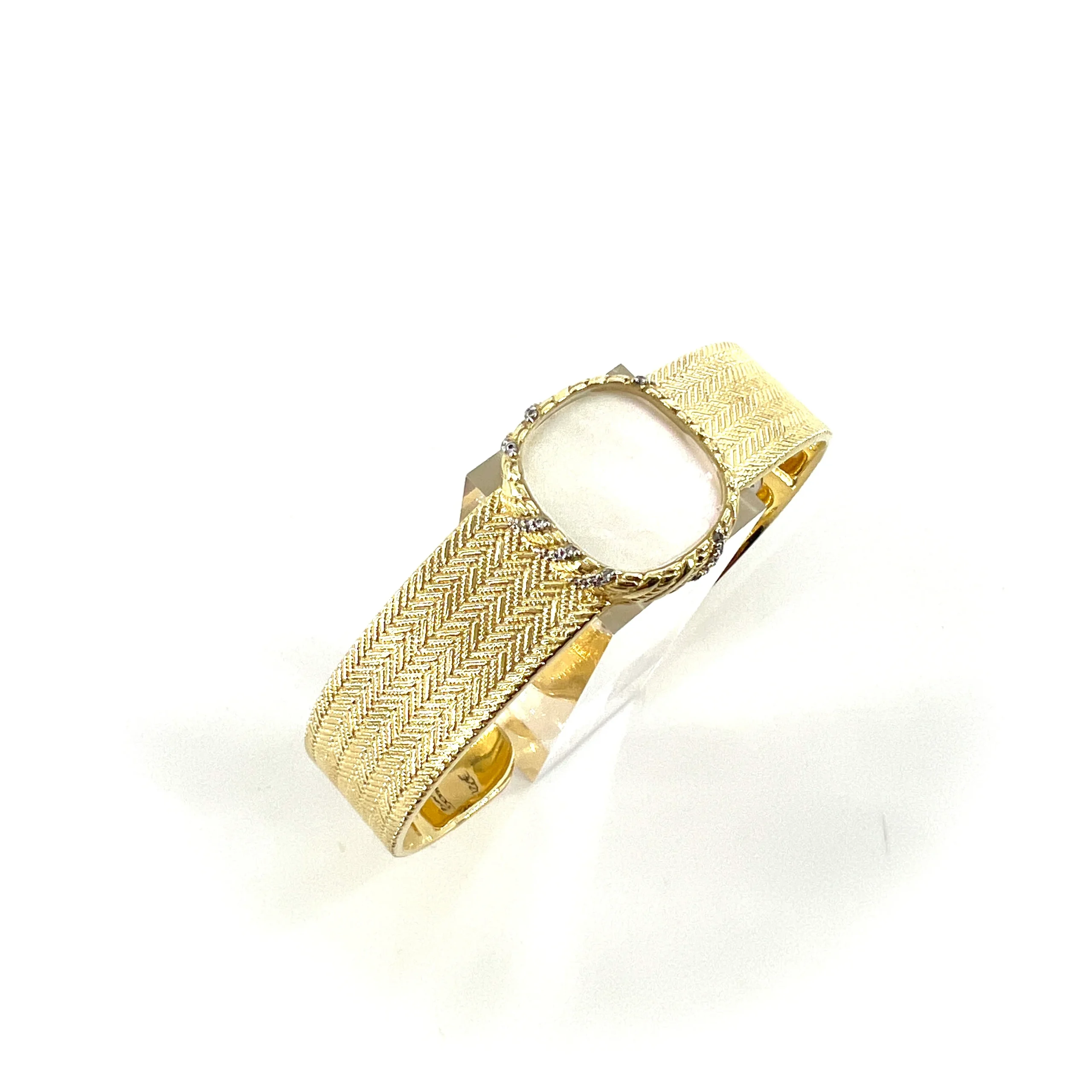 Il se compose d’une large nacre, dont le serti est ciselé et, agrémenté de zirconiums sur un rythme irrégulier.