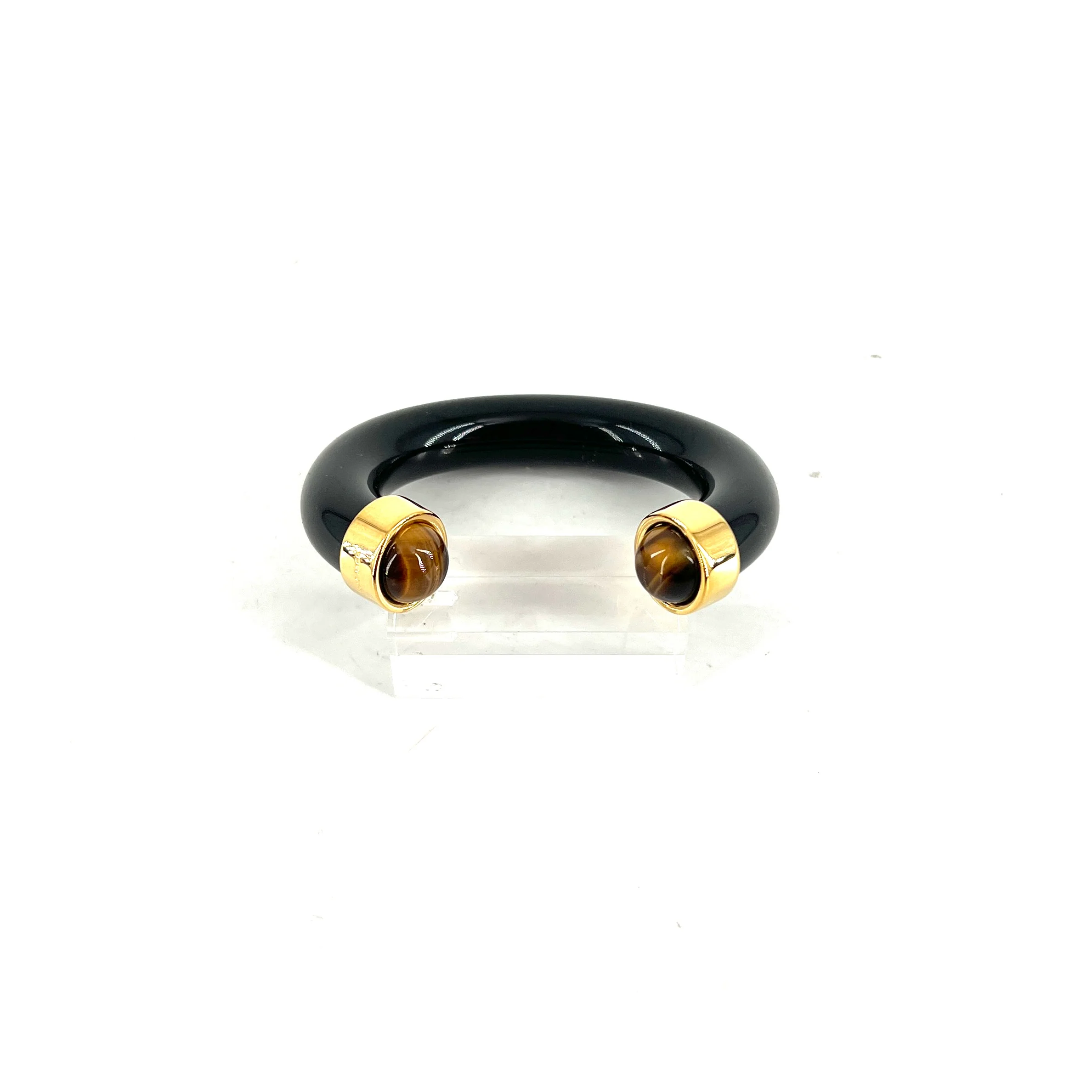 Ce jonc en Acétate Noir est agrémenté, en ses extrémités, de deux cabochons Oeil de Tigre cerclés Plaqué Or.