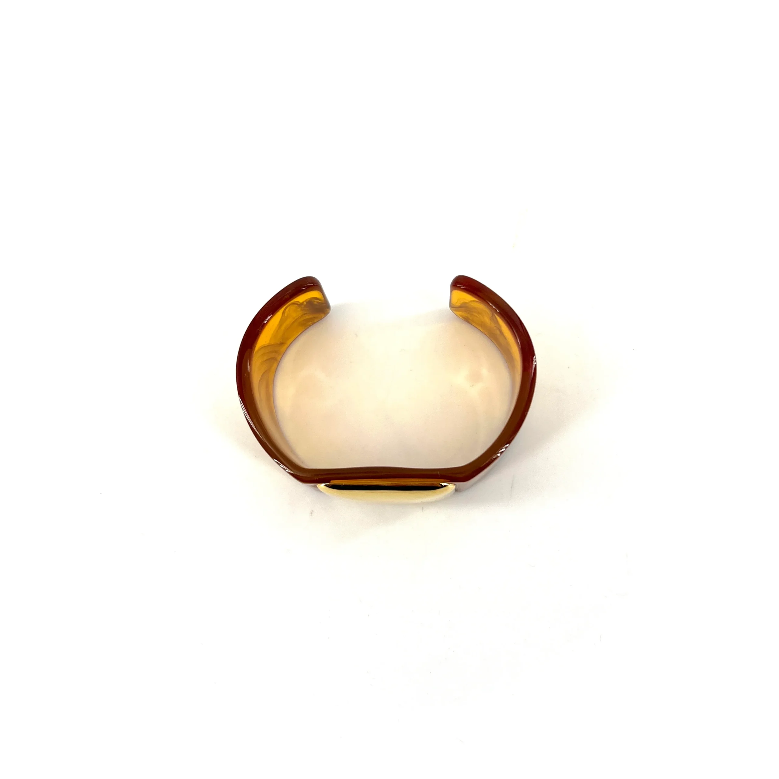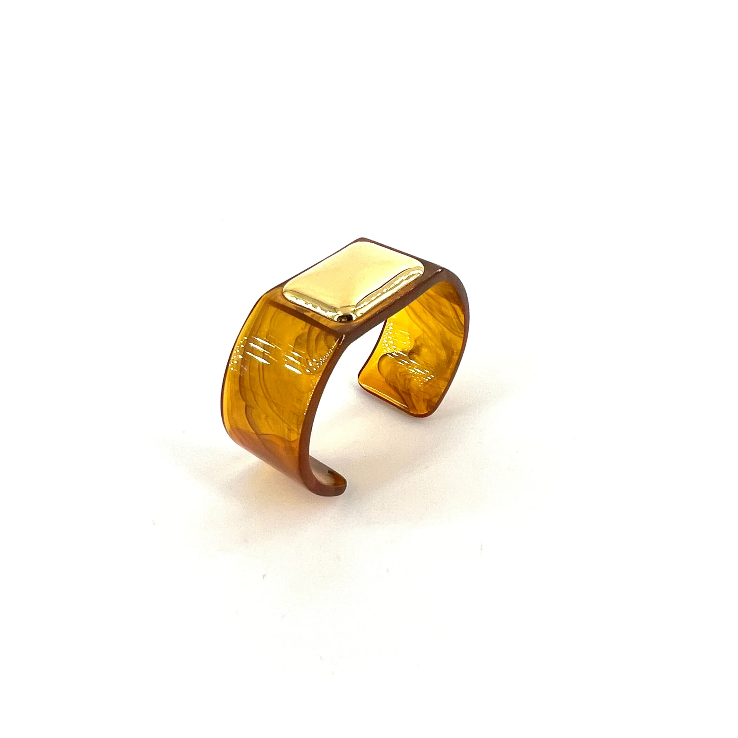 Ce large jonc en acétate Tortoise est agrémenté d’un cabochon rectangulaire en plaqué Or.