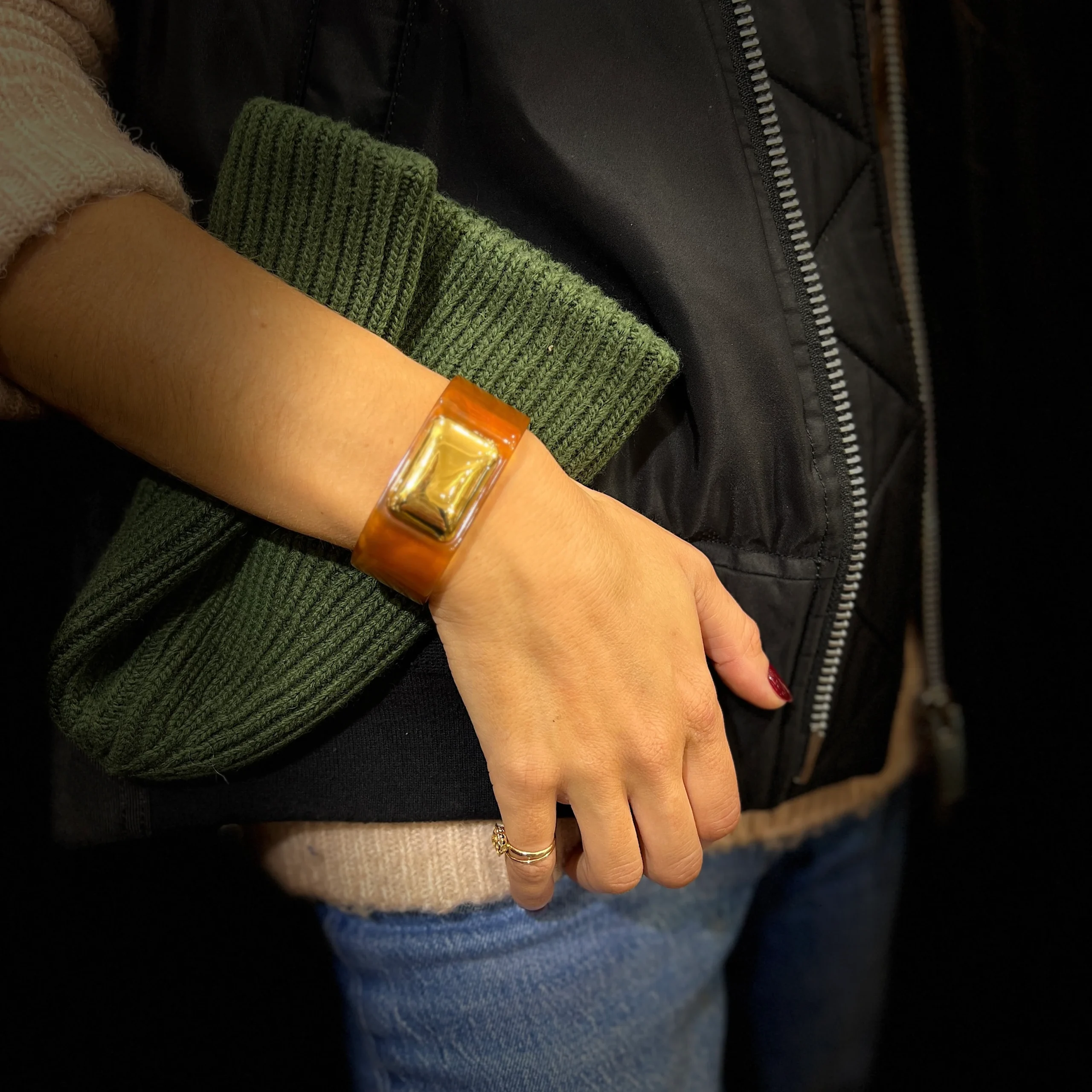 Ce large jonc en acétate Tortoise est agrémenté d’un cabochon rectangulaire en plaqué Or. Existe aussi en noir, et en plexiglas transparent.