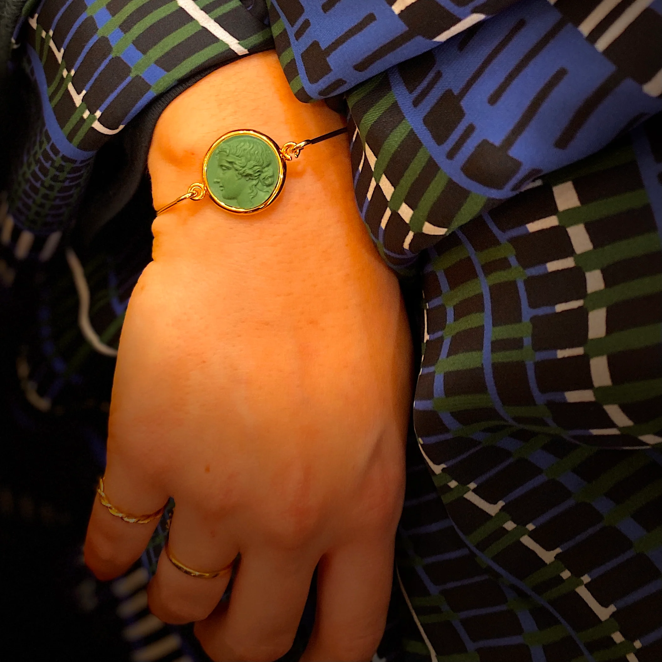 Jonc en Plaqué Or Motif Statue Grecque Rond en Résine Verte