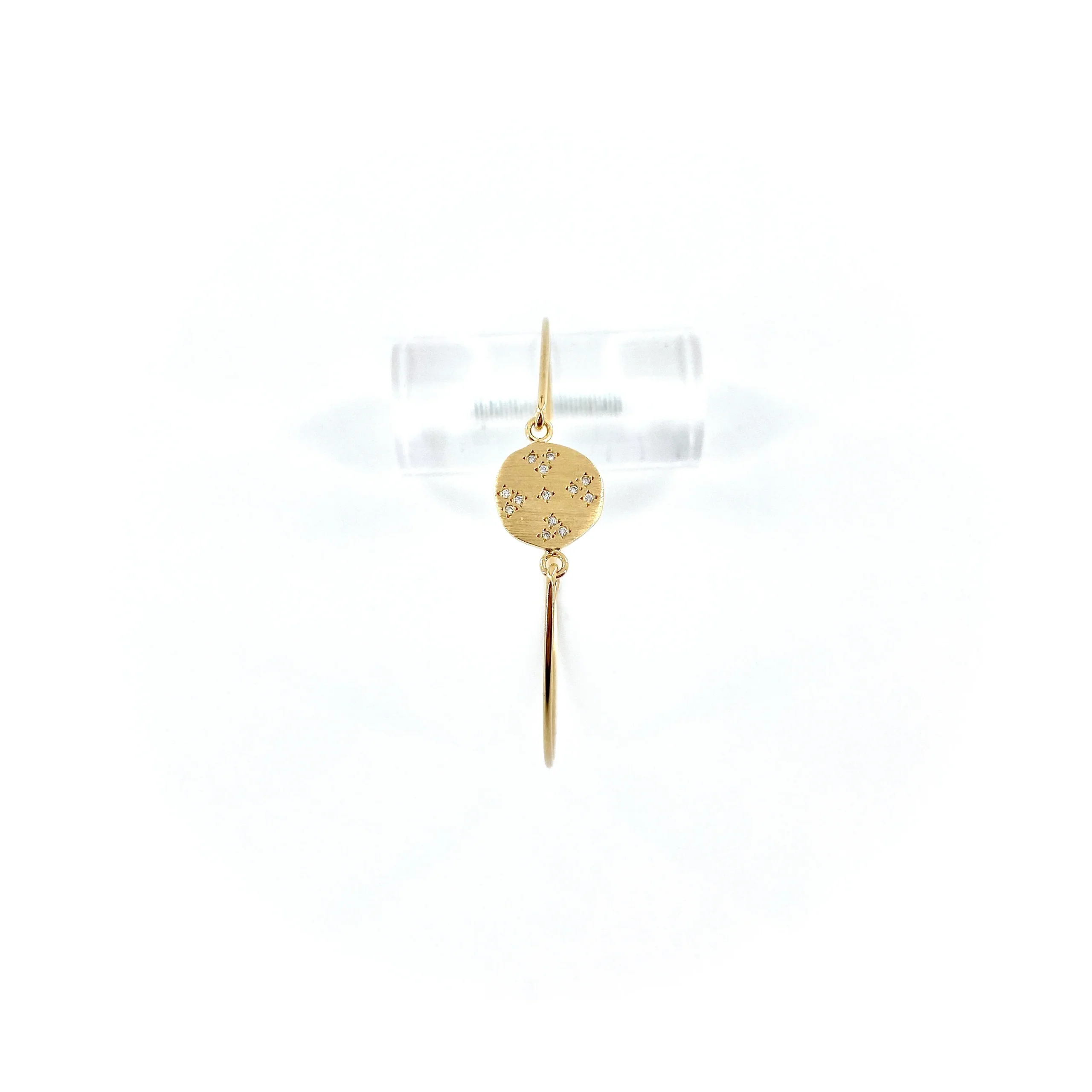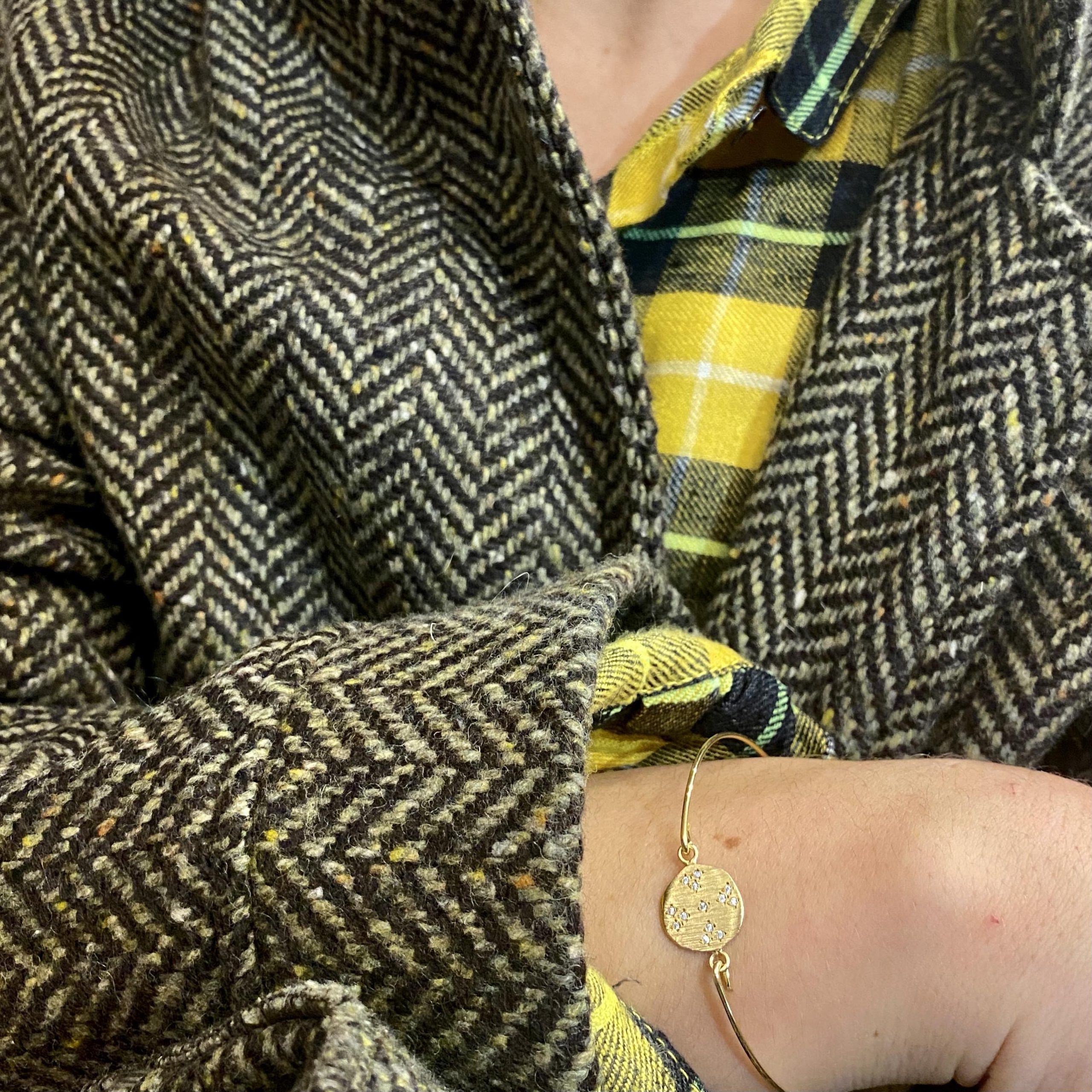 Ce jonc, orné d’une médaille dorée brossée mat sertie de Zirconiums blancs, se ferme par un système de crochet. À porter seul ou en accumulation. Laiton Plaqué Or 24 Carats (0.5 micron).