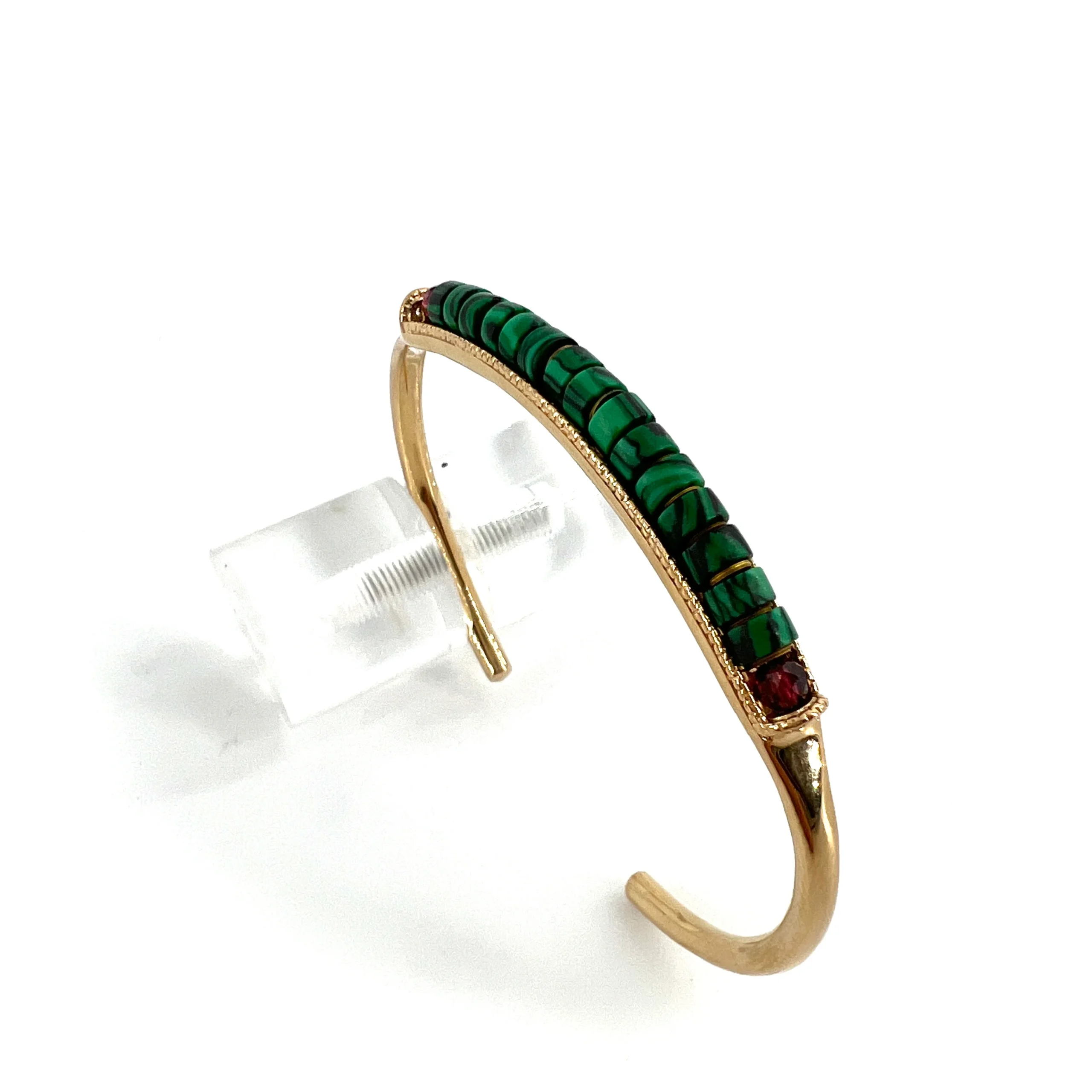 Ce jonc, en PlaquƩ Or, est agrƩmentƩ de malachites, et de deux grenats facettƩs.