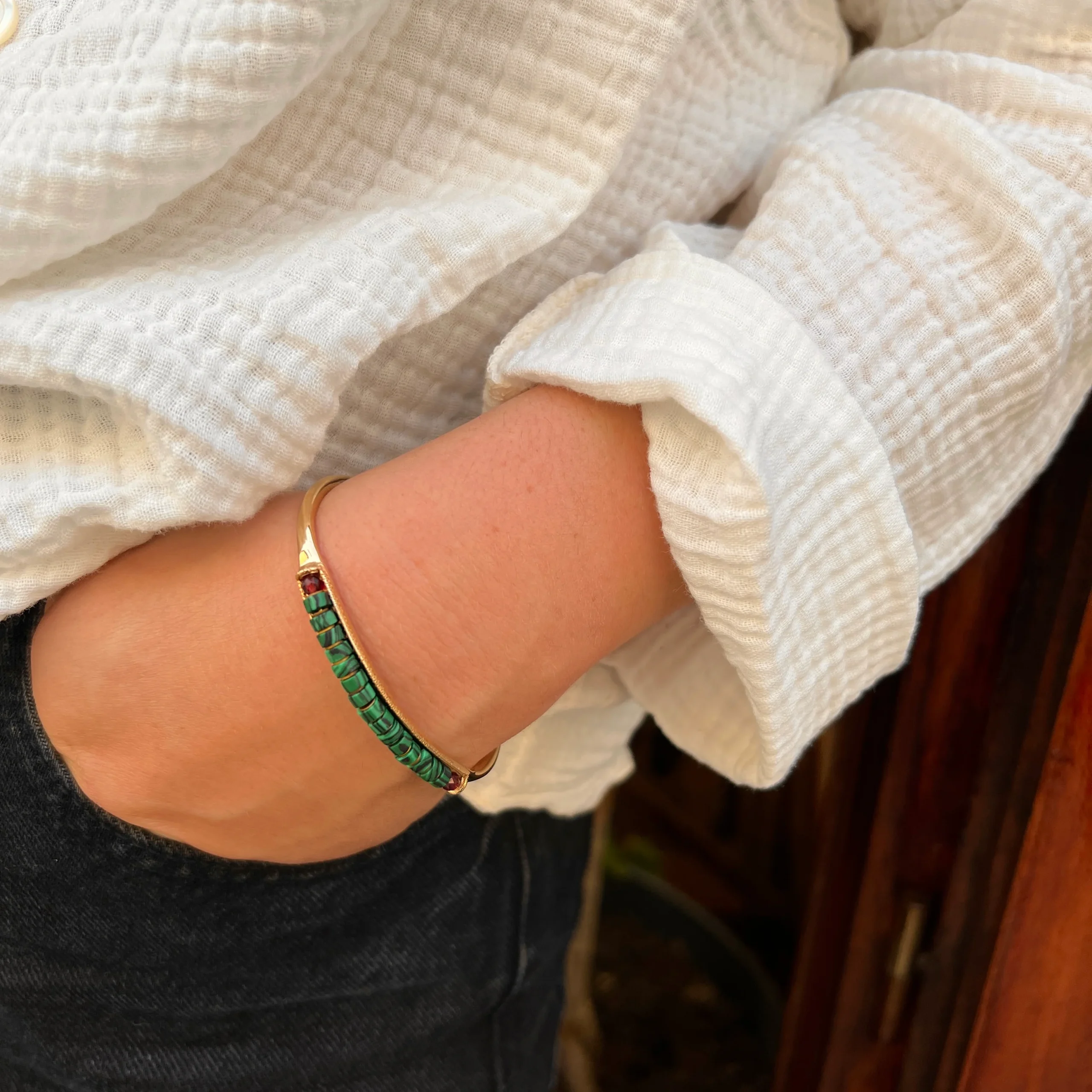 Ce jonc, en PlaquĆ© Or, est agrĆ©mentĆ© de malachites, et de deux grenats facettĆ©s. Ajustable, il se porte seul ou en accumulation. Existe aussi en turquoise. DorĆ© Ć l’Or fin, dessinĆ© Ć Paris et faƧonnĆ© Ć la main.