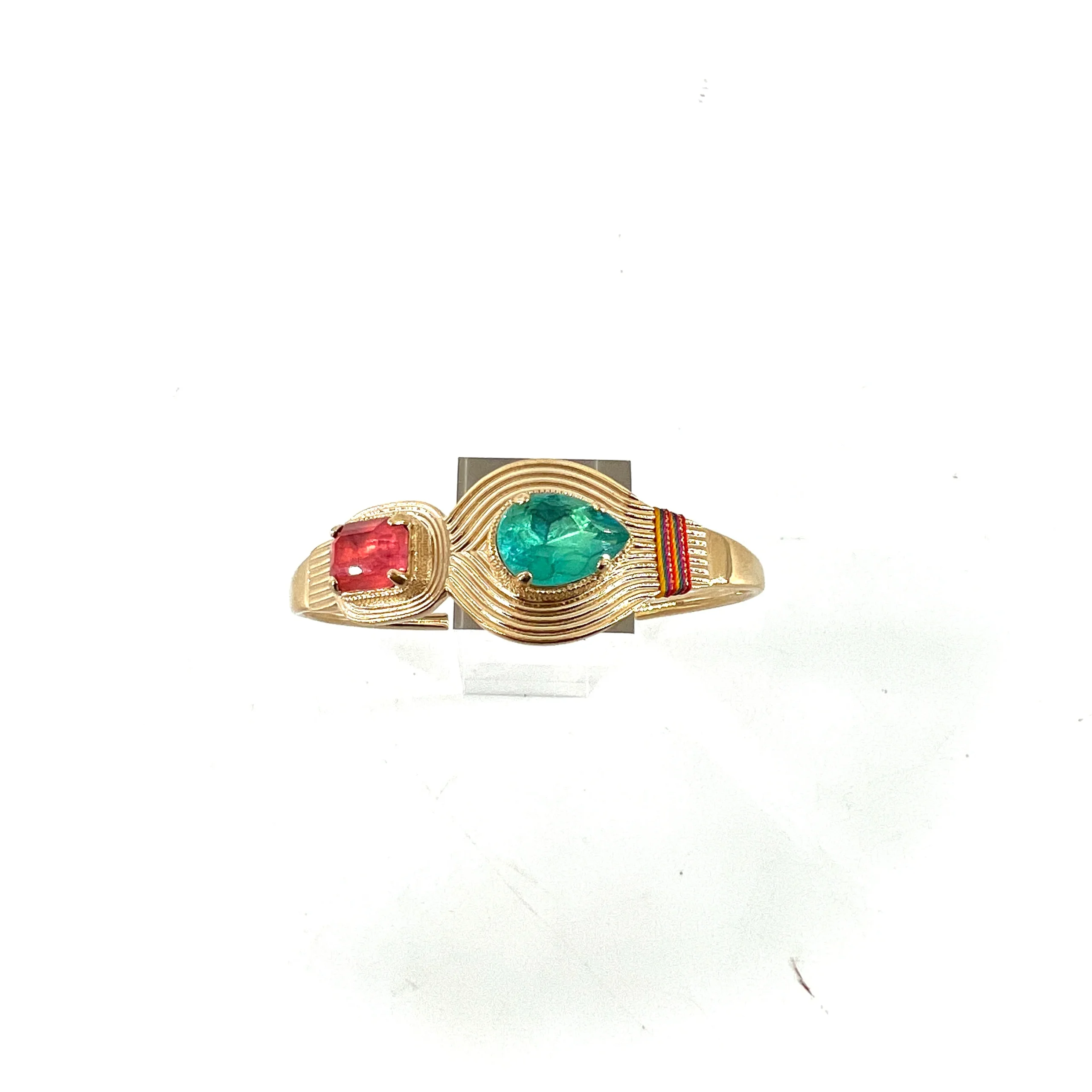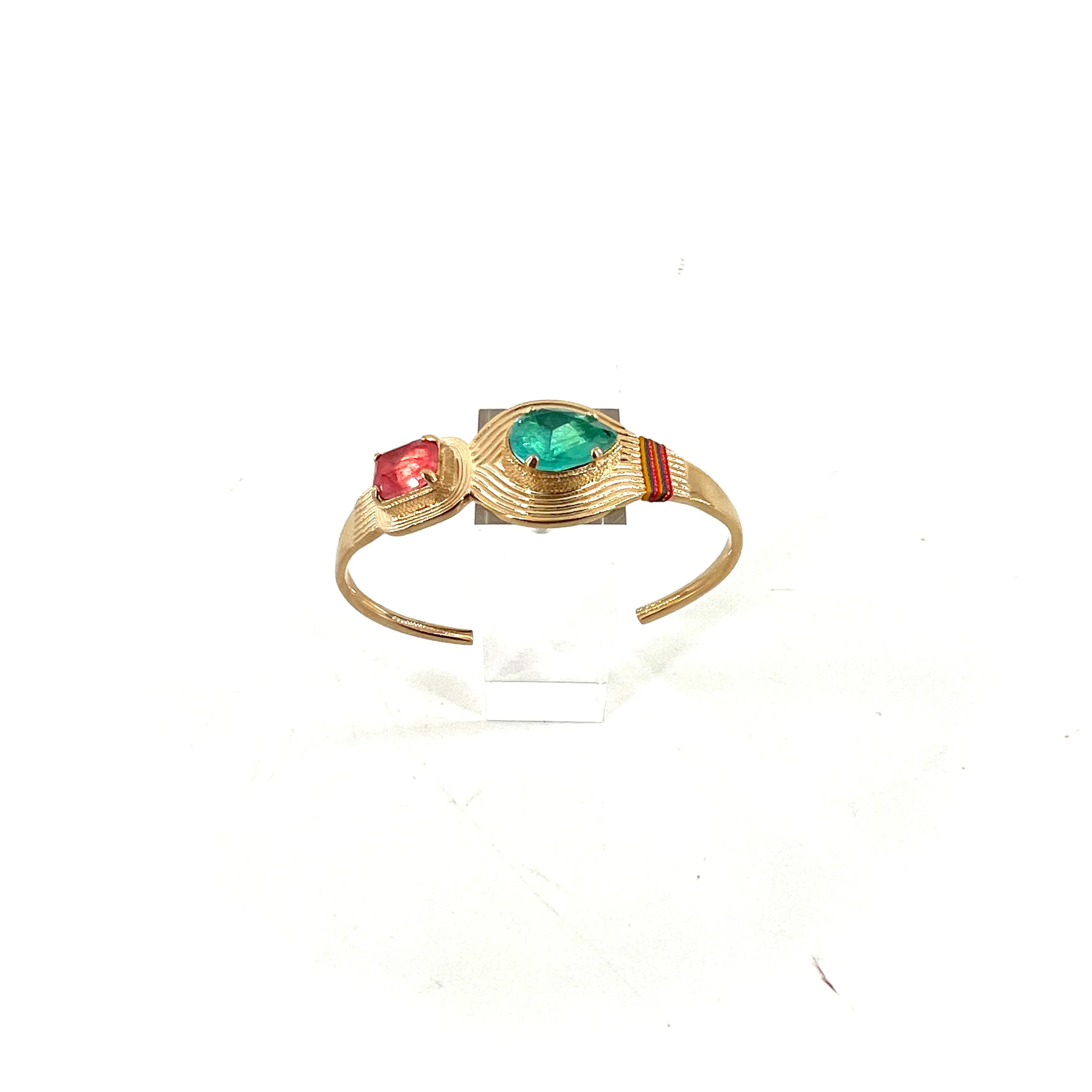 Ce jonc, en métal doré à l’Or fin 14 carats, se compose d’un cristal couleur turquoise taillé en poire, associé à un cristal rose taillé en coussin, le tout orné de fils de soie colorés et fils métallisés.