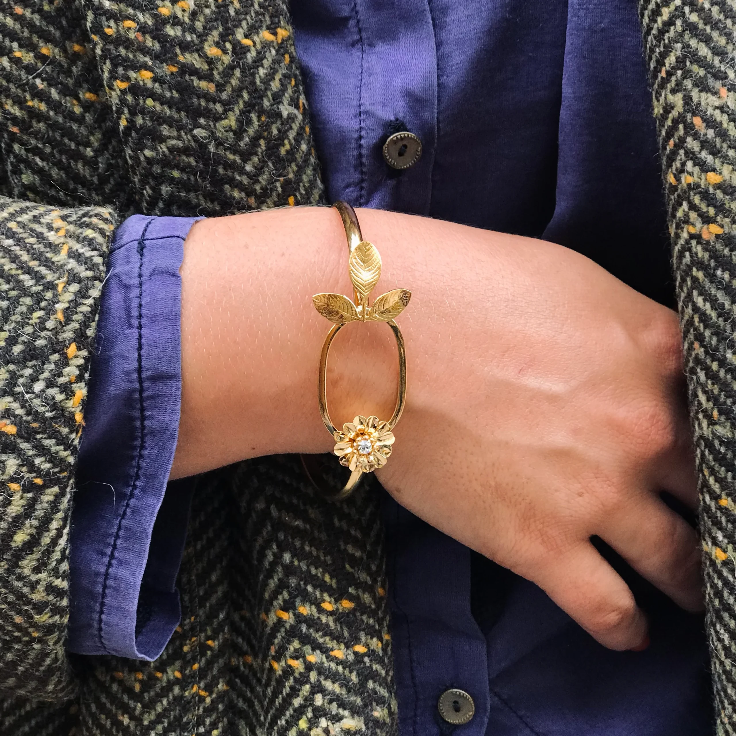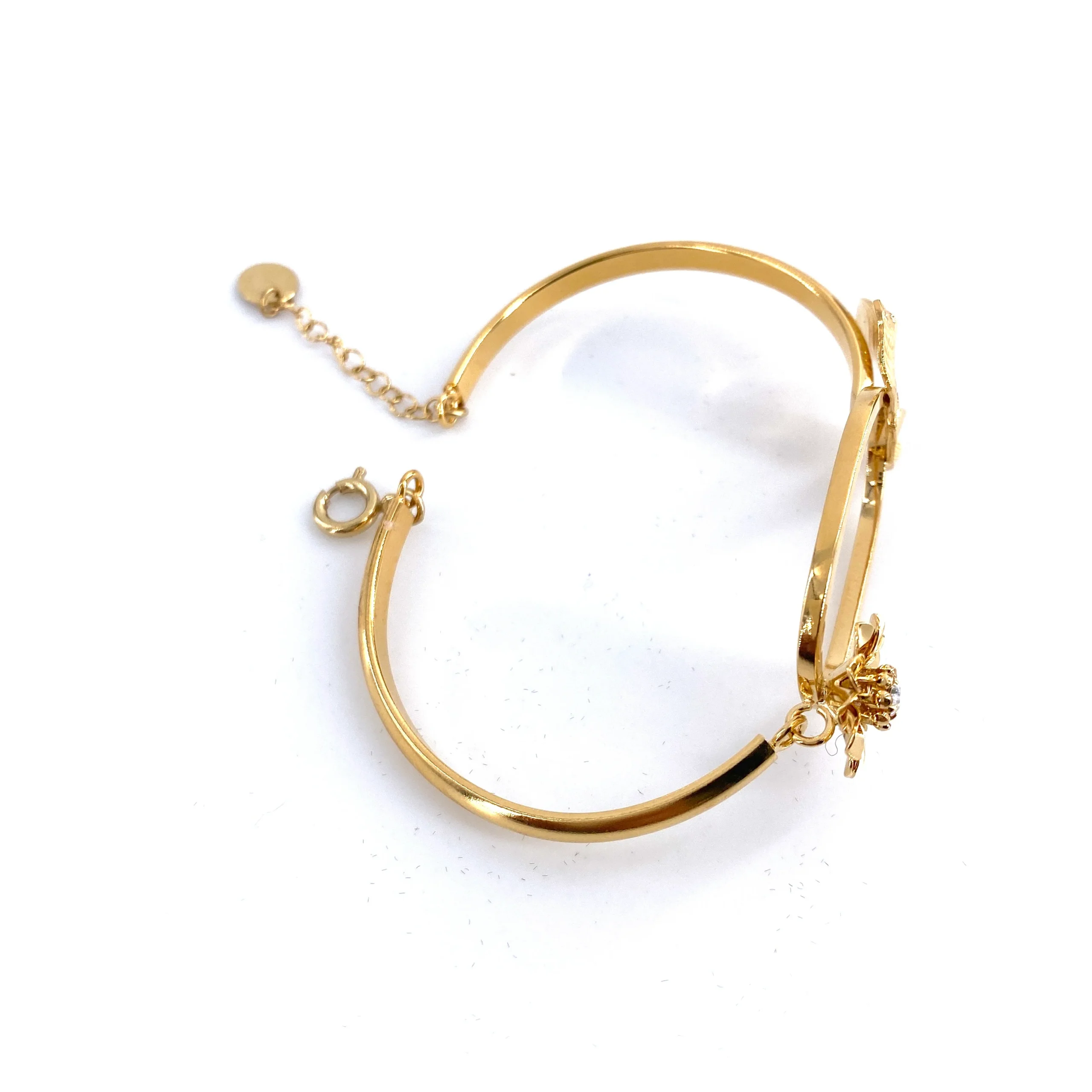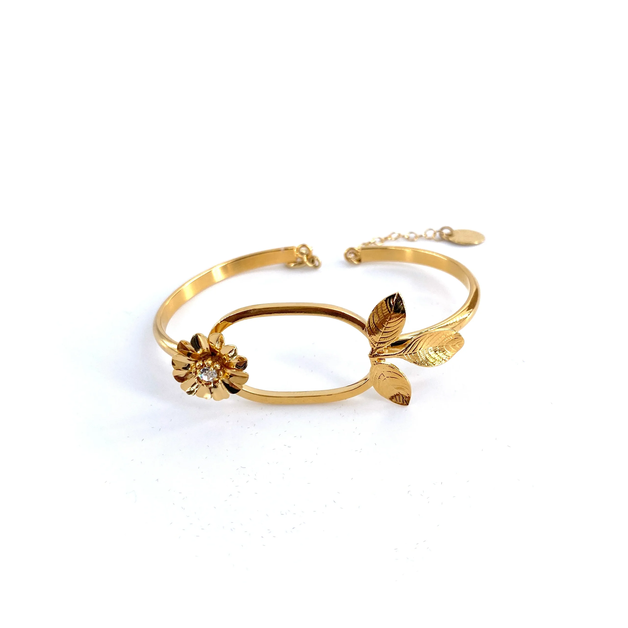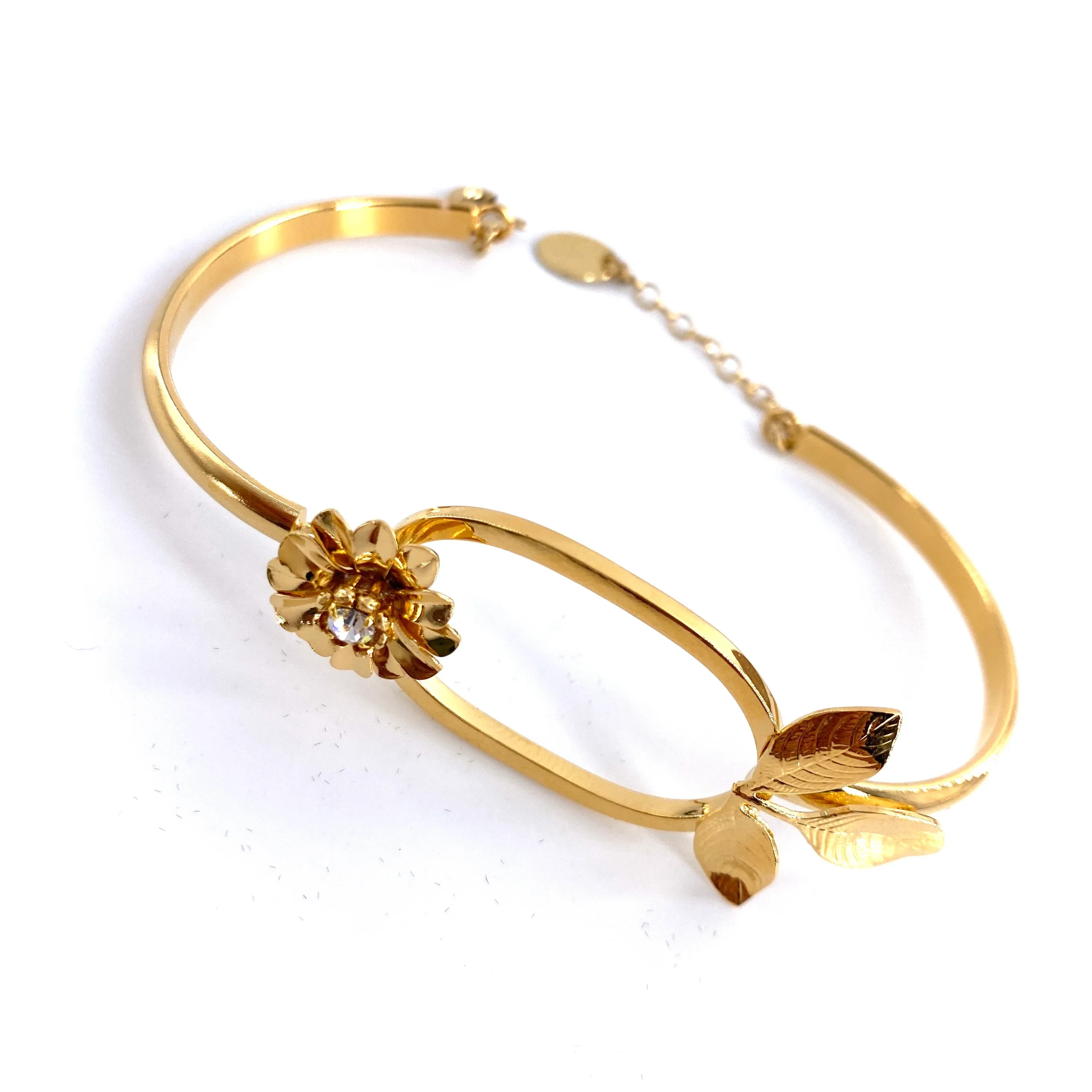 Ce jonc, dorĆ© Ć l’Or 24 carats, est agrĆ©mentĆ© d’un motif floral, et d’une fleur ornĆ©e d’un cristal.