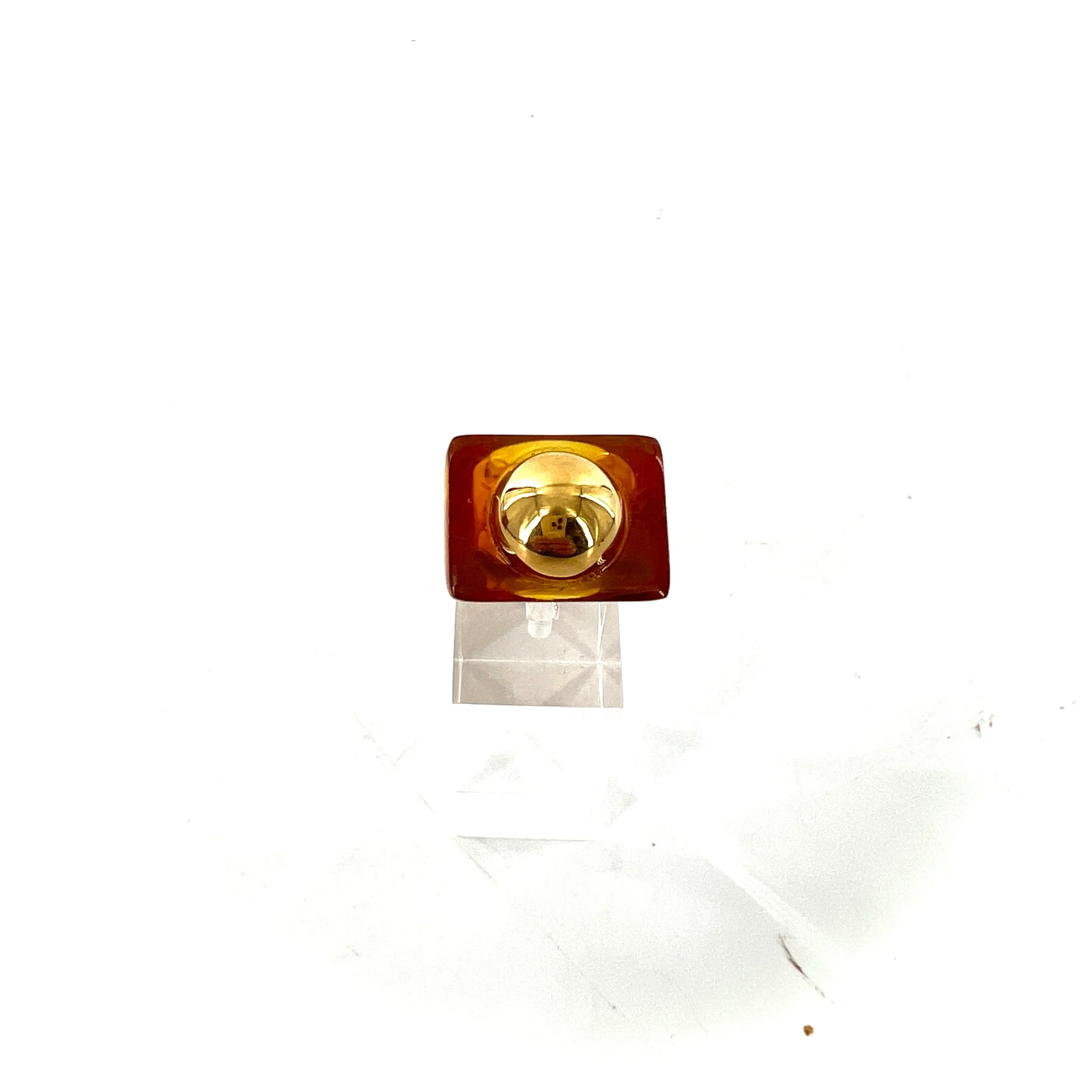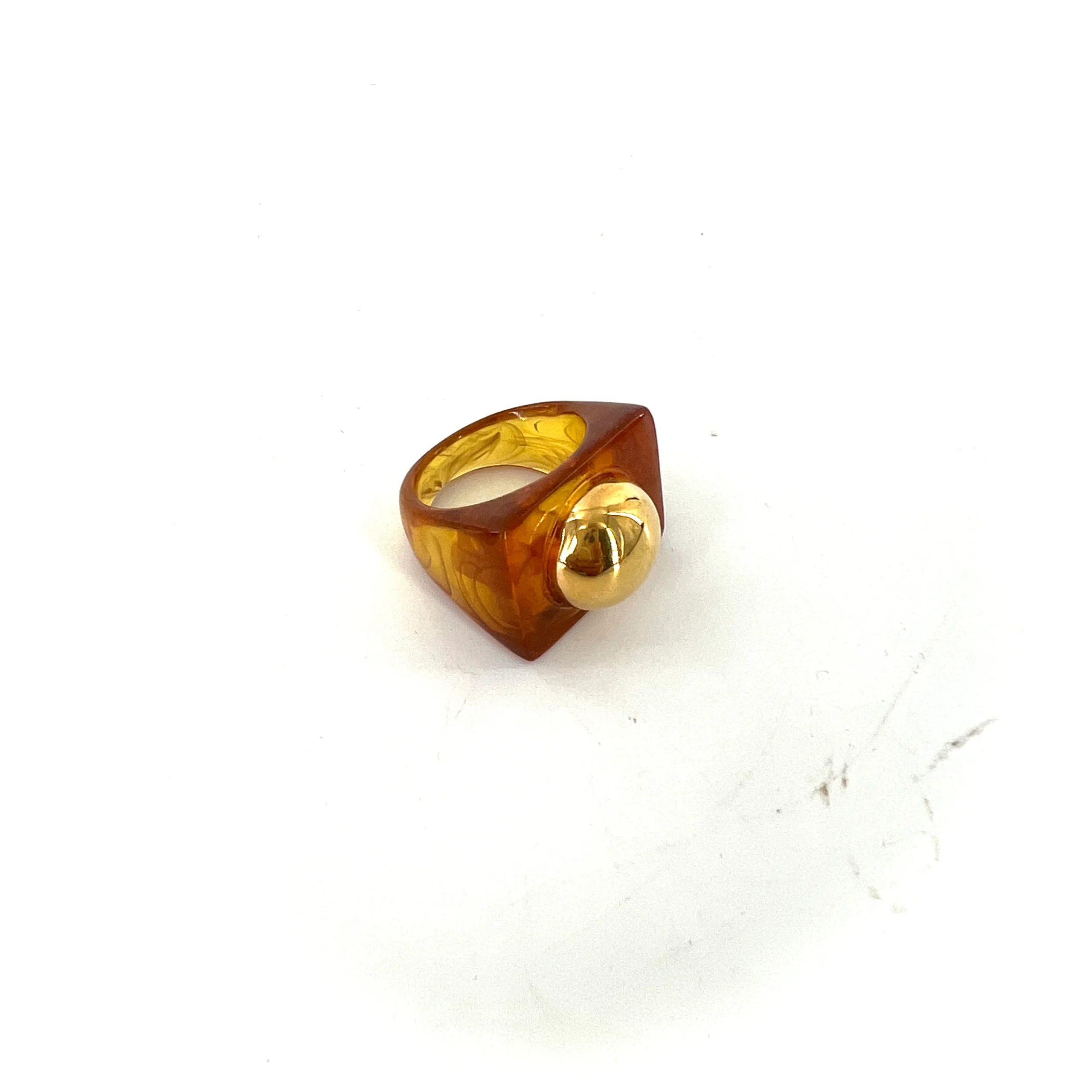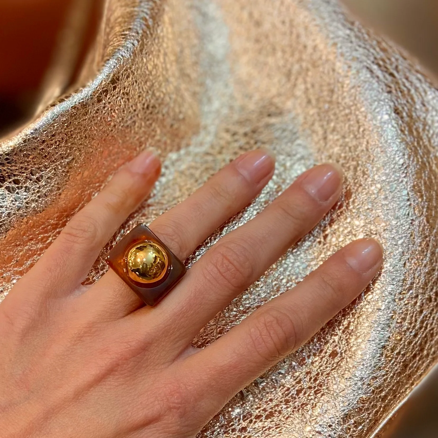 Cette bague, en acétate Tortoise, est agrémentée d’un cabochon doré.