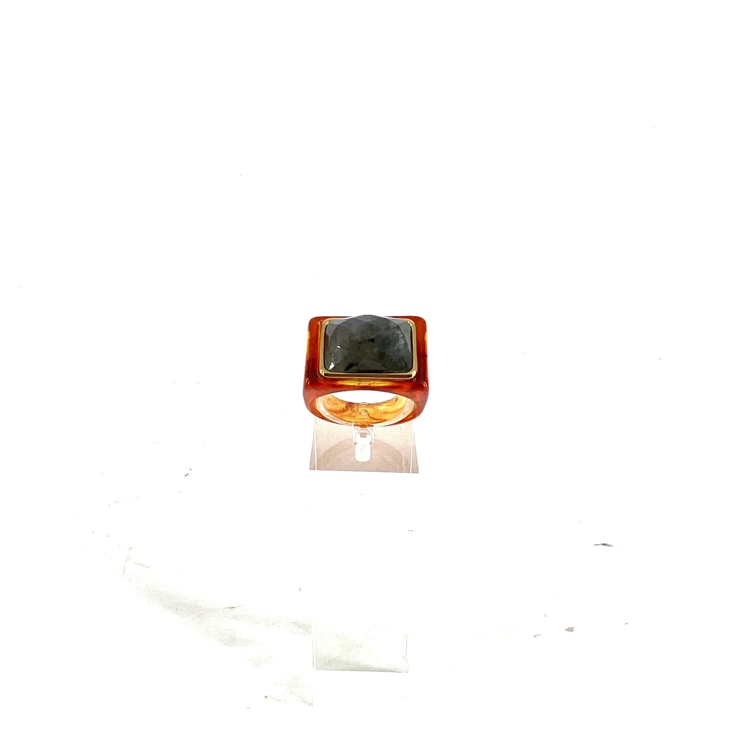Cette bague, en acétate Tortoisee, est agrémentée d’une Labradorite facettée cerclée en plaqué Or.