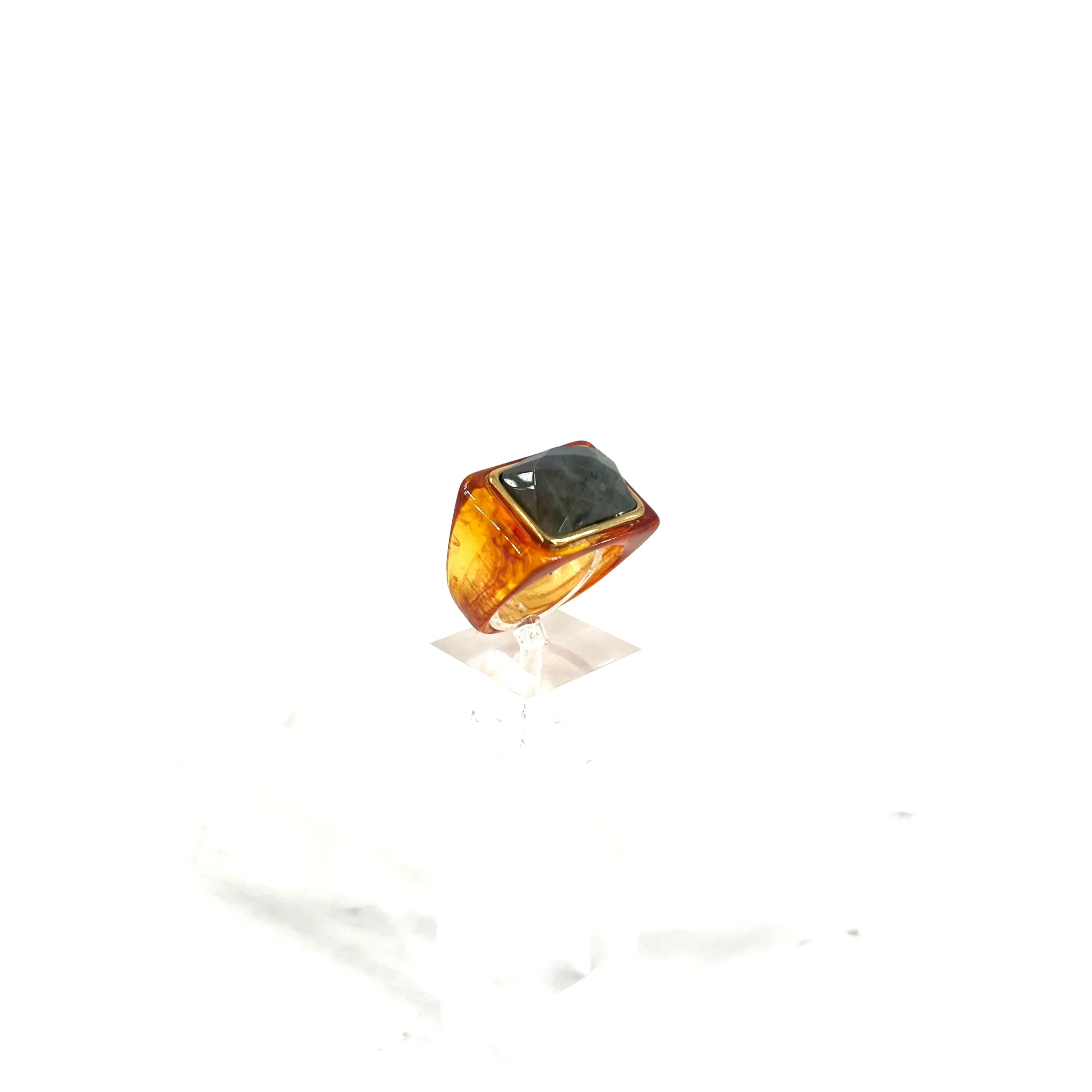Large Bague en Acétate Tortoise et Labradorite Facettée Sertie Plaqué Or