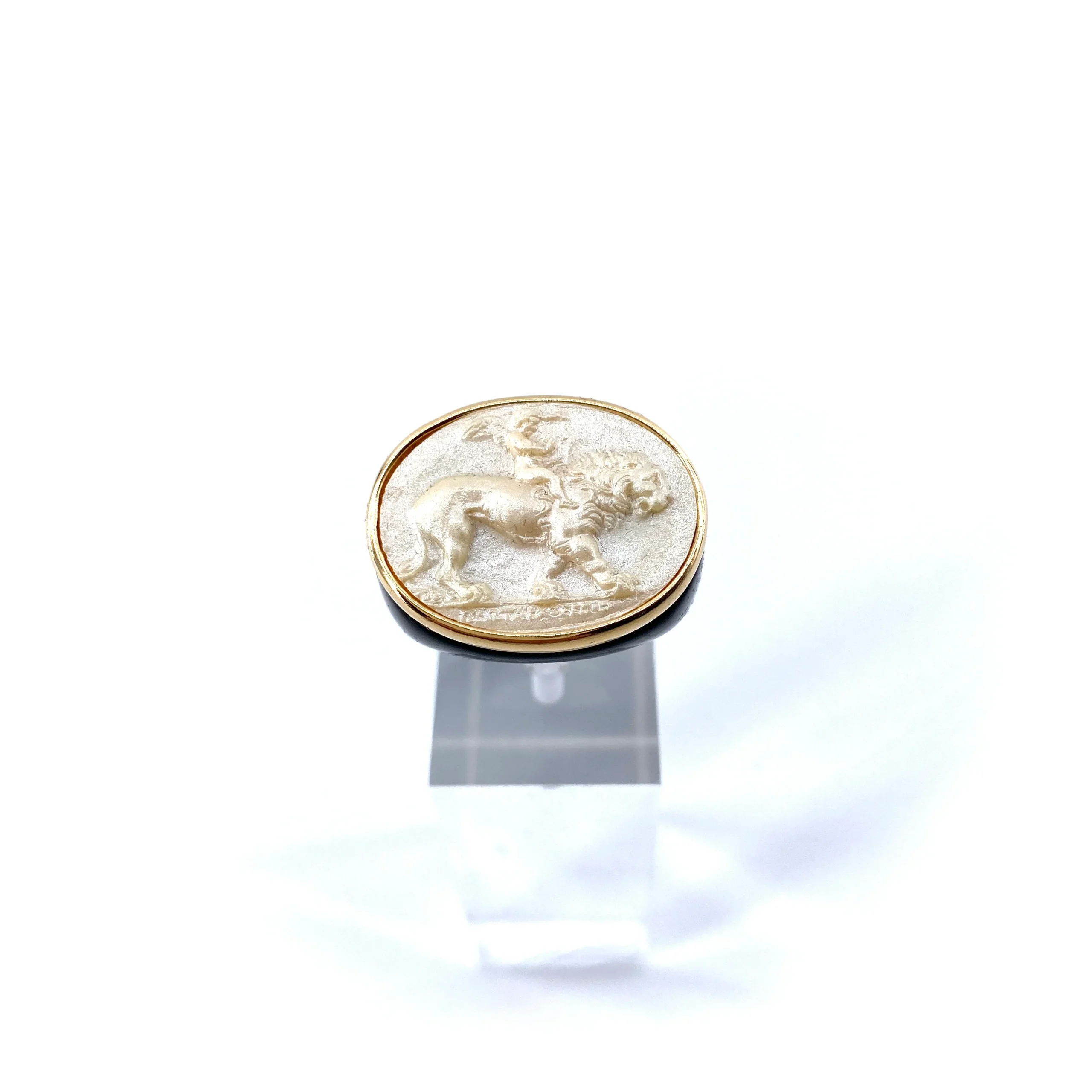 Large Bague en Plexiglas Noir et Résine Champagne Motif Lion