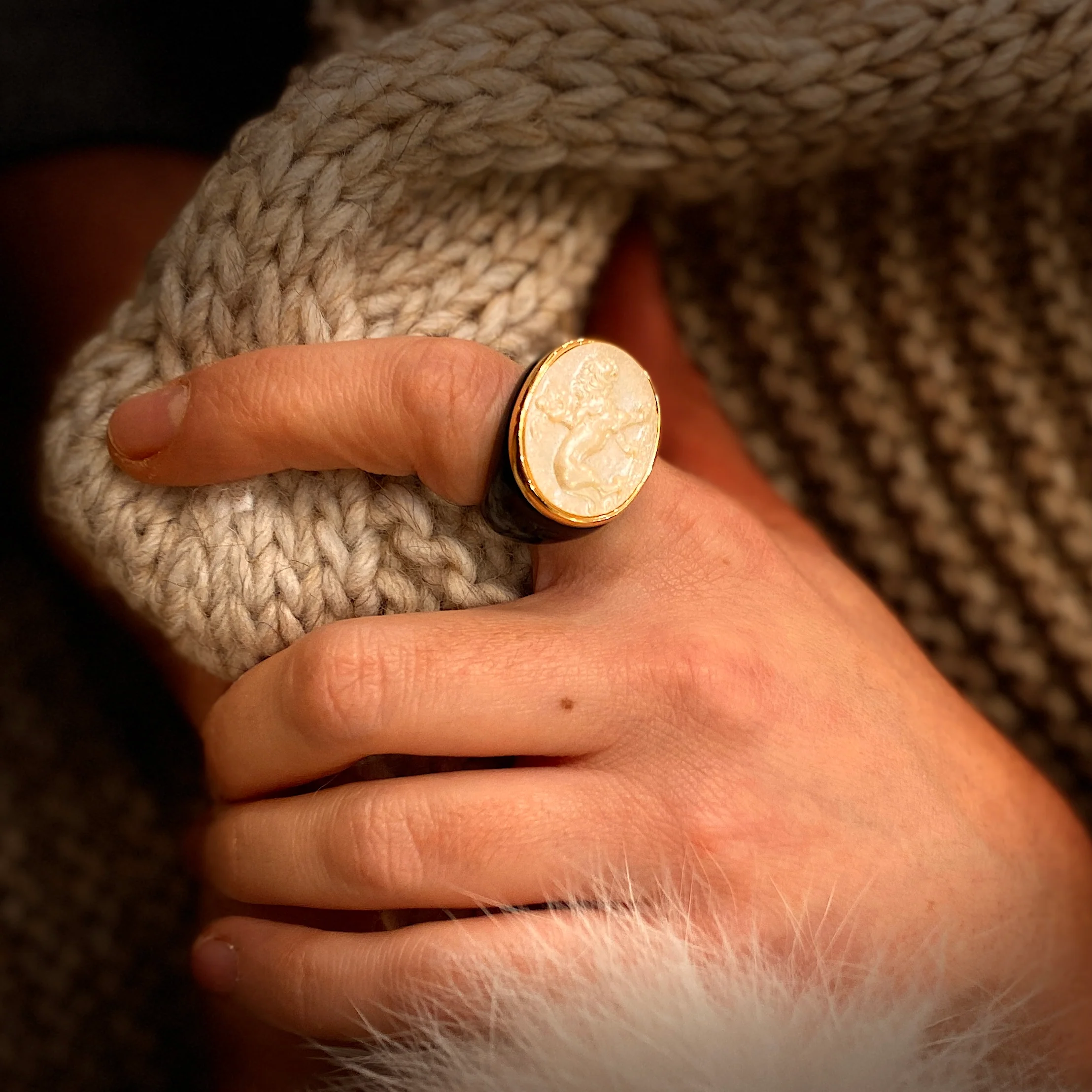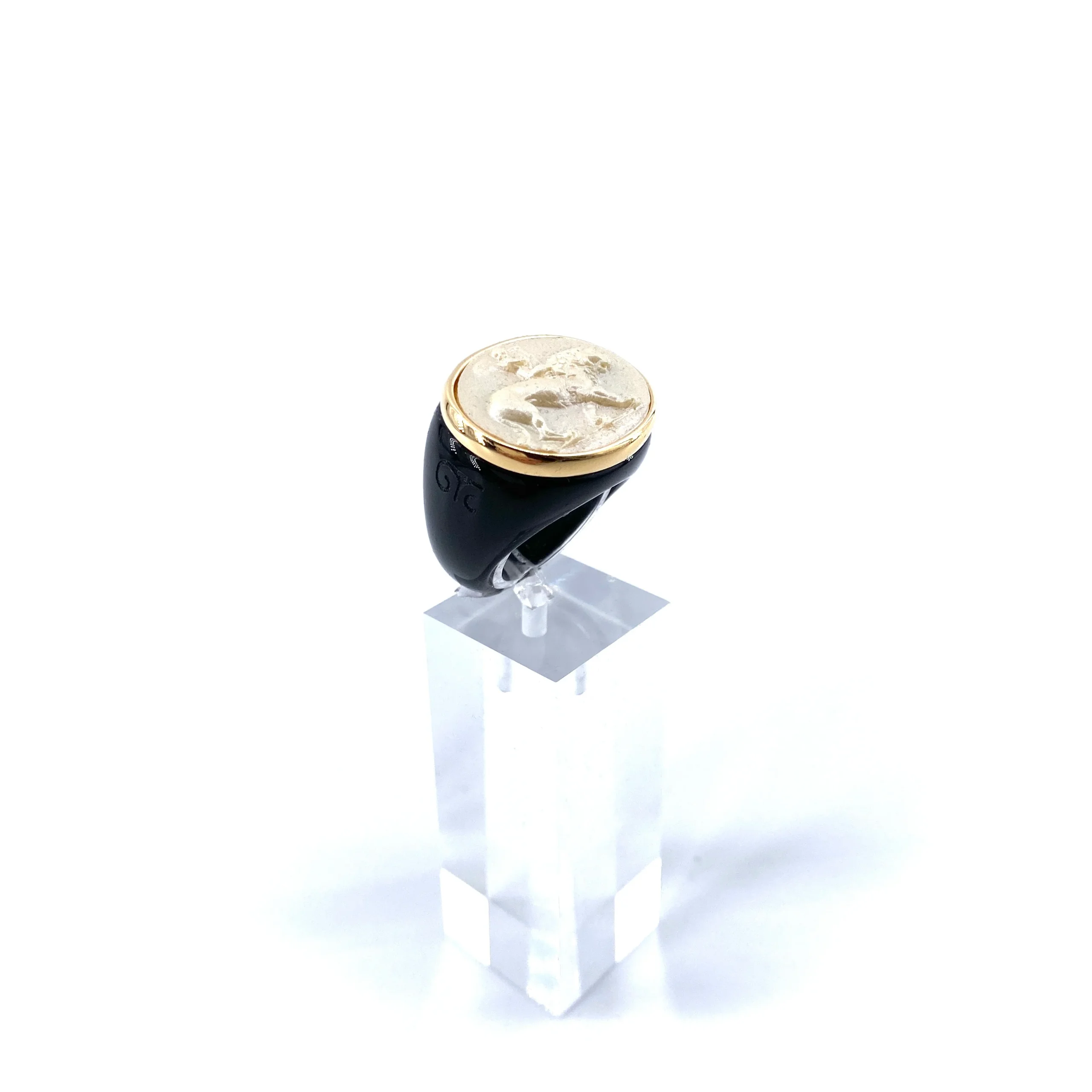 Cette bague en pléxiglas noir, est ornée d’une plaque en résine, couleur champagne, sertie en plaqué Or.Classique et princière, inattendue et drôle, cette bague existe aussi en résine verte.Dimensions motif: 2.5cm x 2cmPlaqué Or 18 carats.Fabriquée à la main en Italie.