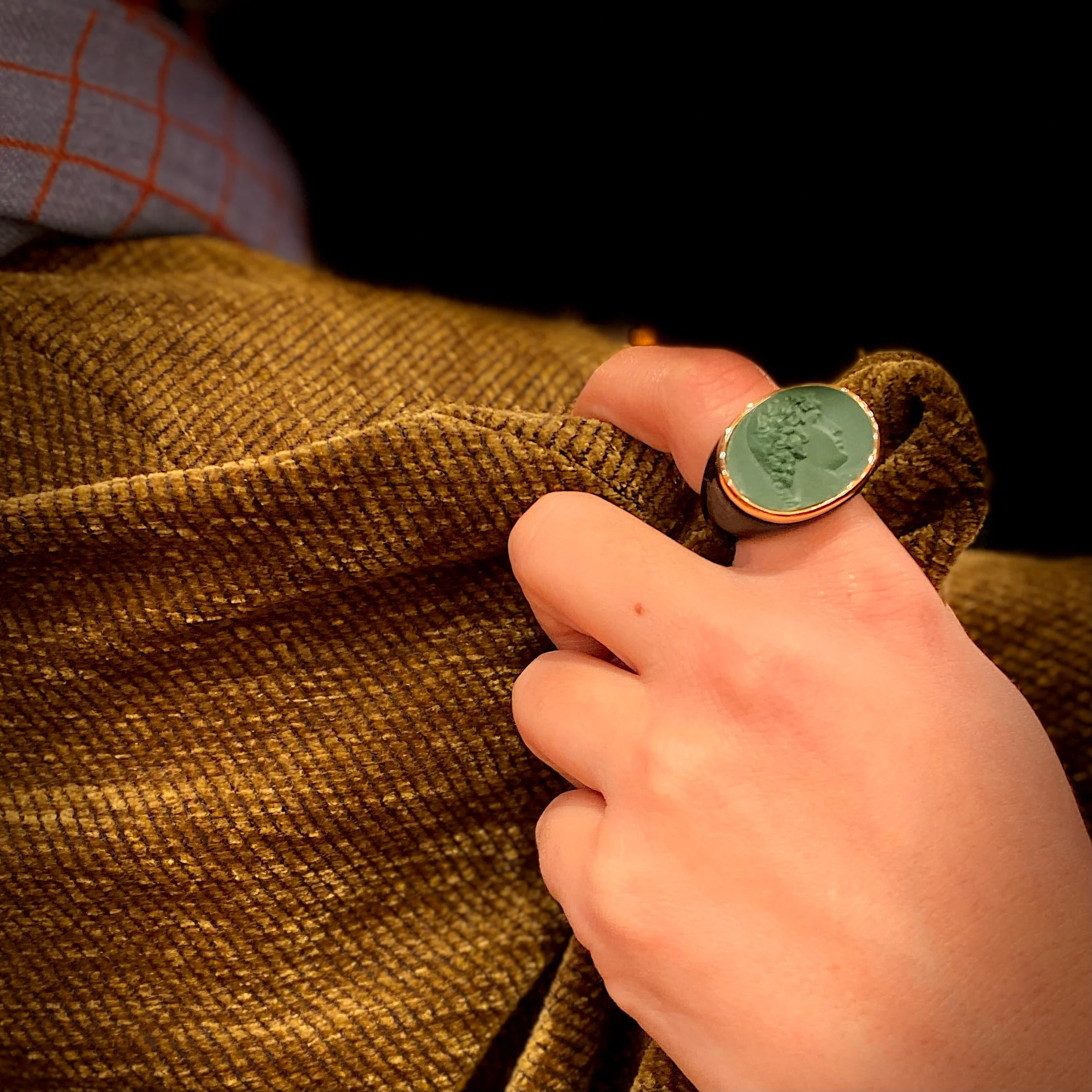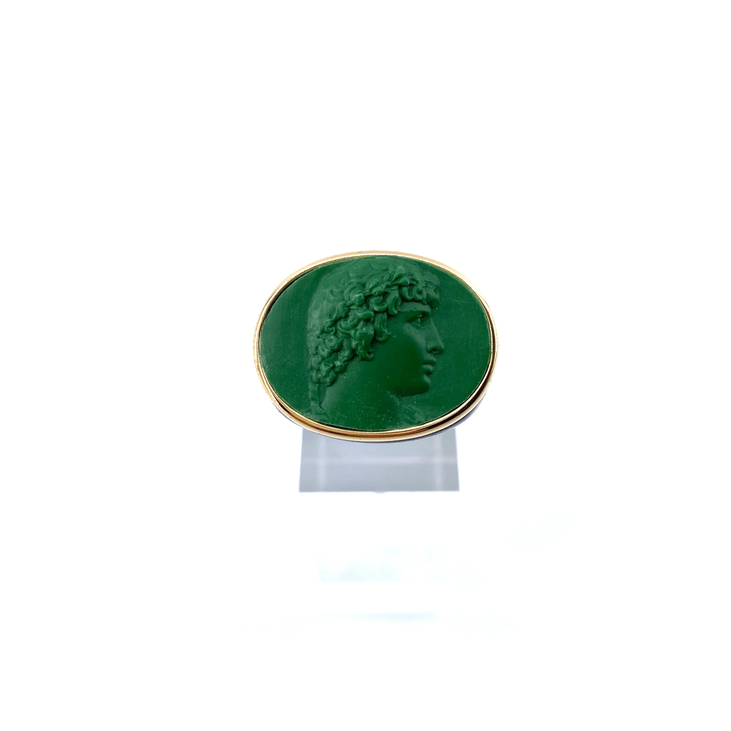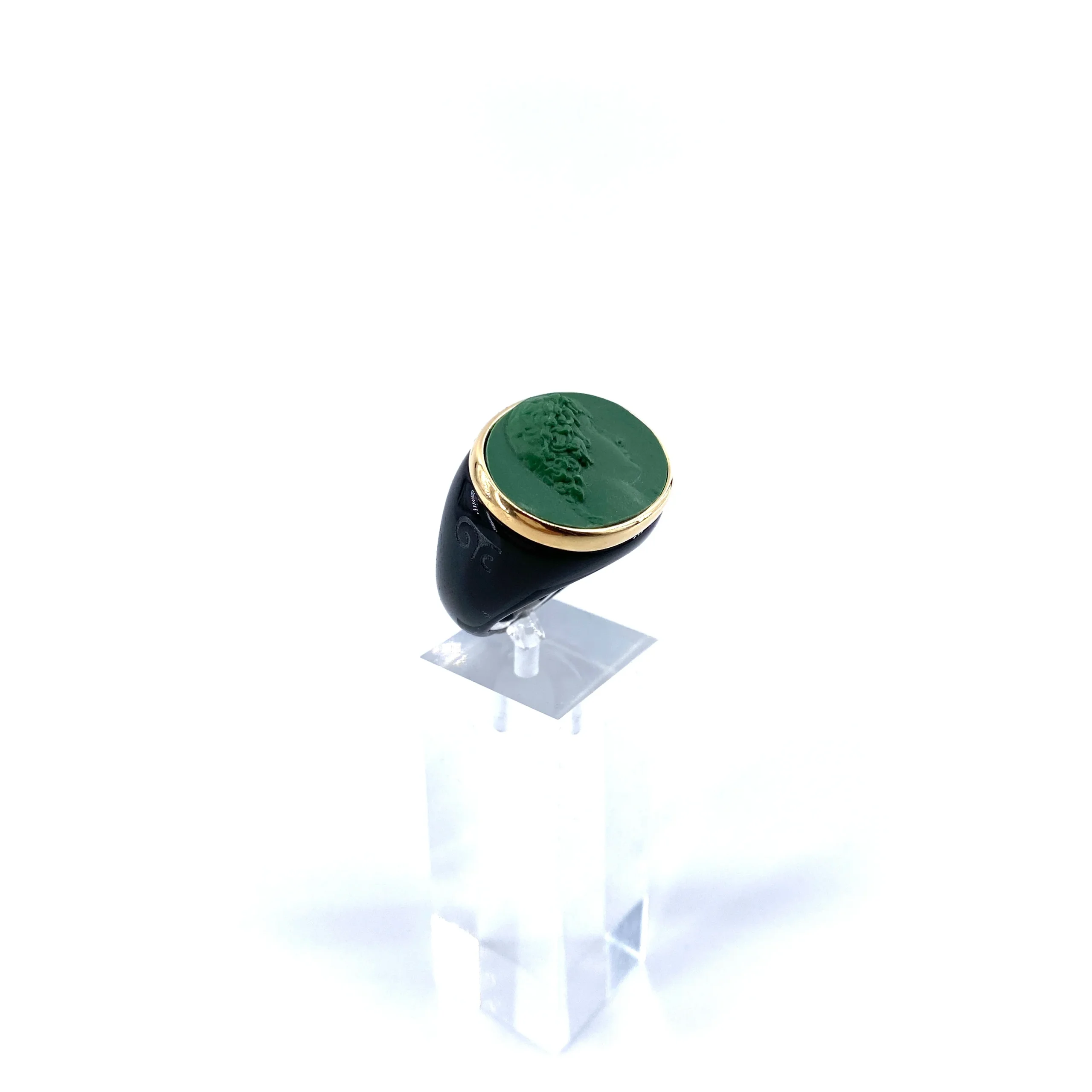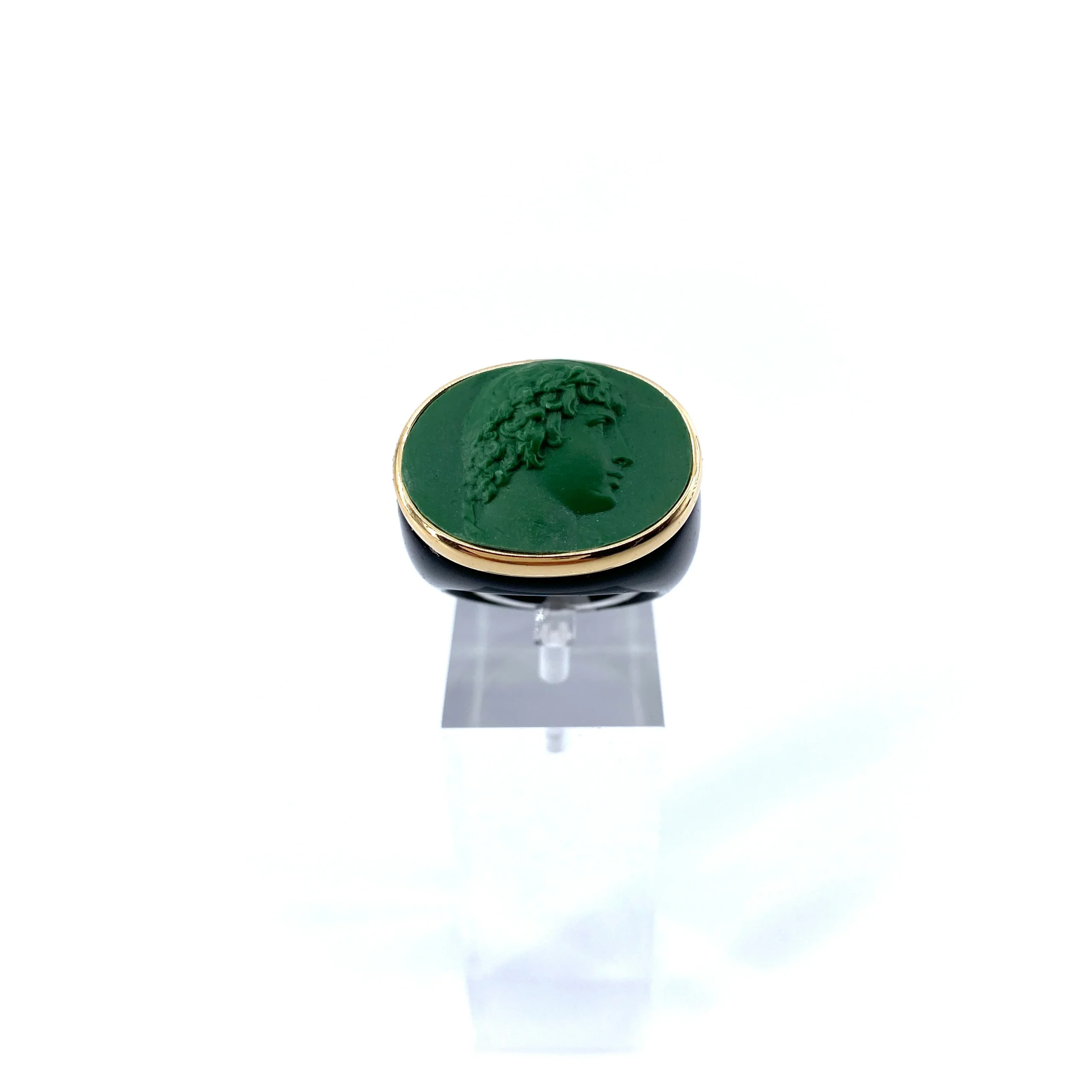 Large Bague en Plexiglas Noir et Résine Verte Motif Statue Grecque