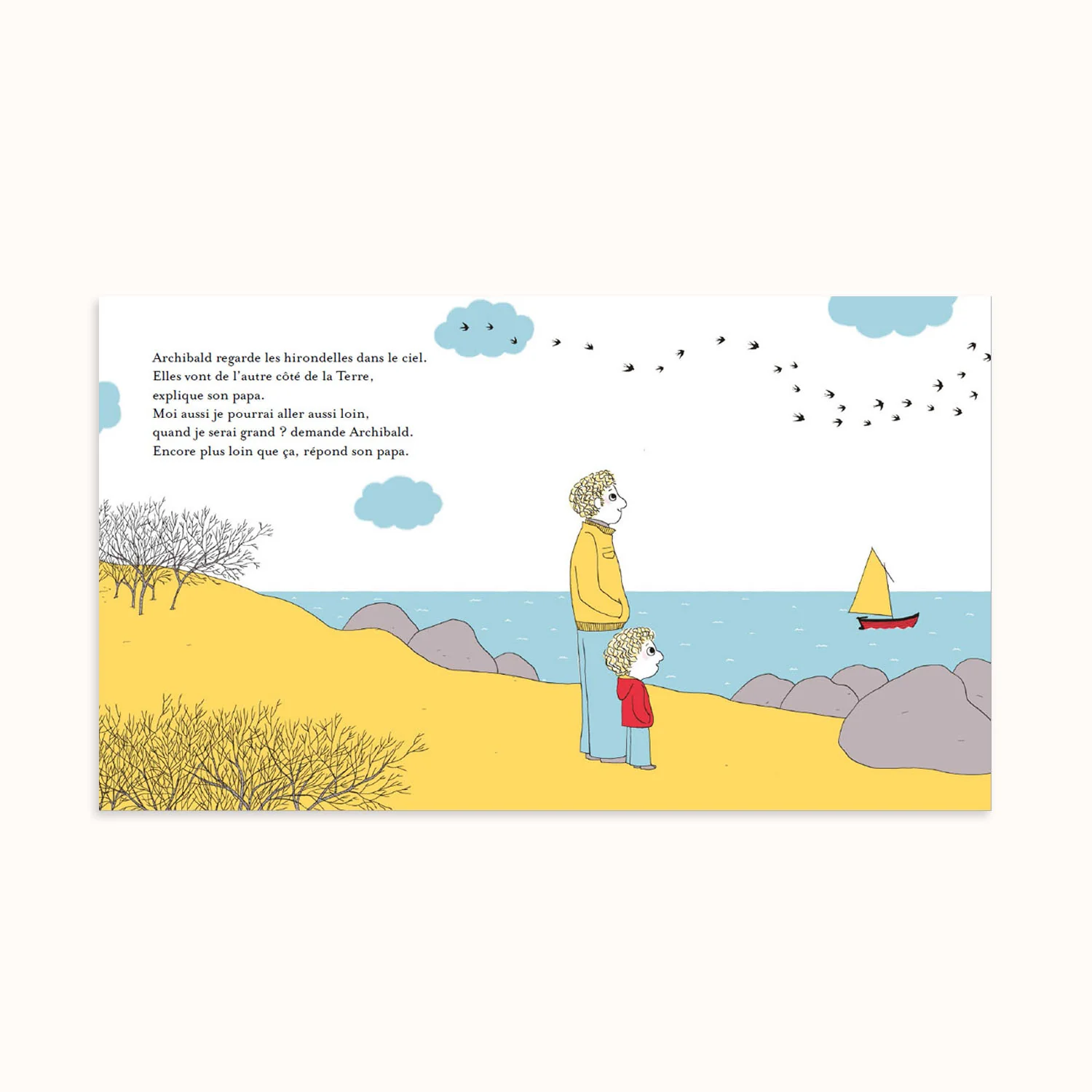 Archibald et son papa regardent les hirondelles partir de l’autre côté de la terre : « Moi aussi je pourrai aller aussi loin, quand je serai grand ? demande Archibald. Encore plus loin que ça, répond son papa. »