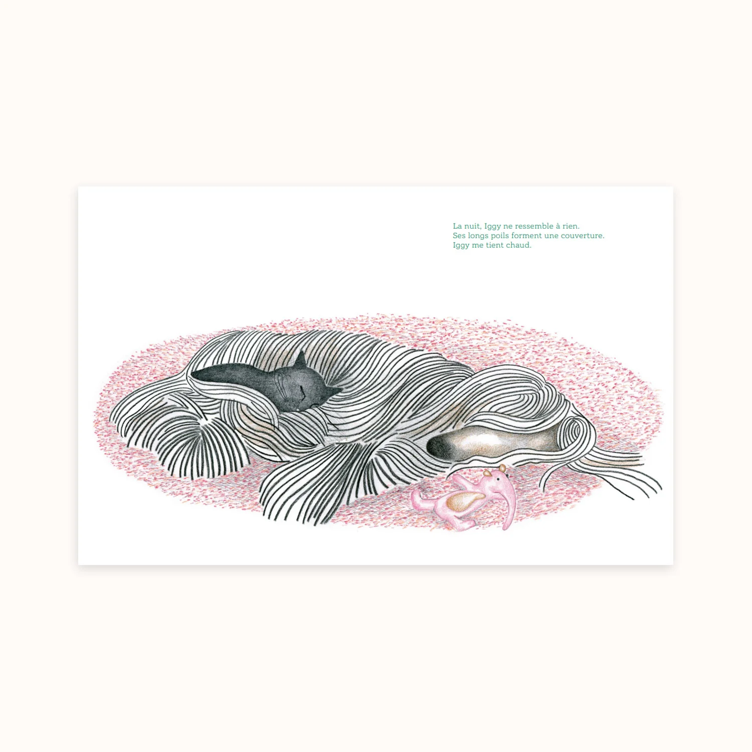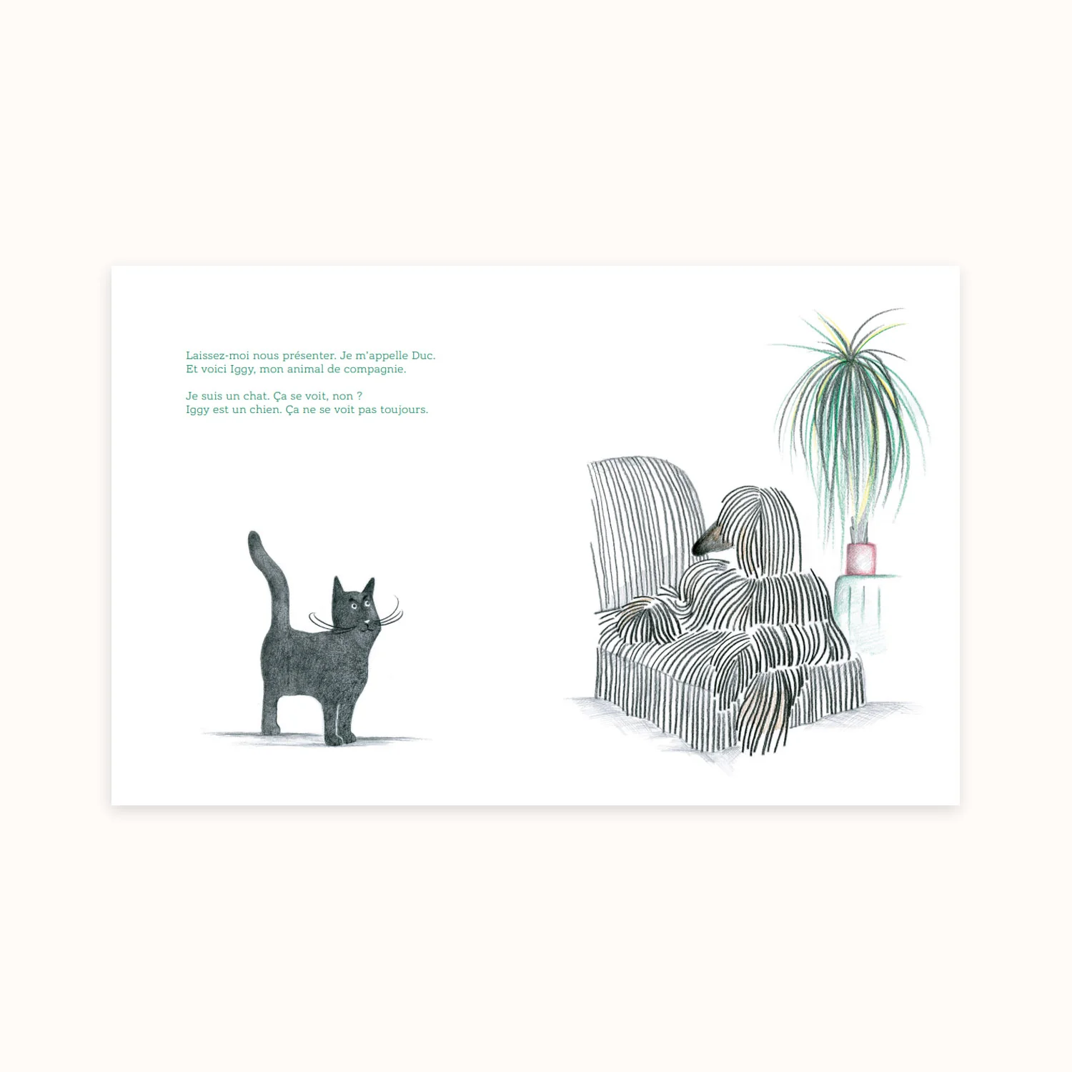 Le texte d’Alex Cousseau est comme toujours parfait. Mais cette fois, il l’a écrit pour que Janik Coat puisse renouer avec le dessin au crayon et s’amuser comme une folle avec ce grand échalas aux longues rayures (nous parlons d’Iggy, pas d’Alex Cousseau