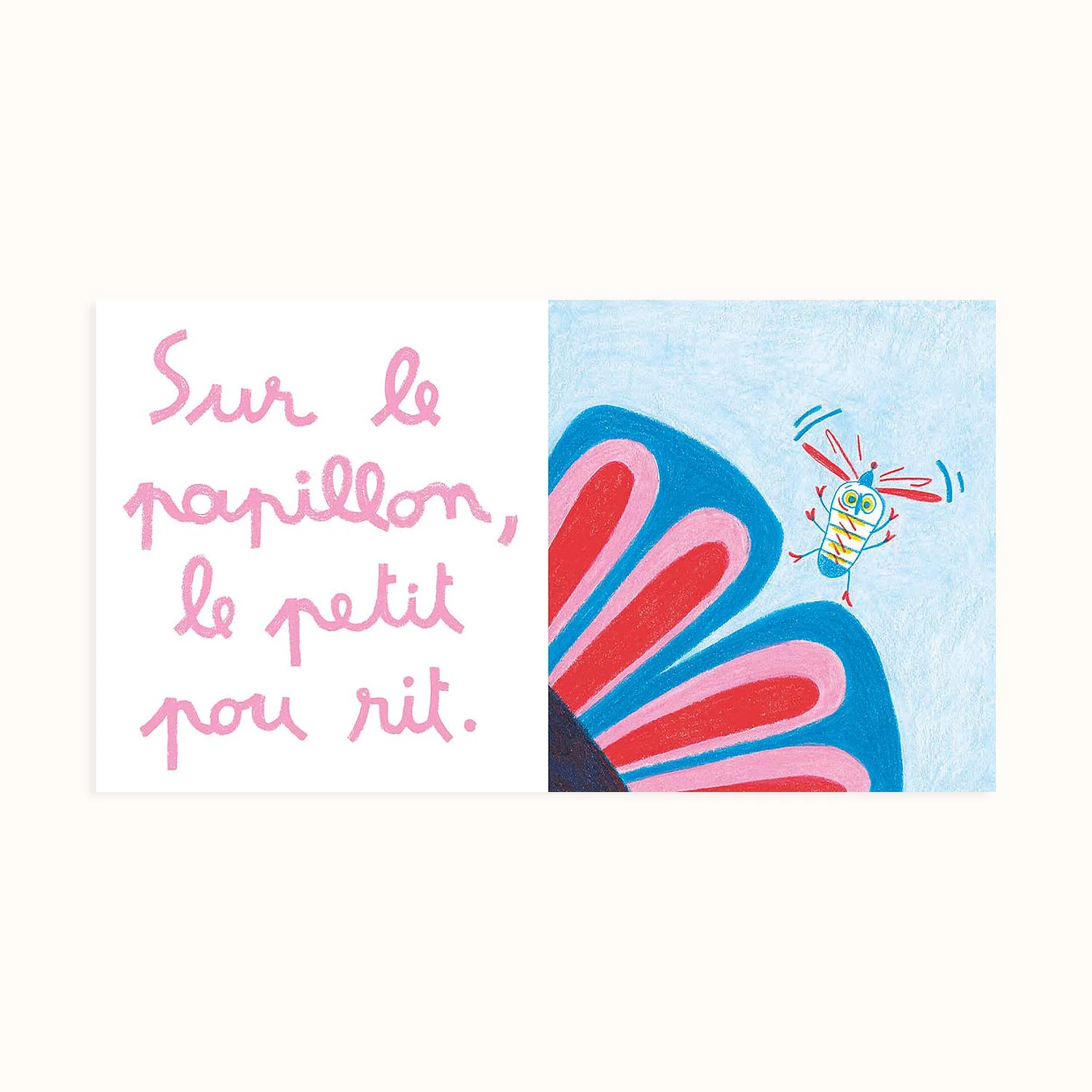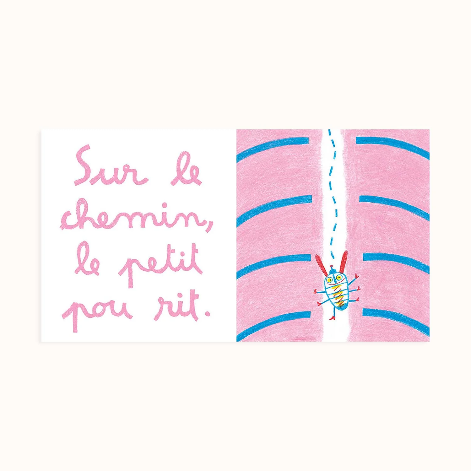 Mathis et Aurore Petit mettent en scène un petit pou intrépide et fort vif… On suit ses pérégrinations, et les tout-petits peuvent se délecter de la répétition des jeux de mots. L’air de rien, chaque image a une double lecture, et ce n’est qu’à la fin de l’album qu’est dévoilée la réalité… Sur le chemin, le petit pou rit. Sur le gâteau, le petit pou rit. Sur l’oeuf, le petit pou rit. Sur le papillon, le petit pou rit…