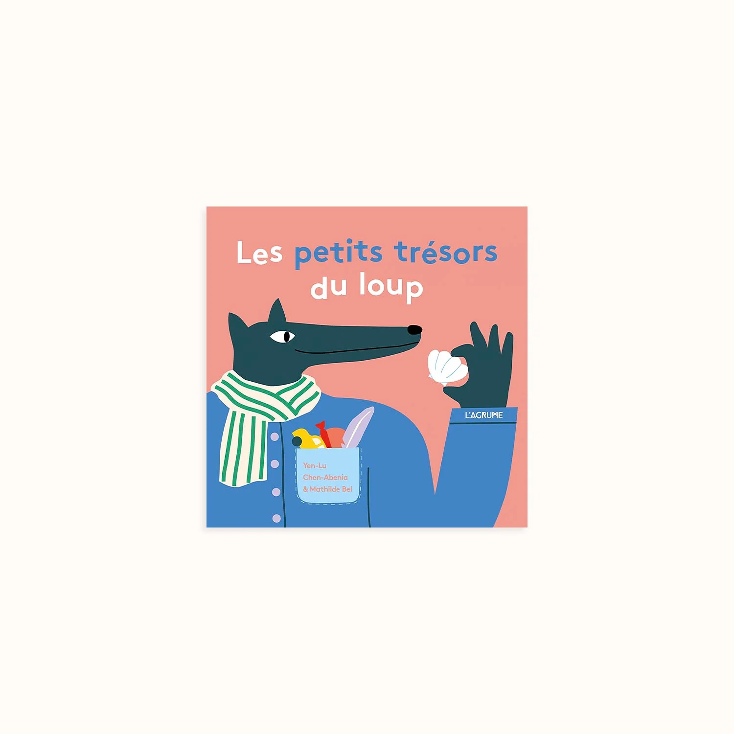 Loup adore glisser dans sa poche toutes les petites choses qu’il trouve ici et là. Ce sont ses petits trésors secrets. À l’école, il ramasse un lacet, sur la plage un coquillage, au parc des cailloux, dans la forêt une pomme de pin, sur le balcon une plume… Et quand sa poche est remplie, il aime admirer tous ses trésors. Un livre aux éditions L’Agrume.