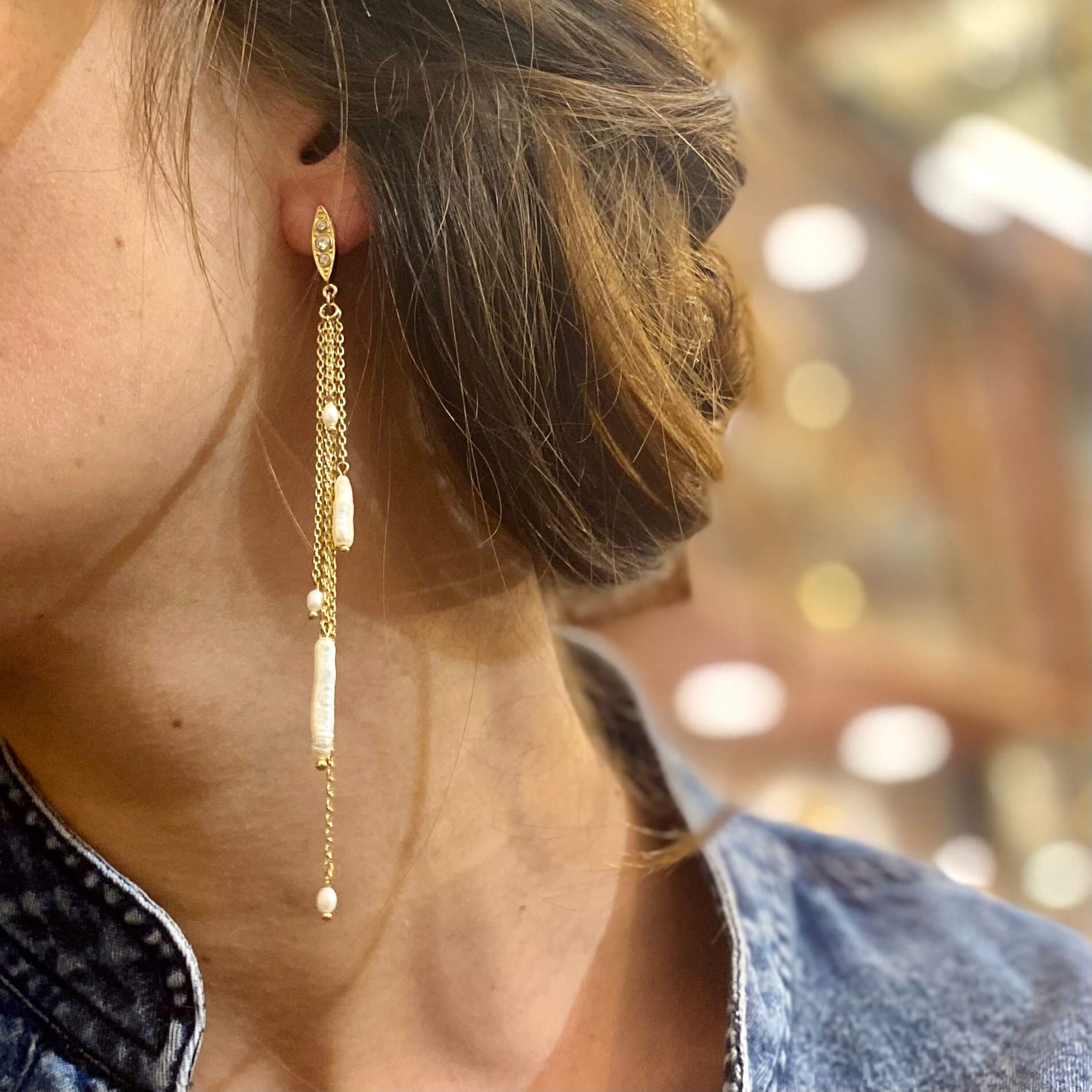 Montées sur une Puce sertie de trois Cristaux Gris, ces longues boucles sont à la fois élégantes et féminines. On aime : la mobilité, la fluidité. À porter cool en tee-shirt et en jean, ou pour sublimer un jour de fête ! Longueur totale de la boucle : 11cm Laiton Plaqué Or 24 Carats (0.5 […]