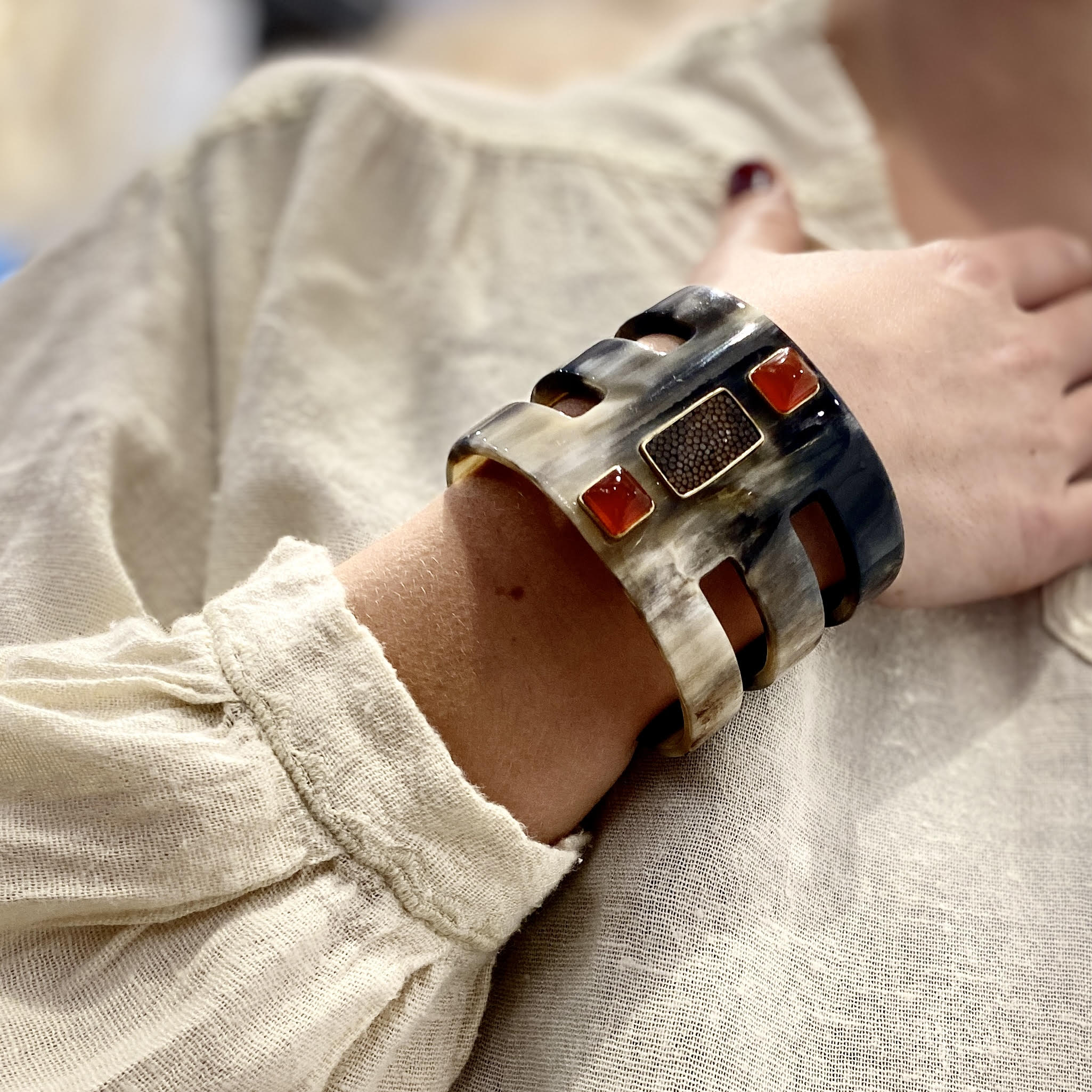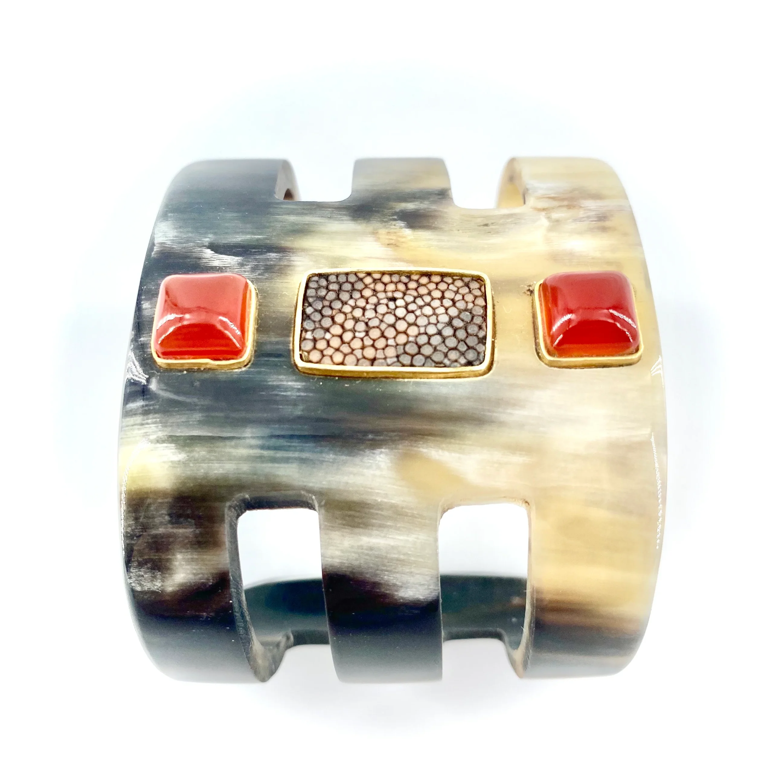 Manchette, ajourée en corne, ornée de deux Cornalines cabochon et de galuchat.