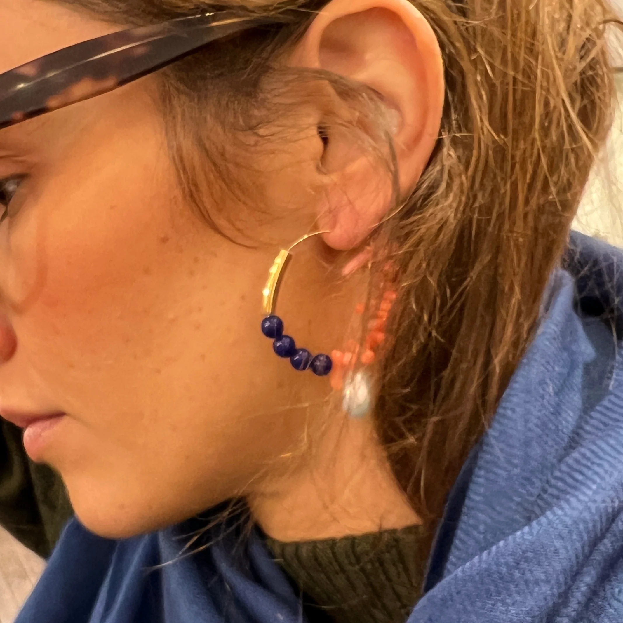 Ces créoles en Plaqué Or, sont ornées de perles de rivière, de perles de verre bleue et de corail. Des perles généreuses, colorées, et raffinées pour une boucle estivale et élégante. Existe aussi en améthyste et en jaspe. Laiton doré à l’Or fin 24 carats.Diamètre: 3.5cmFabriquées à la main, à Paris.