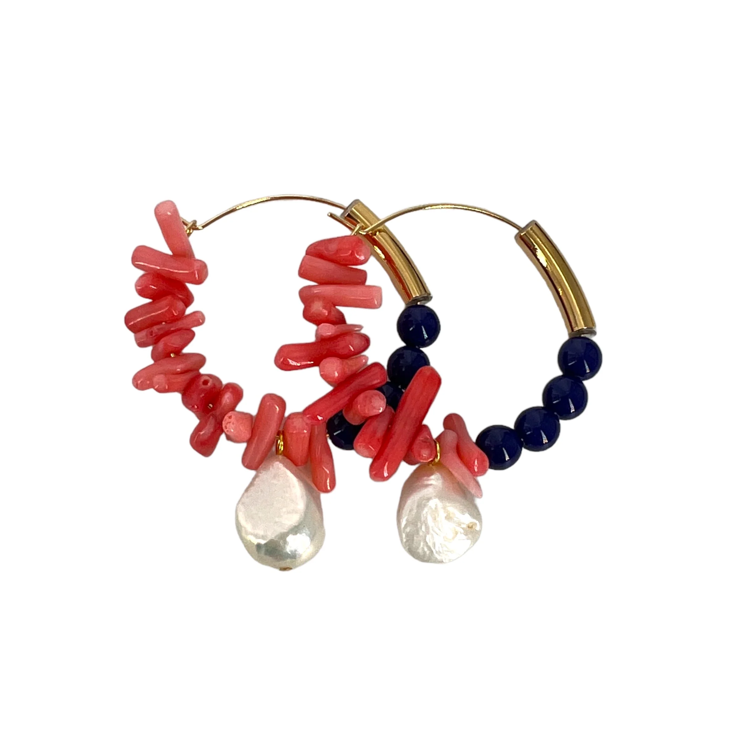 Ces créoles en Plaqué Or, sont ornées de perles de rivière, de perles de verre bleue et de corail.
