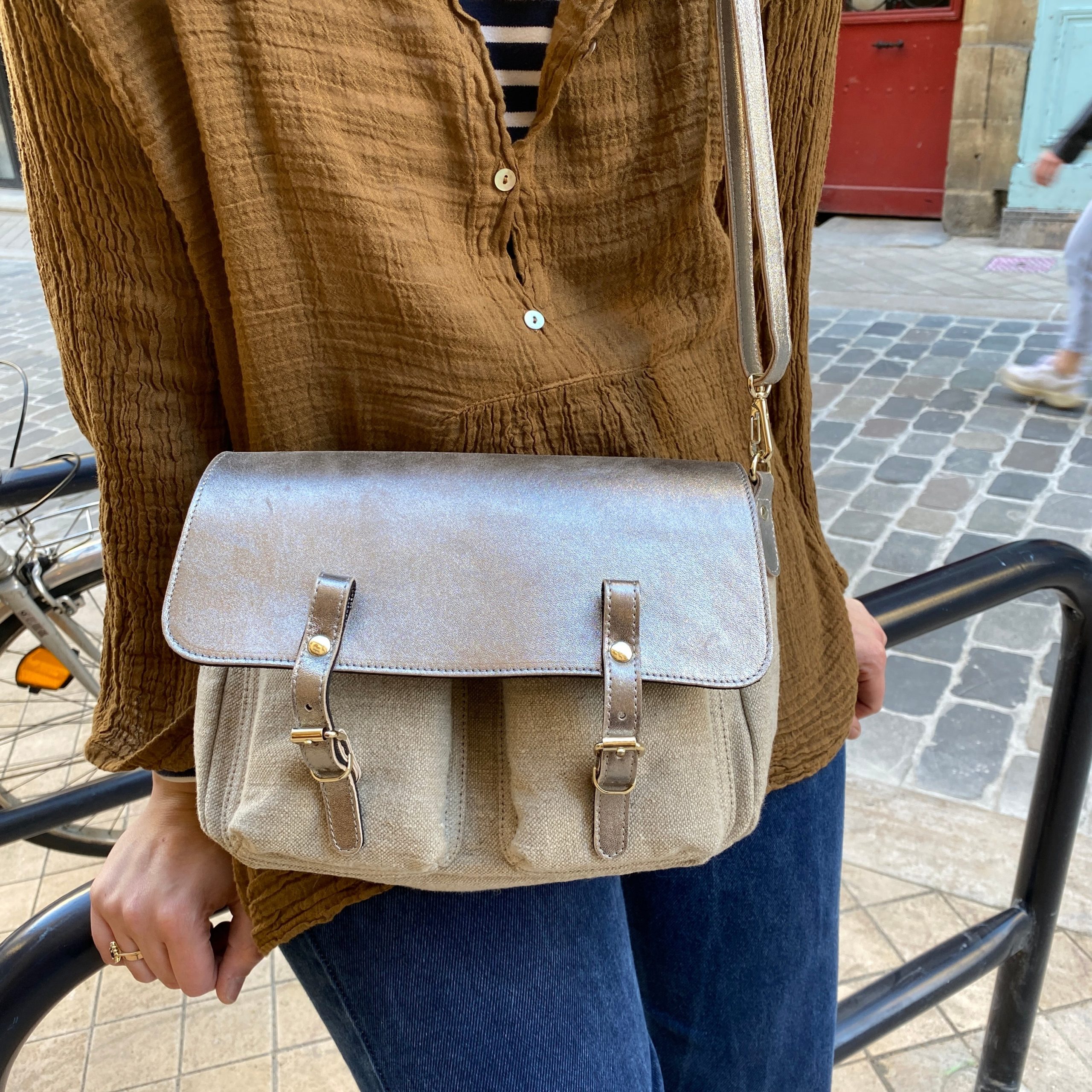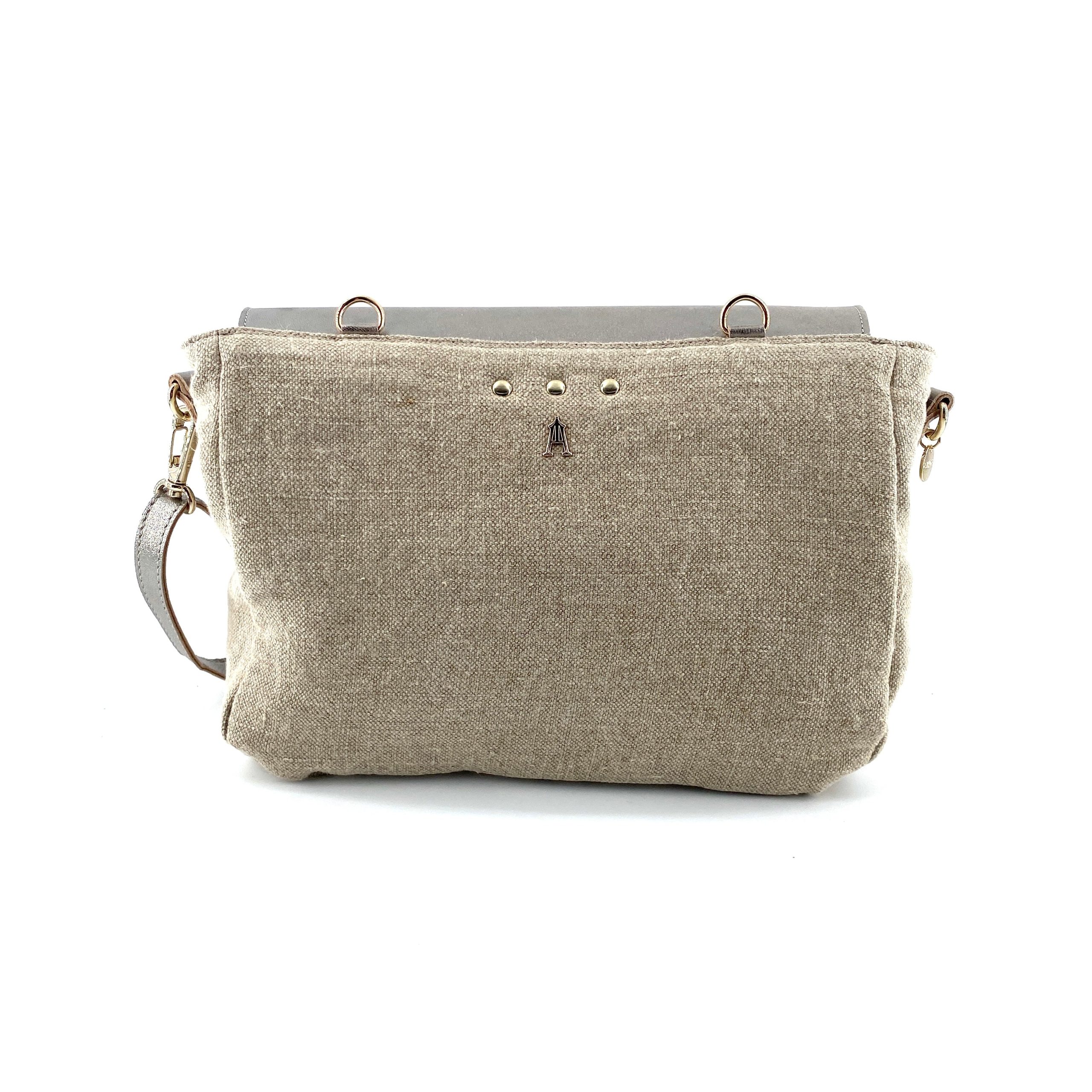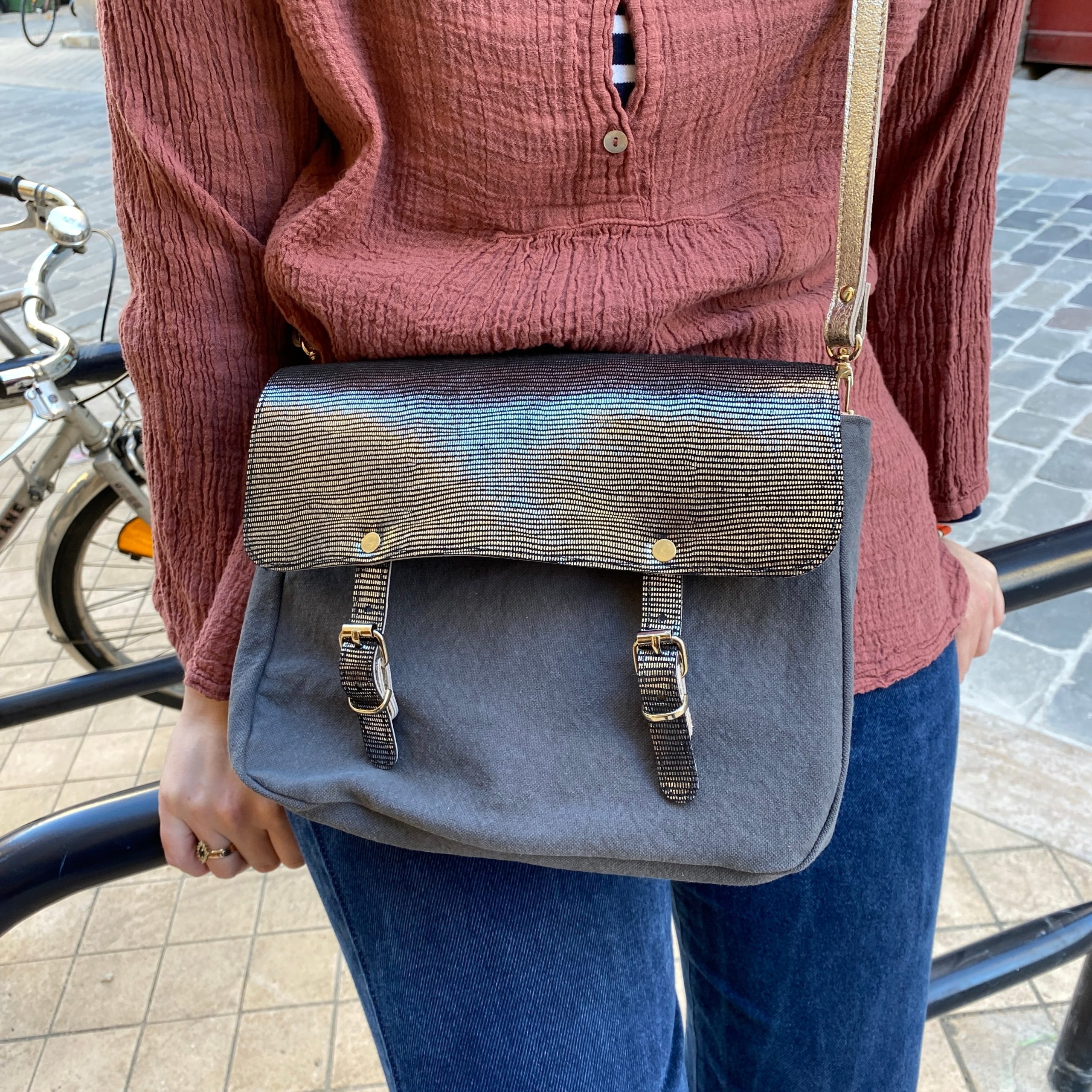 Ici, à l’endroit, le rabat est en cuir d’agneau argenté, le corps est en toile de lin non teintée pour préserver son côté naturel, à l’envers le rabat est en cuir métallisé balck, et le corps du sac en toile de coton grise.