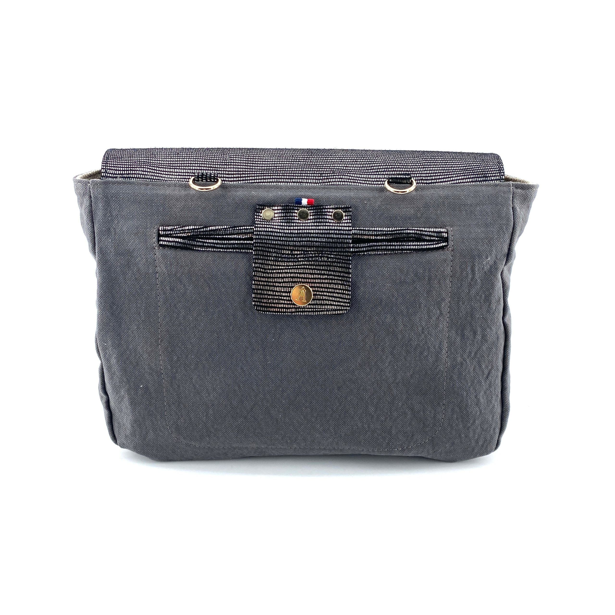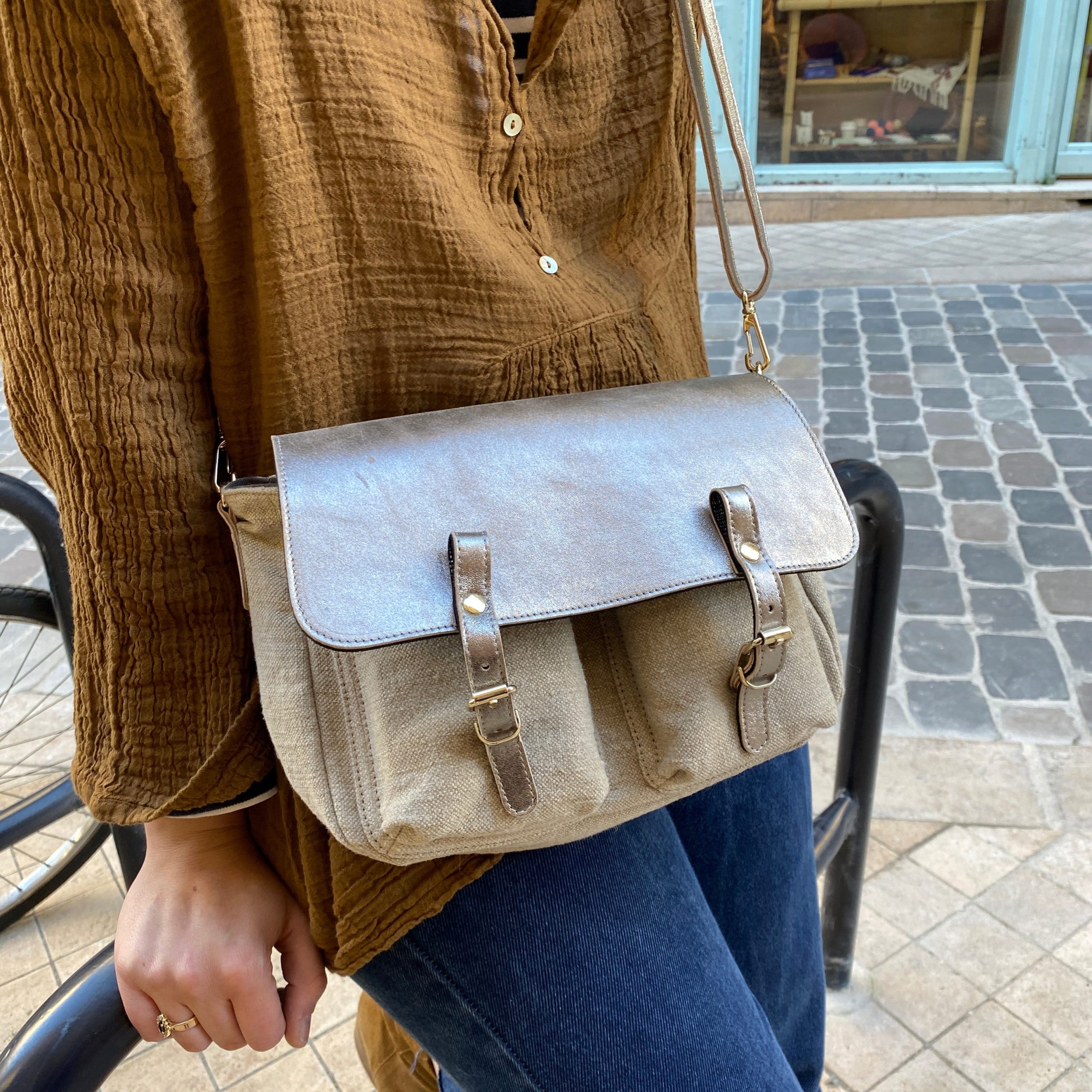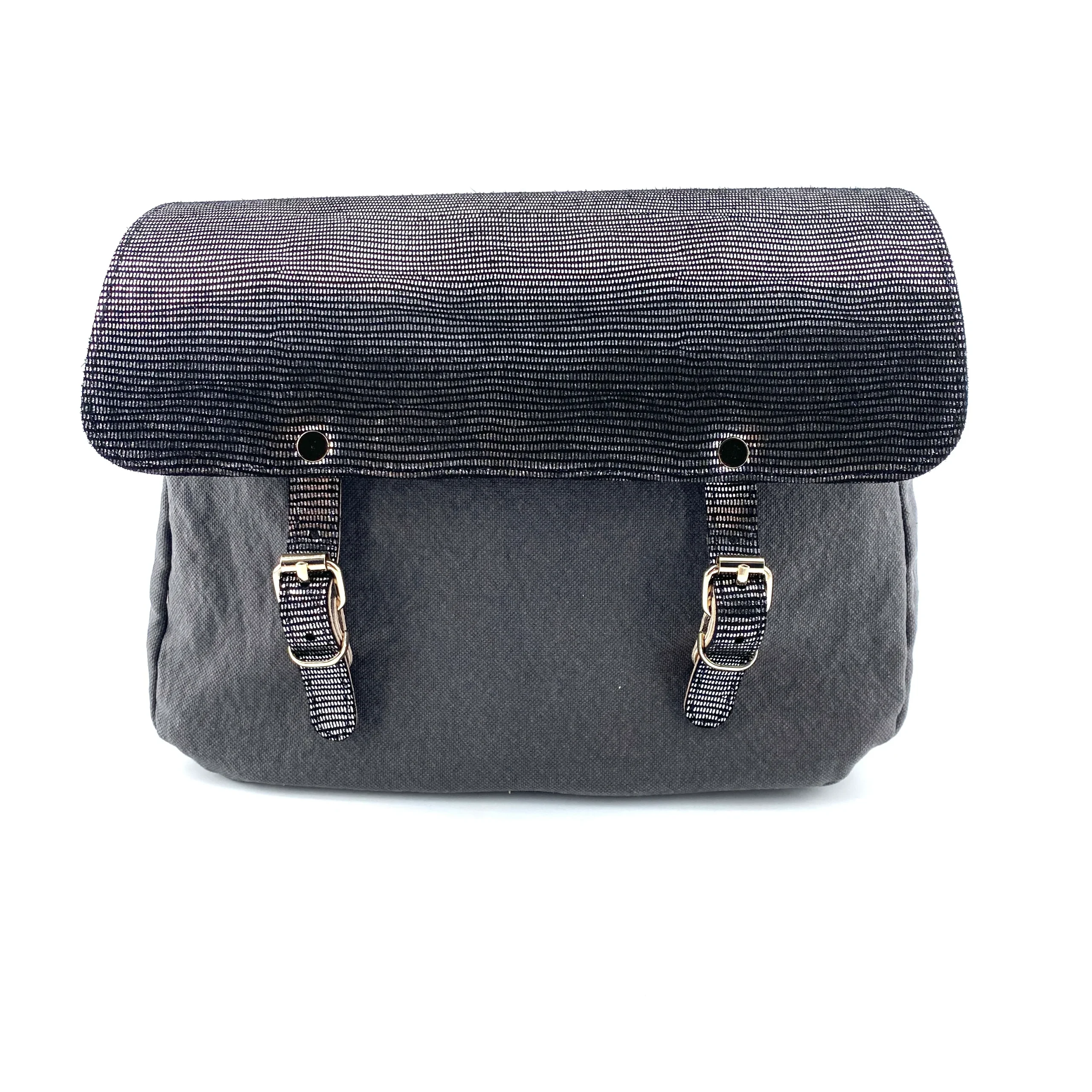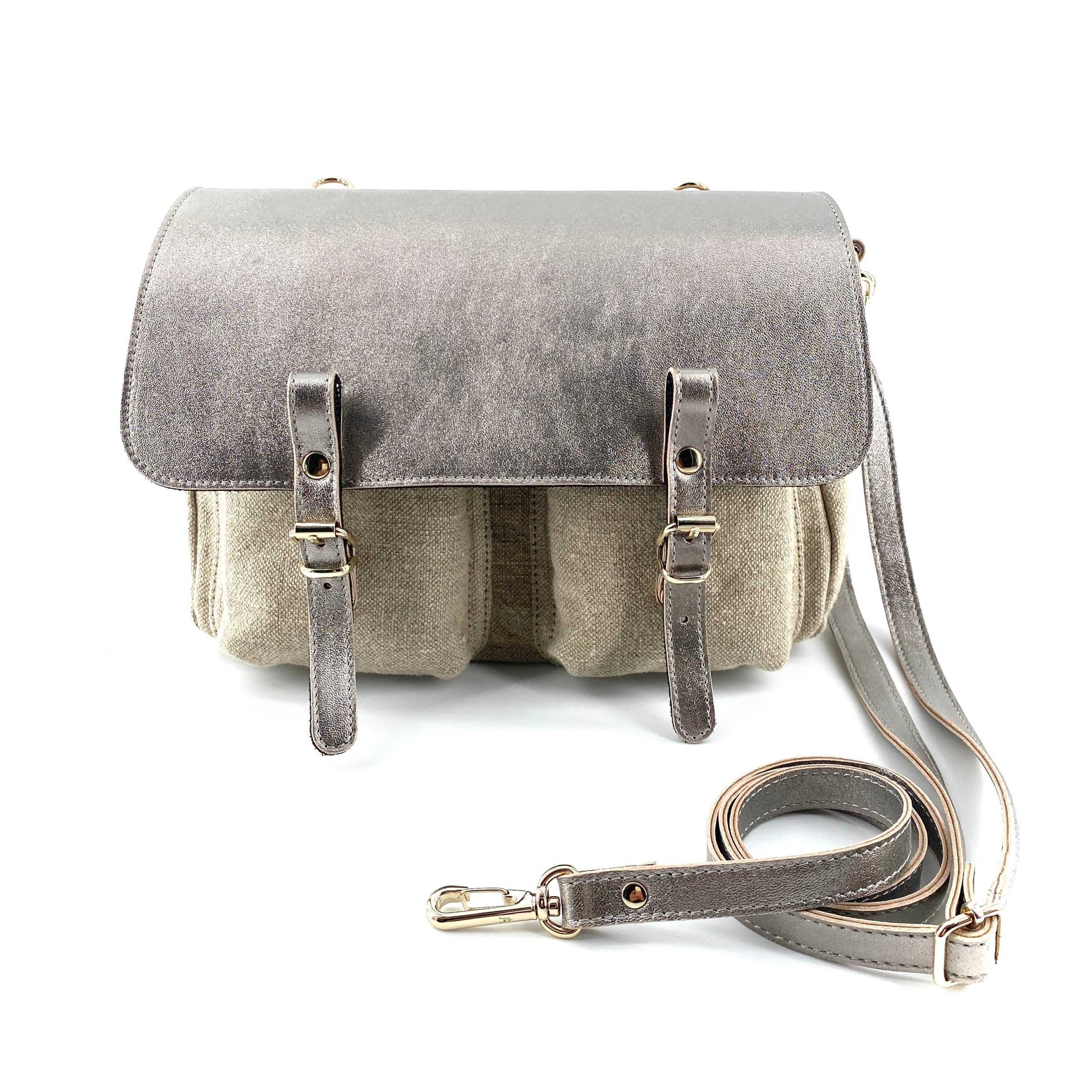 Ici, à l’endroit, le rabat est en cuir d’agneau argenté, le corps est en toile de lin non teintée pour préserver son côté naturel, à l’envers le rabat est en cuir métallisé balck, et le corps du sac en toile de coton grise.