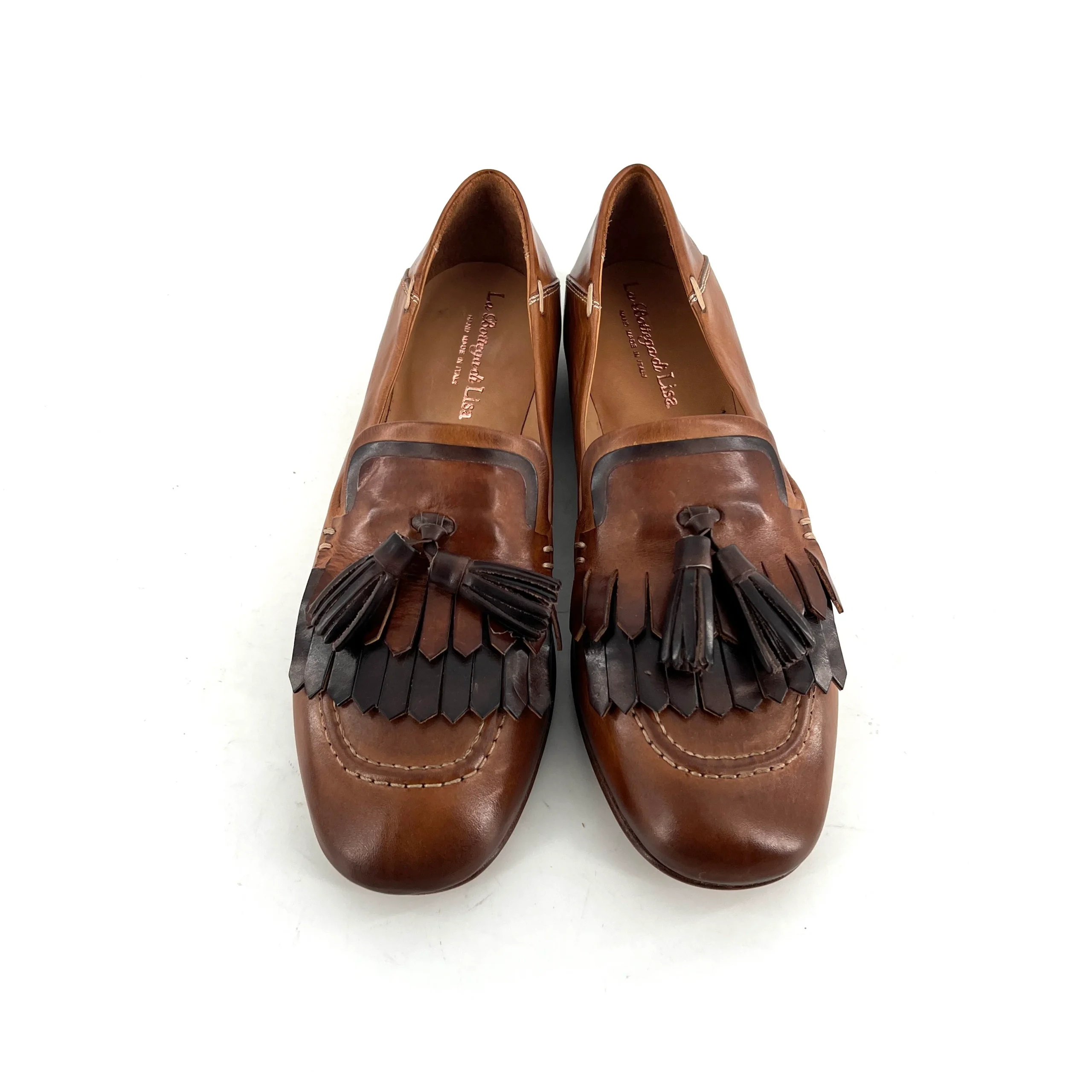 Mocassin Patte Frangée et Pompons en Cuir Camel et Marron