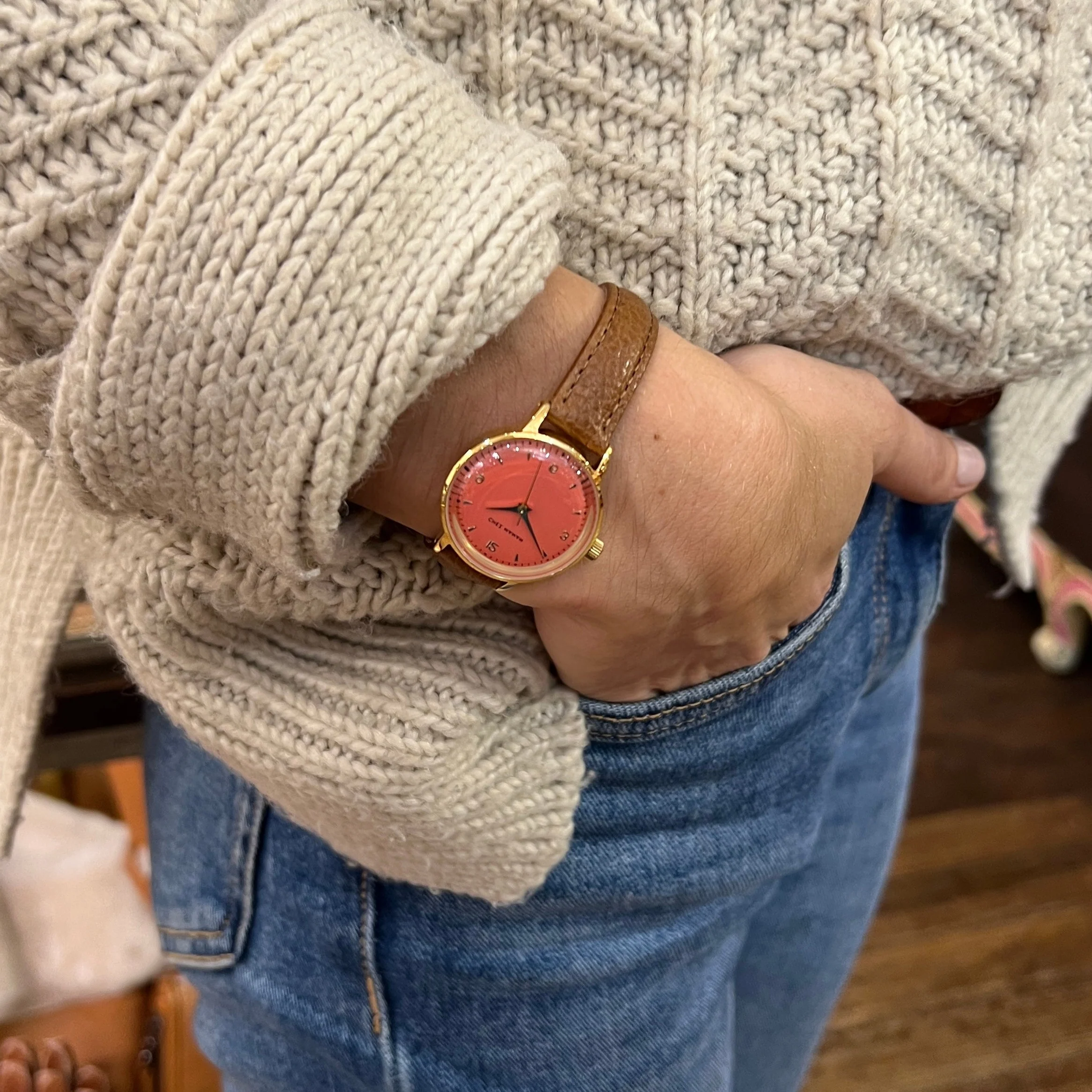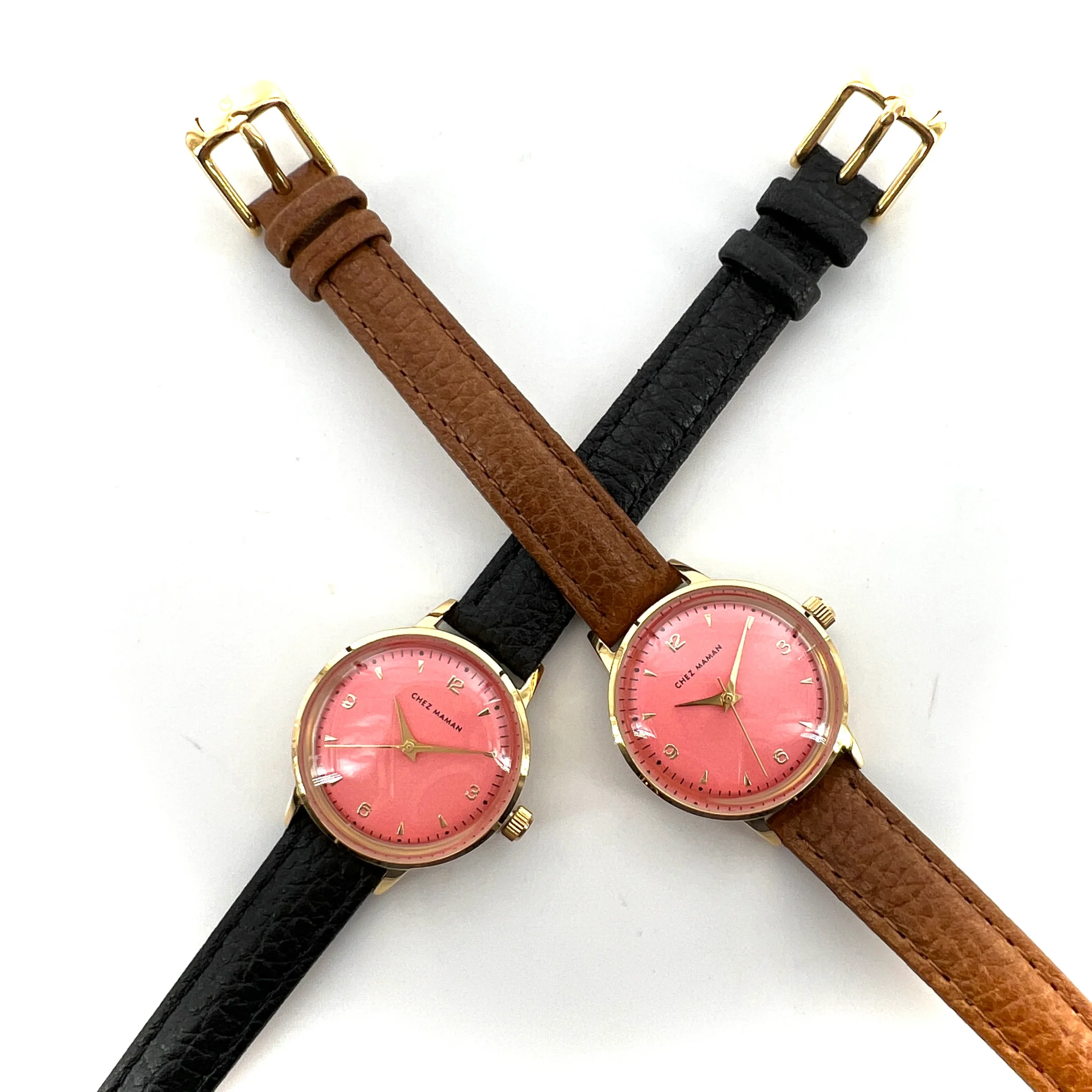 Cette montre, cadran doré fond rose, est un accessoire au style vintage et élégant.