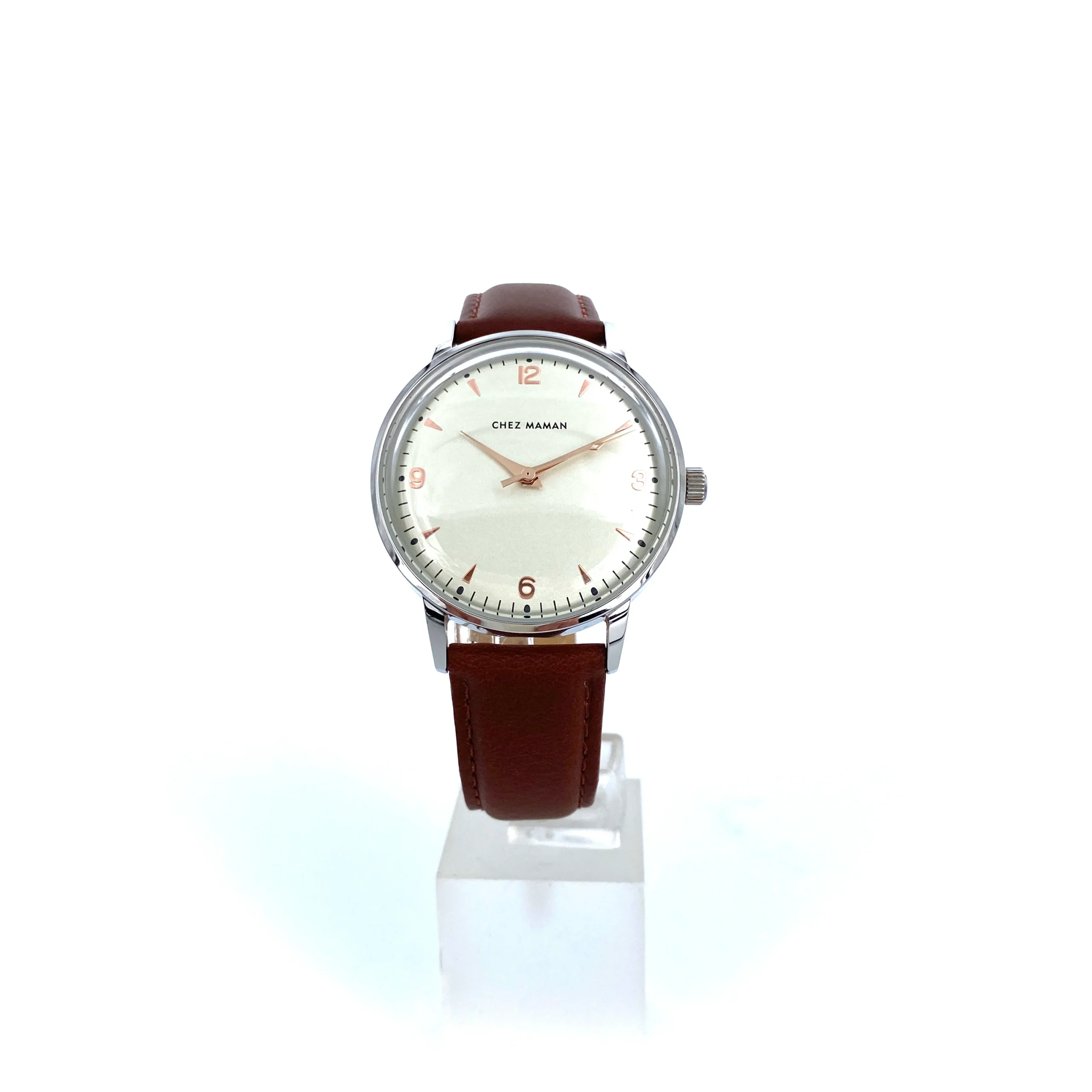Cette montre, agrémentée d’un fond blanc, de chiffres et d’aiguilles dorés, est à la fois rétro, et intemporelle.À porter par tous!Existe aussi cadran fond kaki. Bracelet cuir noir, boitier acier inoxydable silver.Largeur Cadran: 36 mmMouvement quartz de fabrication japonaise.