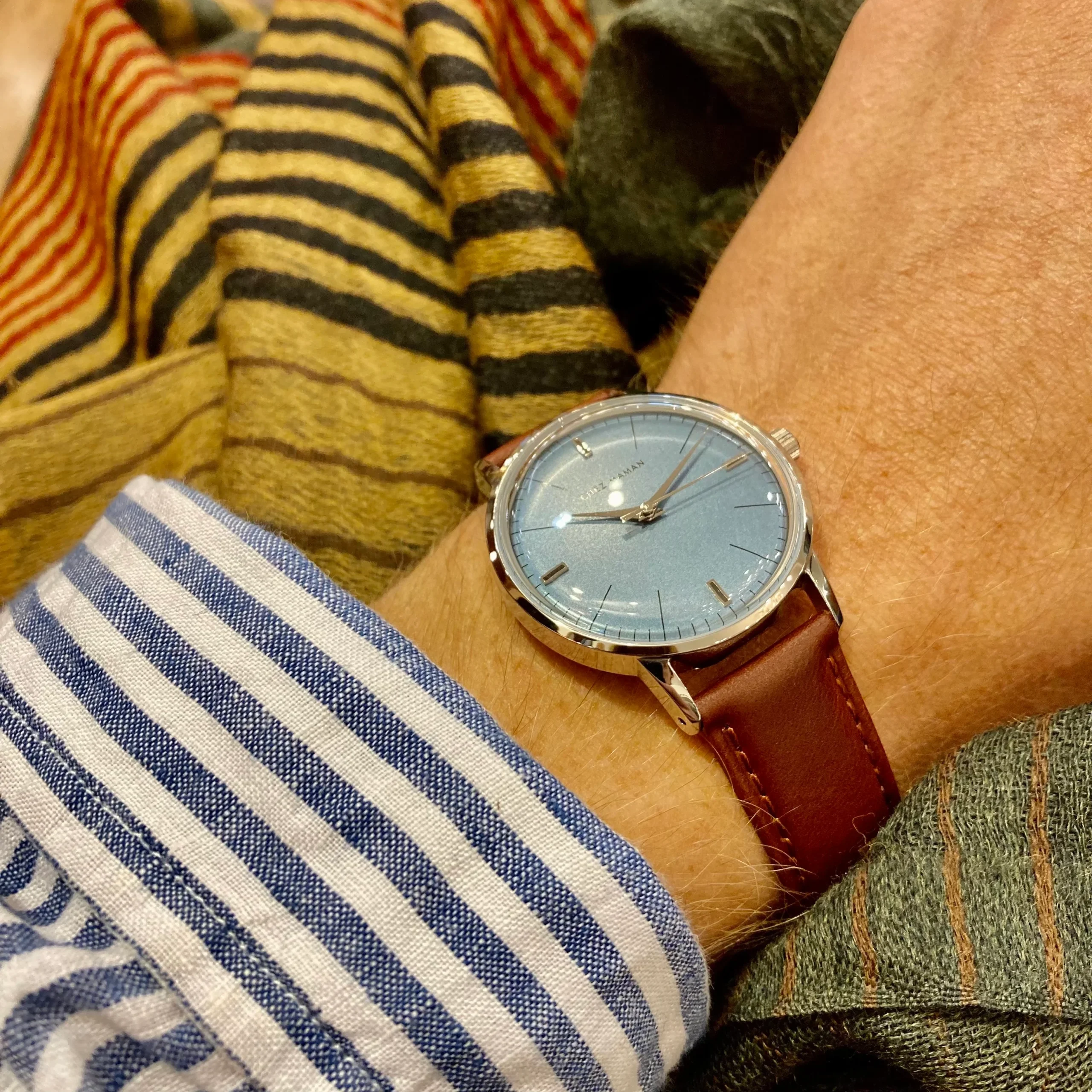 Cette montre, agrémentée d’un fond de cadran bleu, est à la fois rétro, intemporelle, et actuelle.