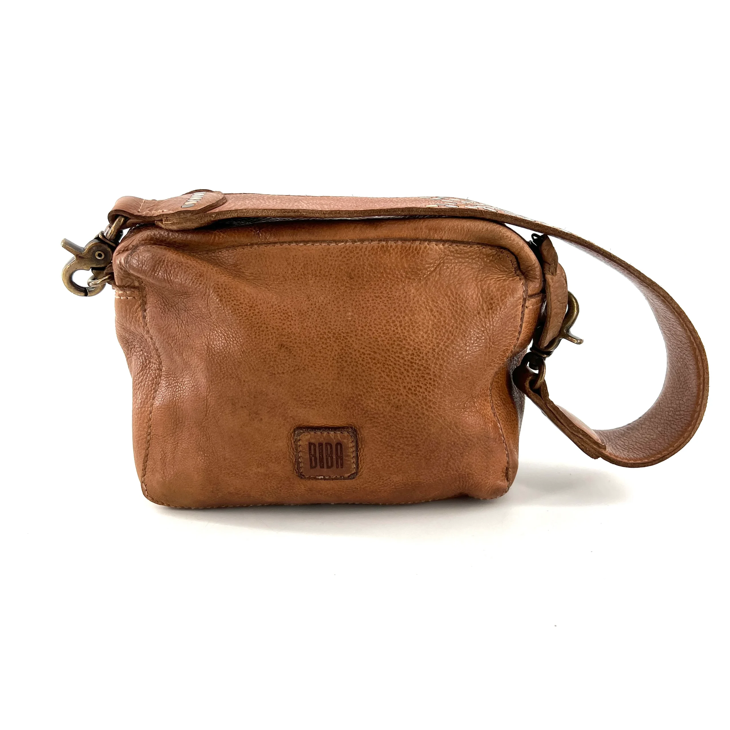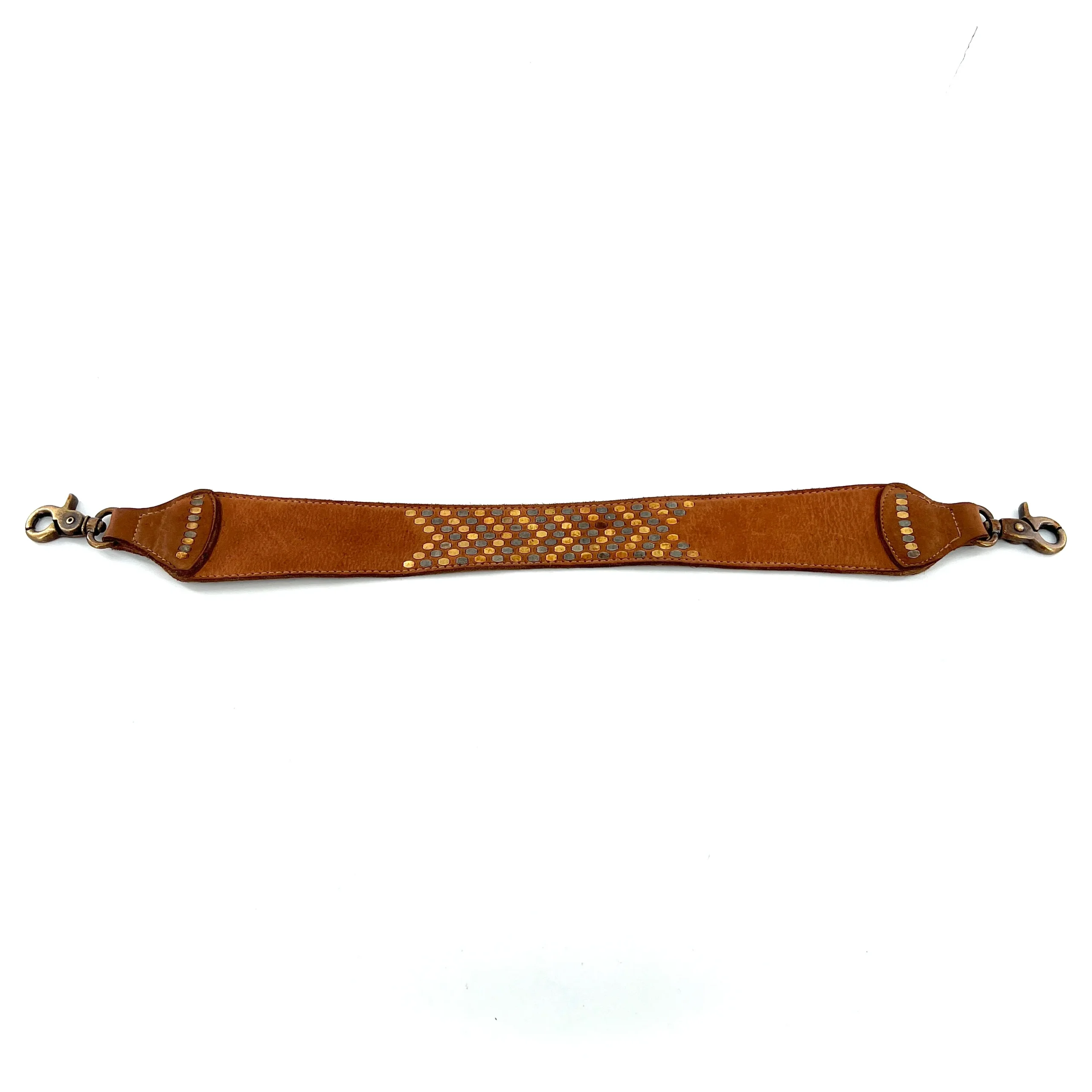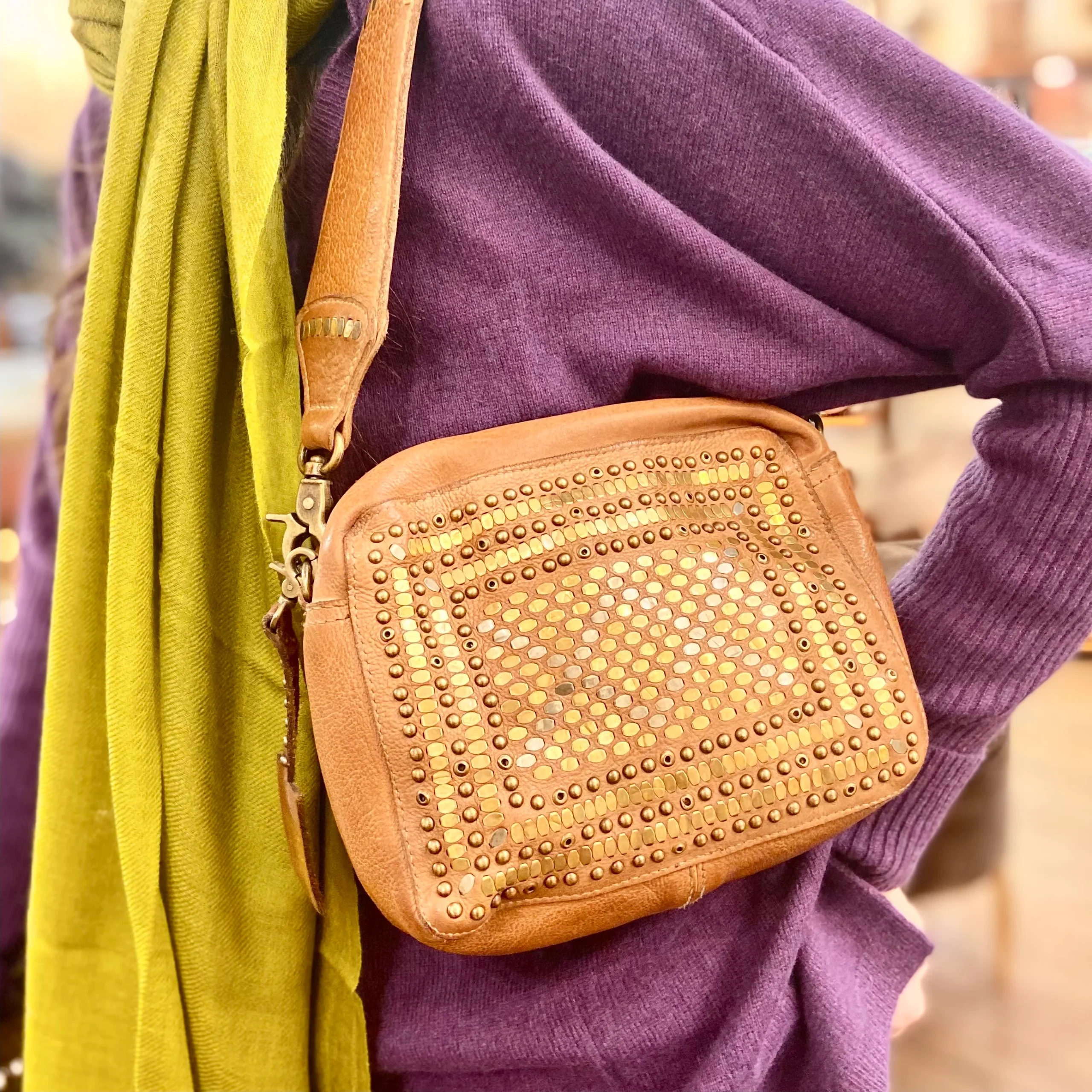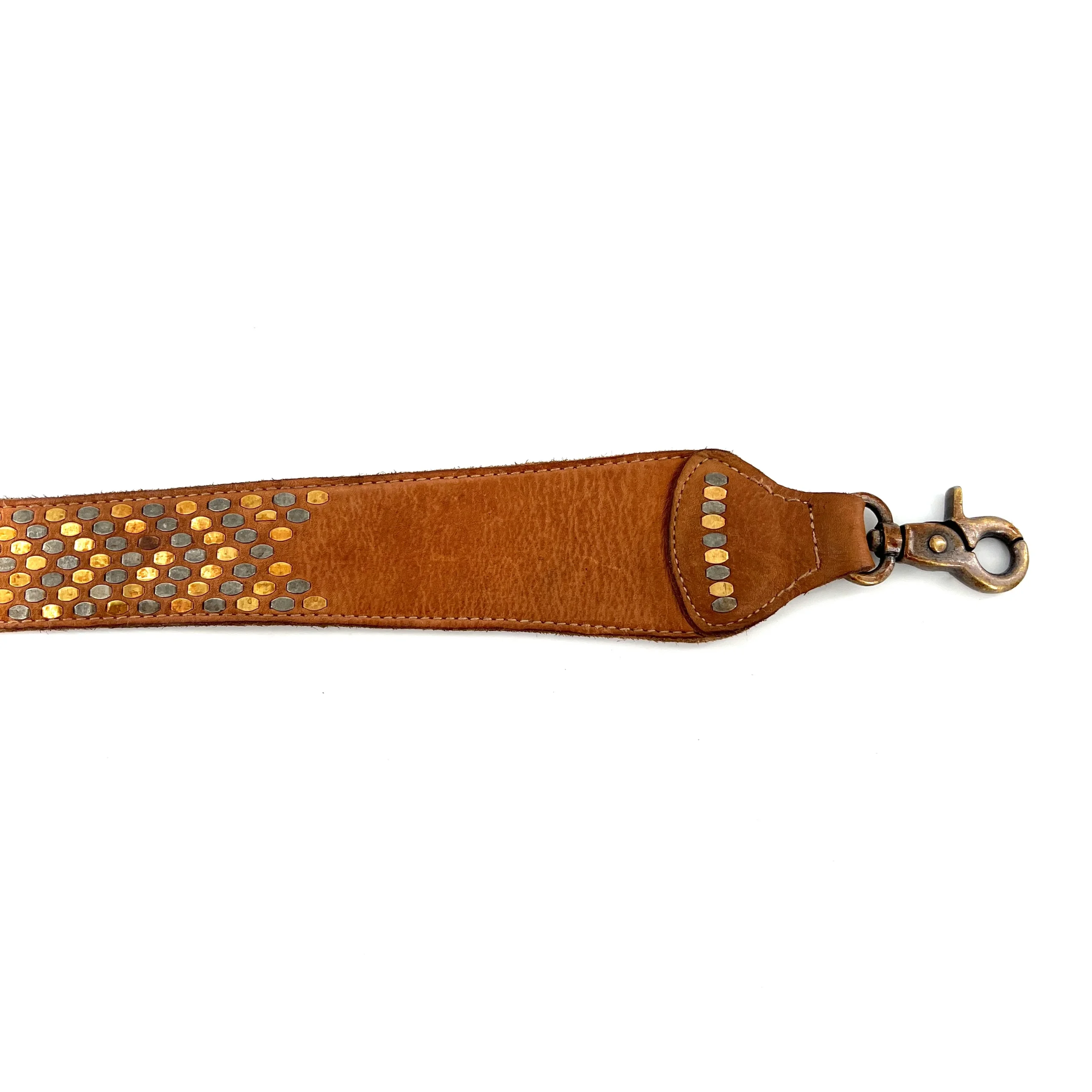 Petit Sac en Cuir Ocre et Clous Plats Bicolores