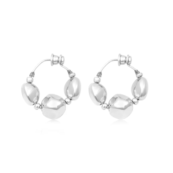 Ces créoles sont composées de cabochons en métal argenté. Présentes et discrètes, idéales pour un usage quotidien, elles existent également en métal doré à l’Or Fin. Diamètre : 2,5 cm.