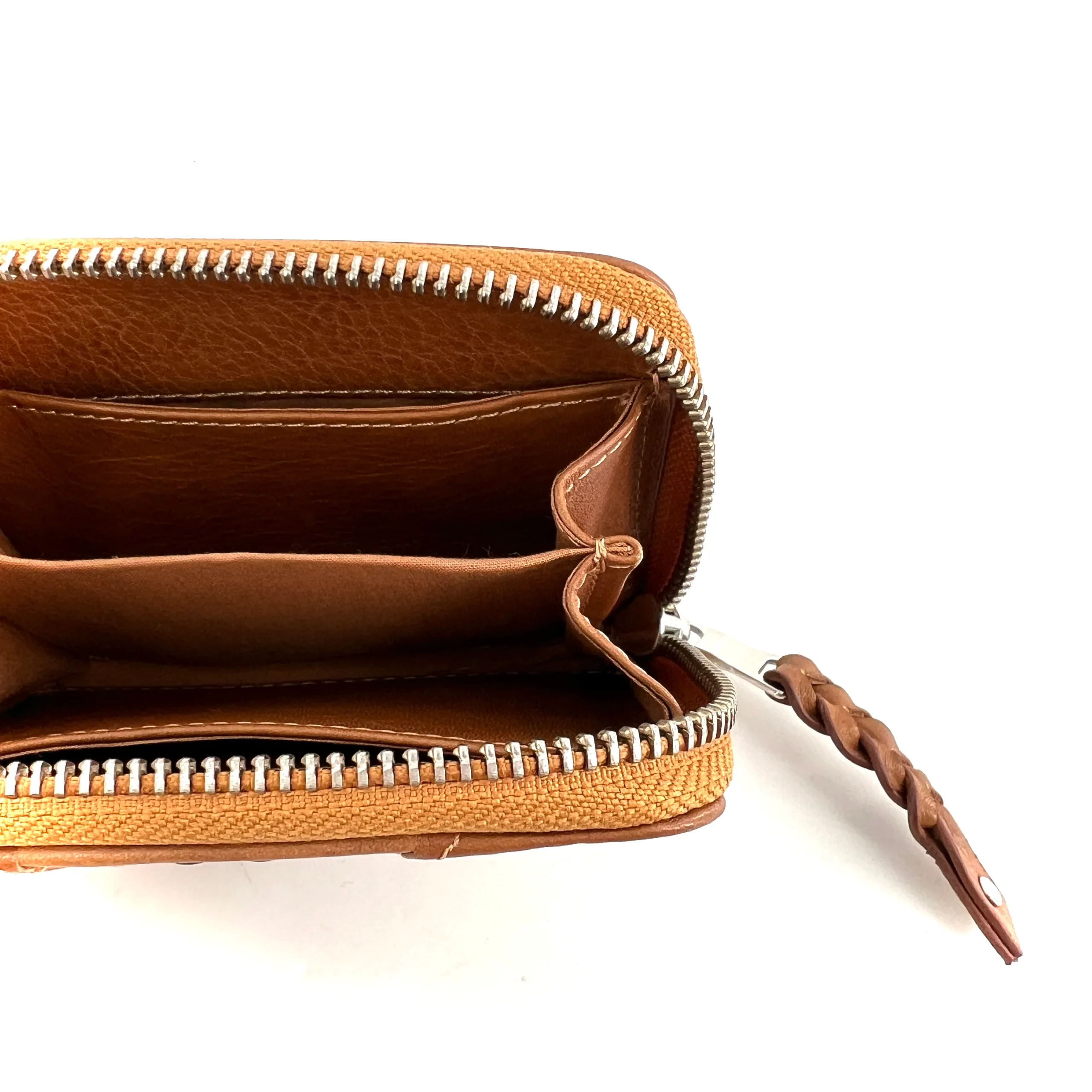 Ce porte-monnaie, ouverture zippée, propose des emplacements cartes. On aime le petit détail, clous plats bicolores, qui modernise ce classique. Existe aussi en cuir Noir. Dimensions: 11cm x 9cm x 2cm
