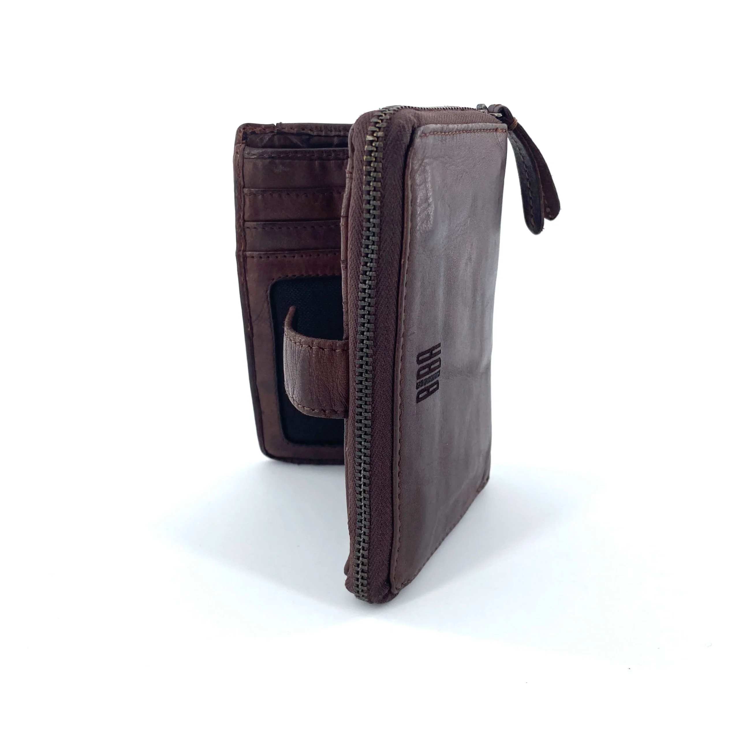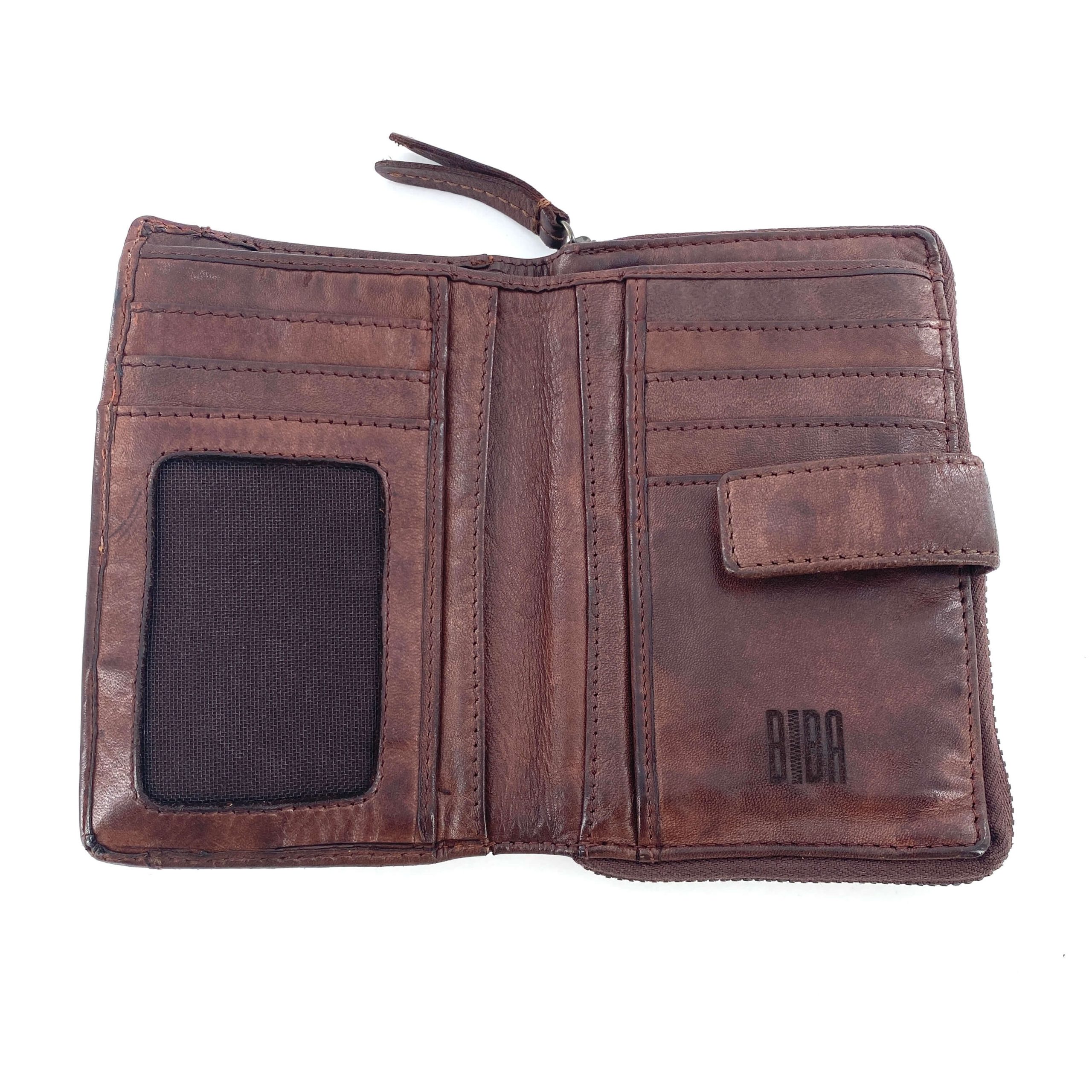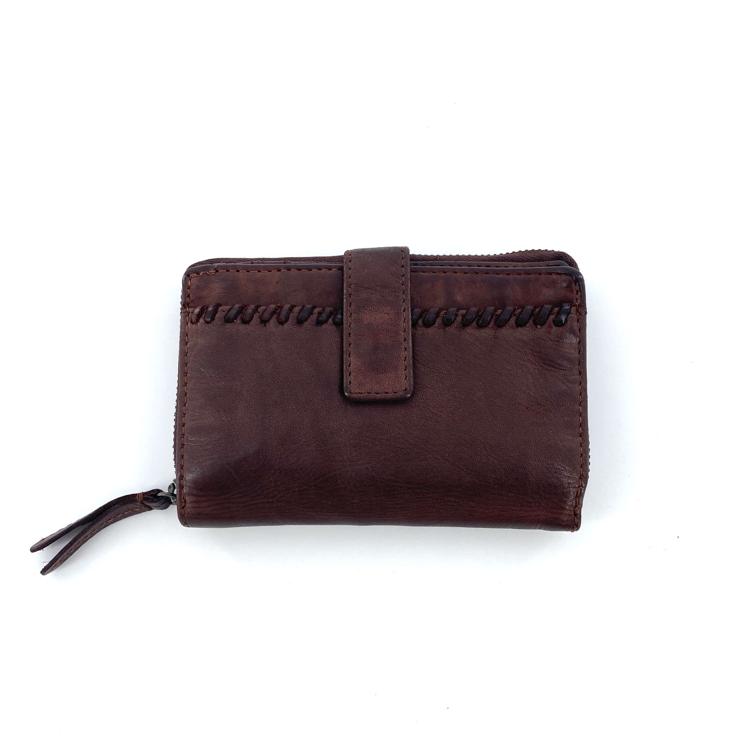 Portefeuille en cuir Marron, double compartiment, proposant de nombreux rangements cartes et autres , qui se ferme à l’aide d’une pate cuir pression. À l’arrière large ouverture zippée permettant le rangement de cartes et de la monnaie.