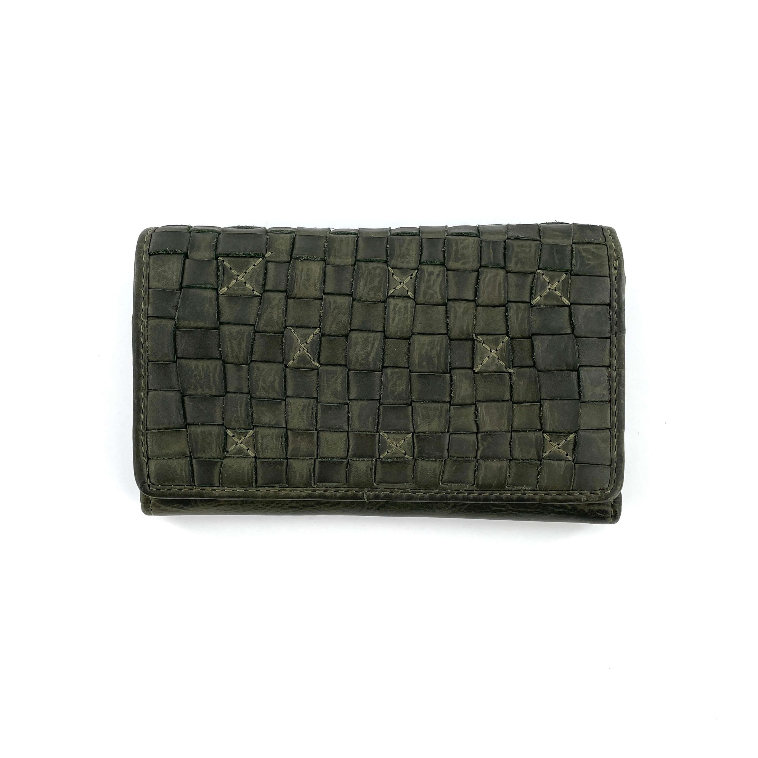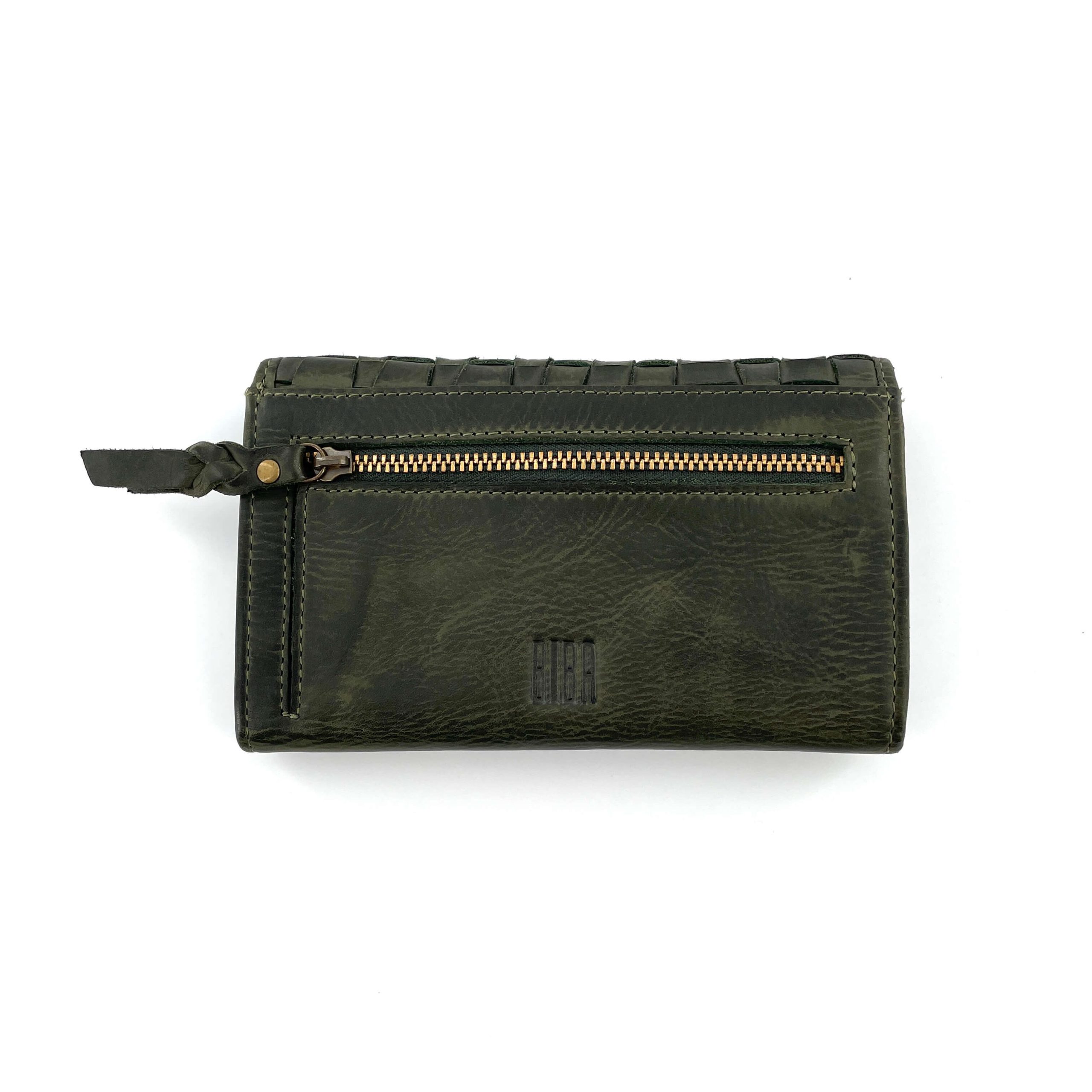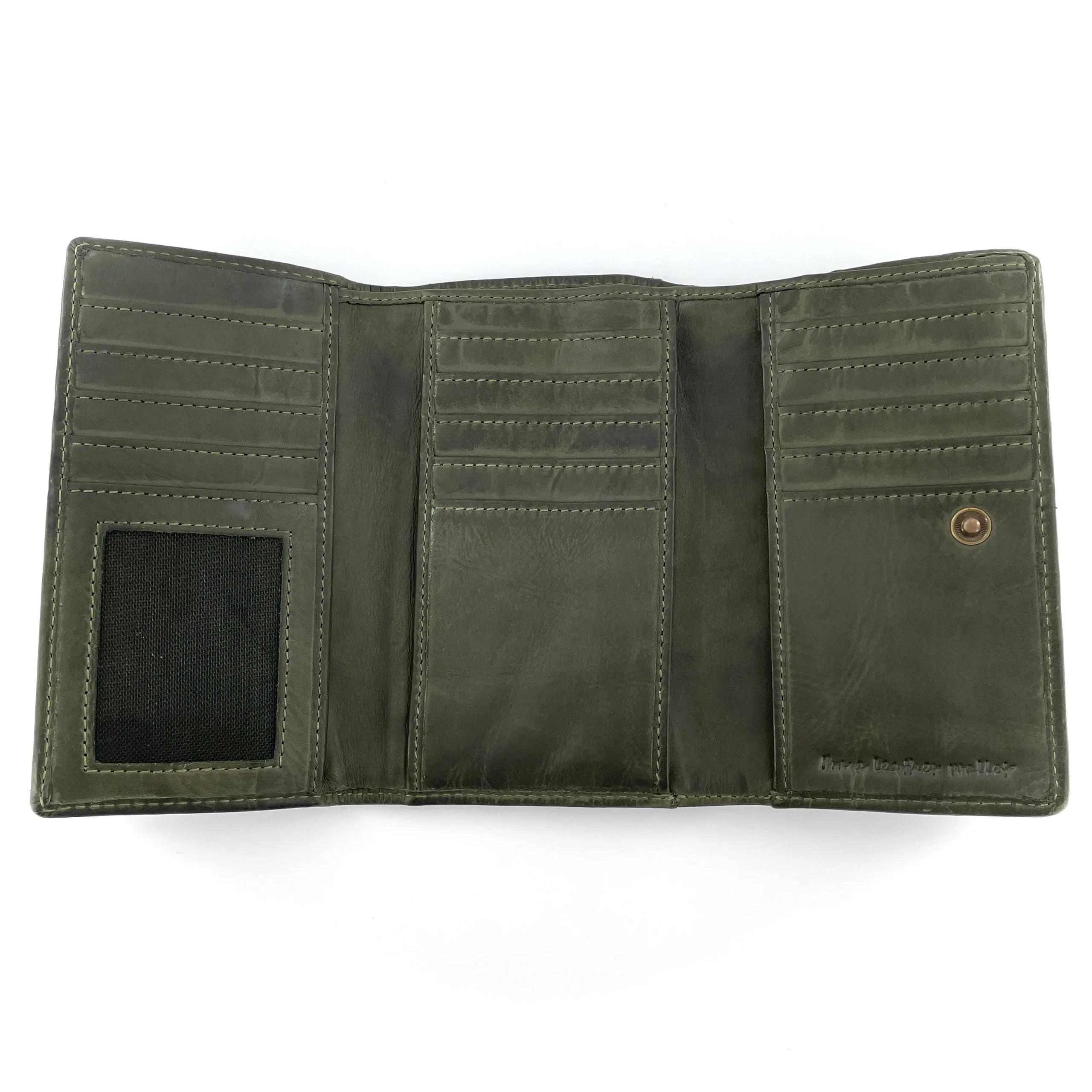 Portefeuille en cuir Vert, nombreux compartiments cartes, pochette zippée arrière.