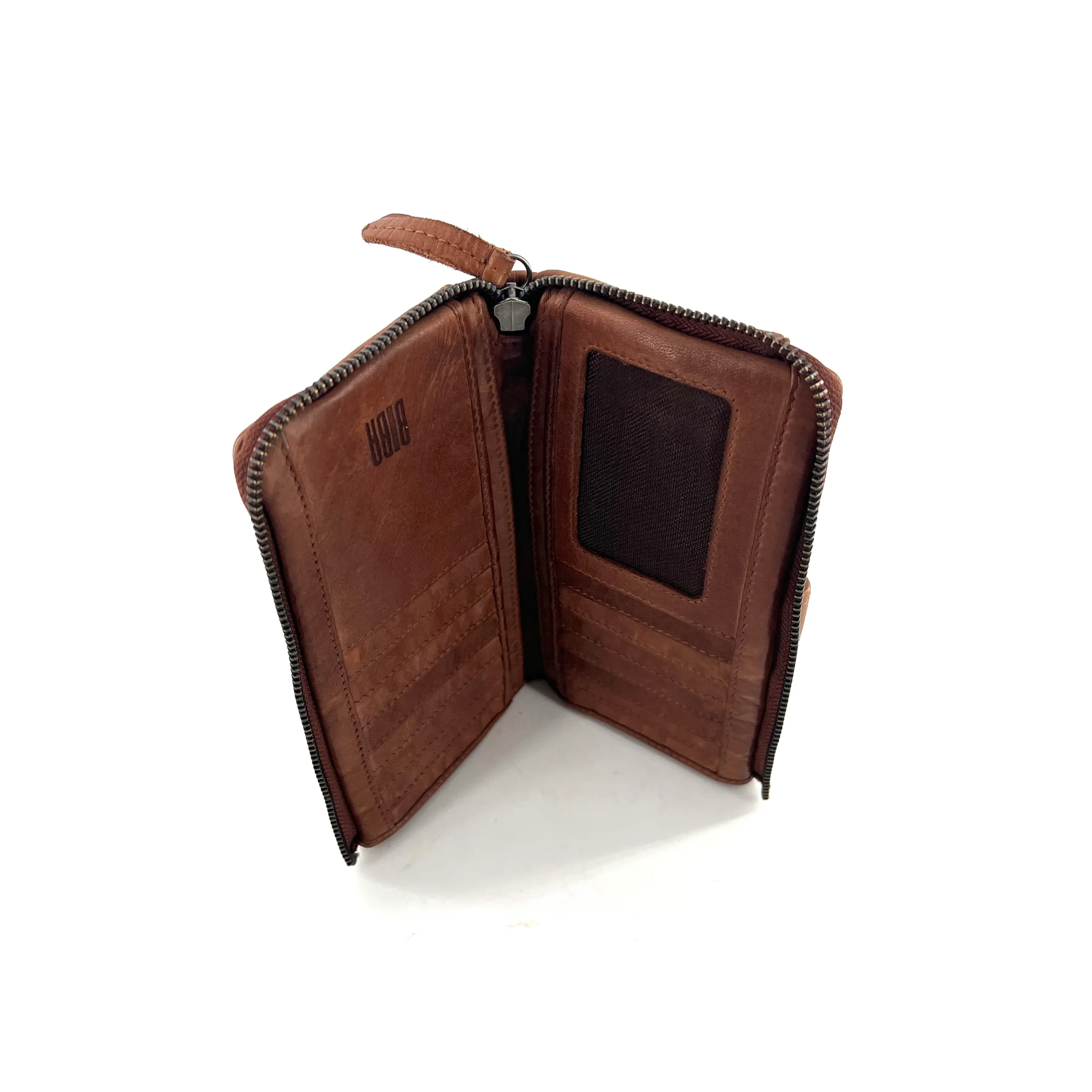 Portefeuille en cuir Camel, au centre, sécurisés par un zip, de nombreux rangements cartes, à l’arrière un compartiment monnaie et à l’avant un compartiment rangement fermeture pate cuir et pression.