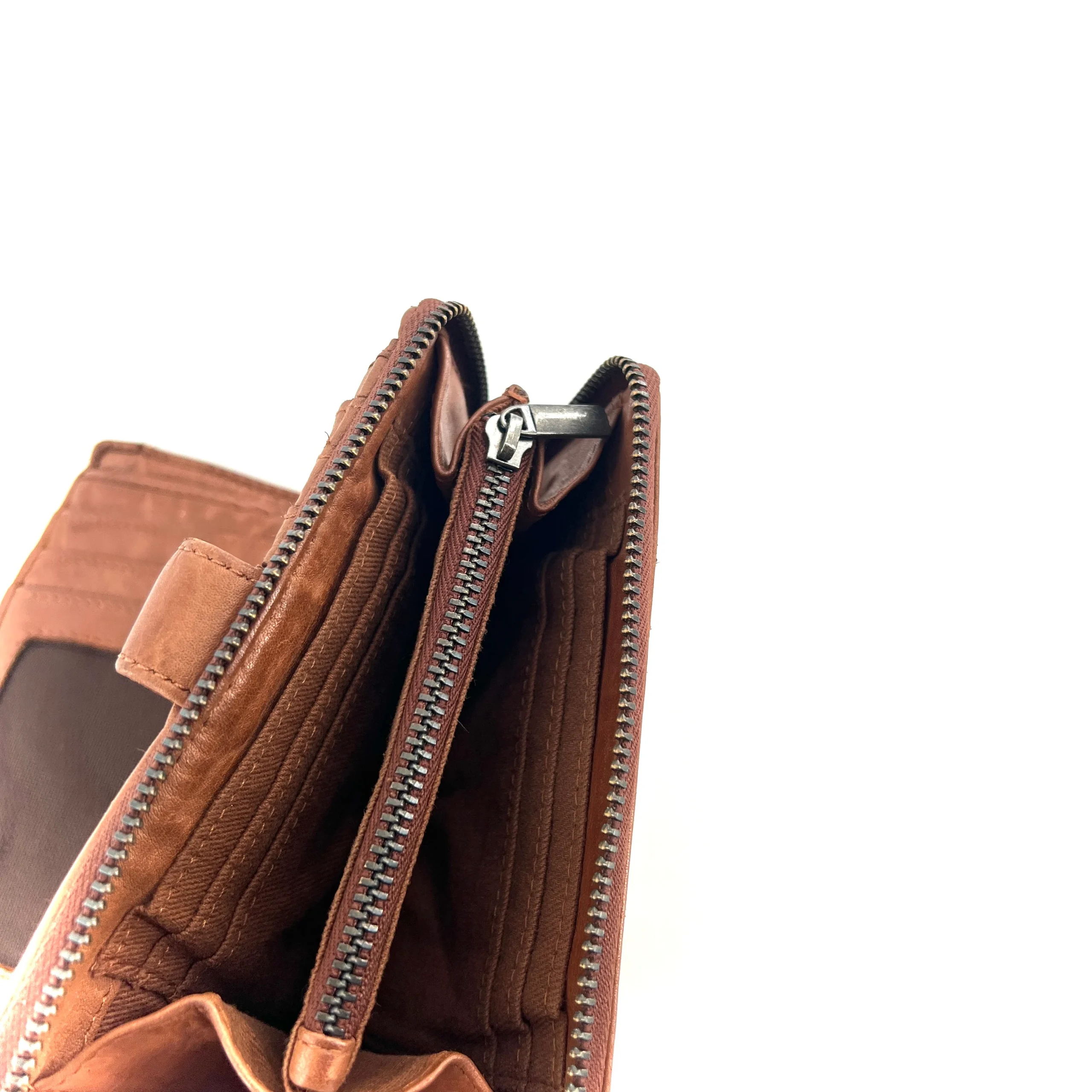 Portefeuille en cuir Camel, double compartiment, proposant de nombreux rangements cartes et autres , qui se ferme à l’aide d’une pate cuir pression. À l’arrière large ouverture zippée permettant le rangement de cartes et de la monnaie.