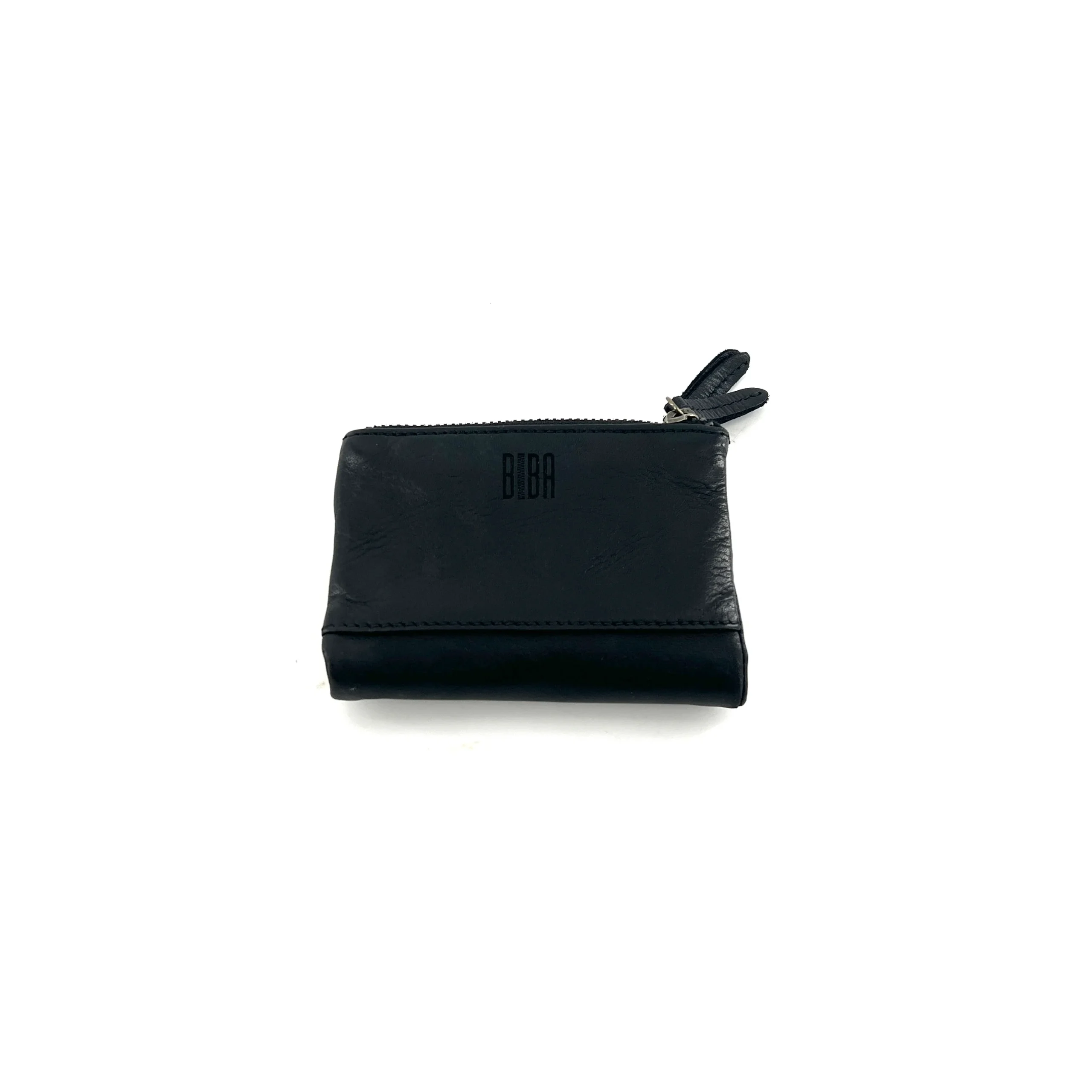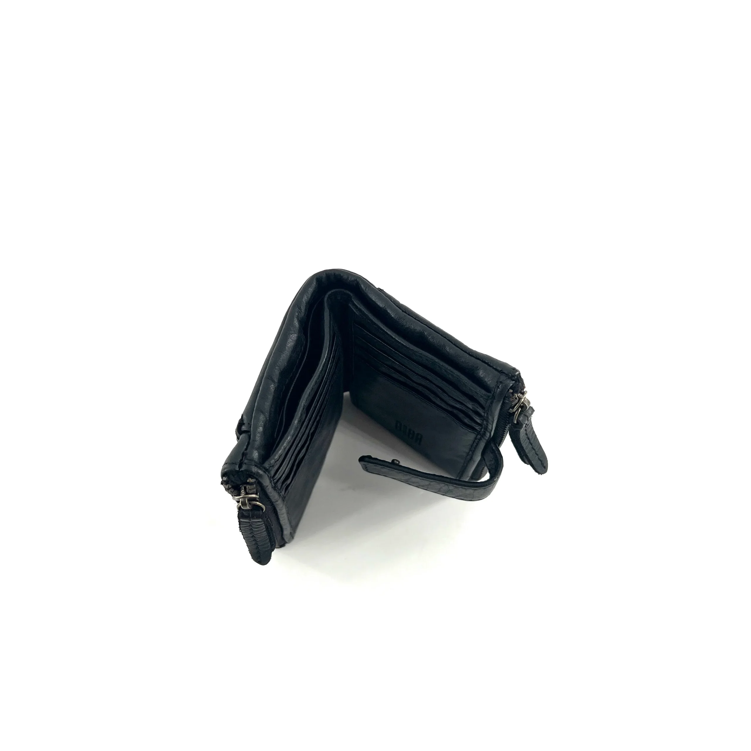 Portefeuille en cuir Noir, double compartiment, proposant de nombreux rangements cartes et autres , qui se ferme à l’aide d’une pate cuir pression. À l’arrière large ouverture zippée permettant le rangement de cartes et de la monnaie.
