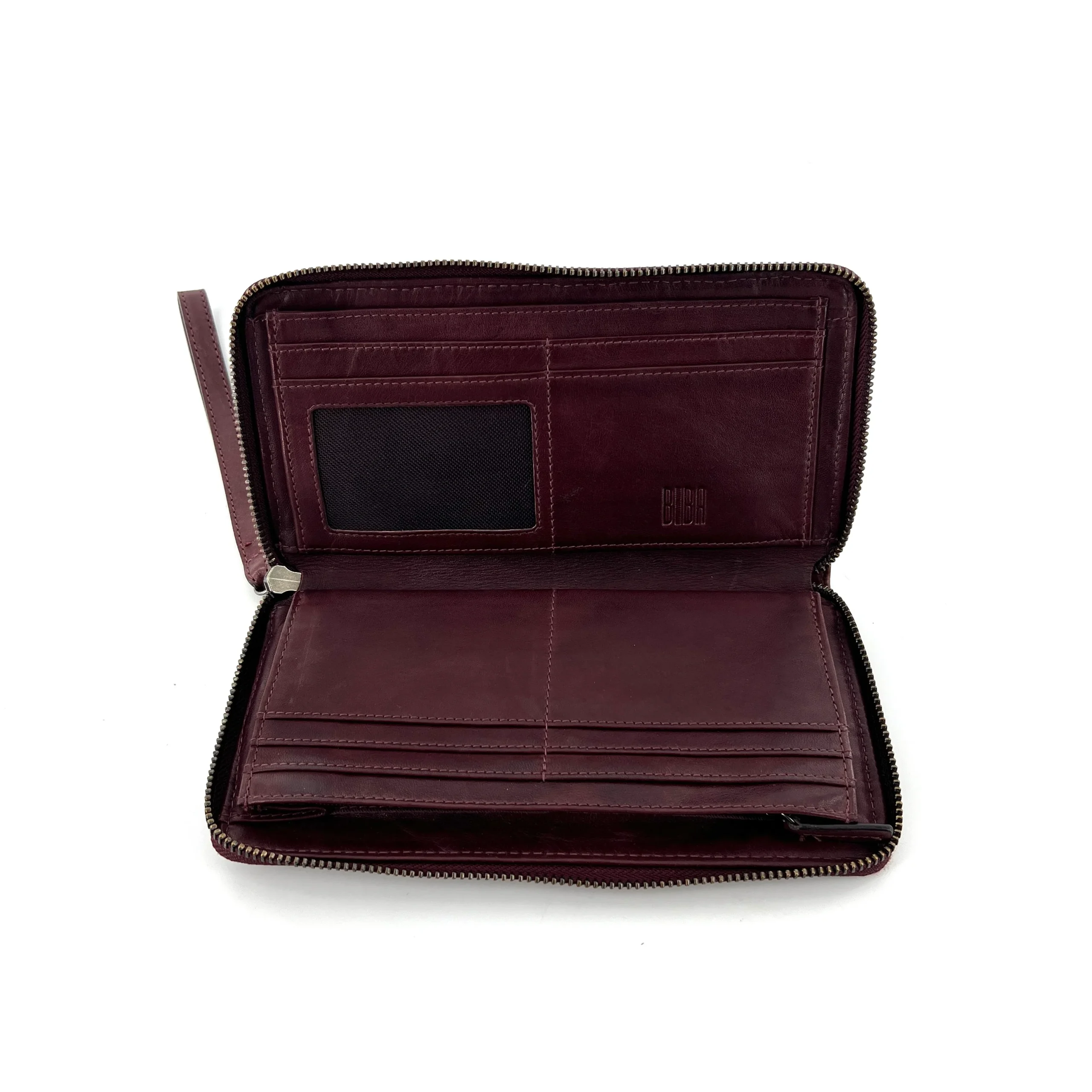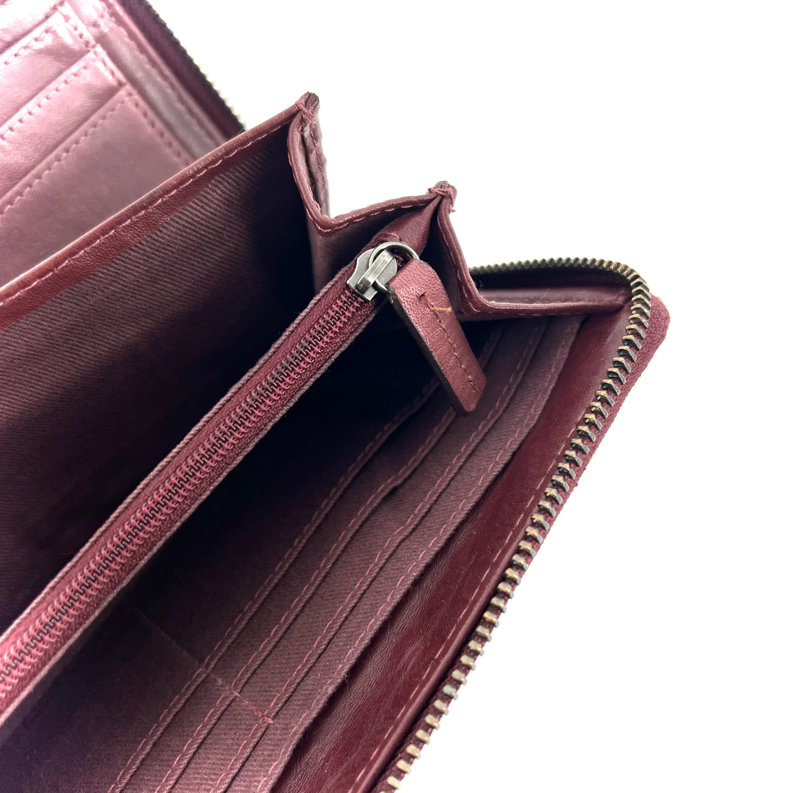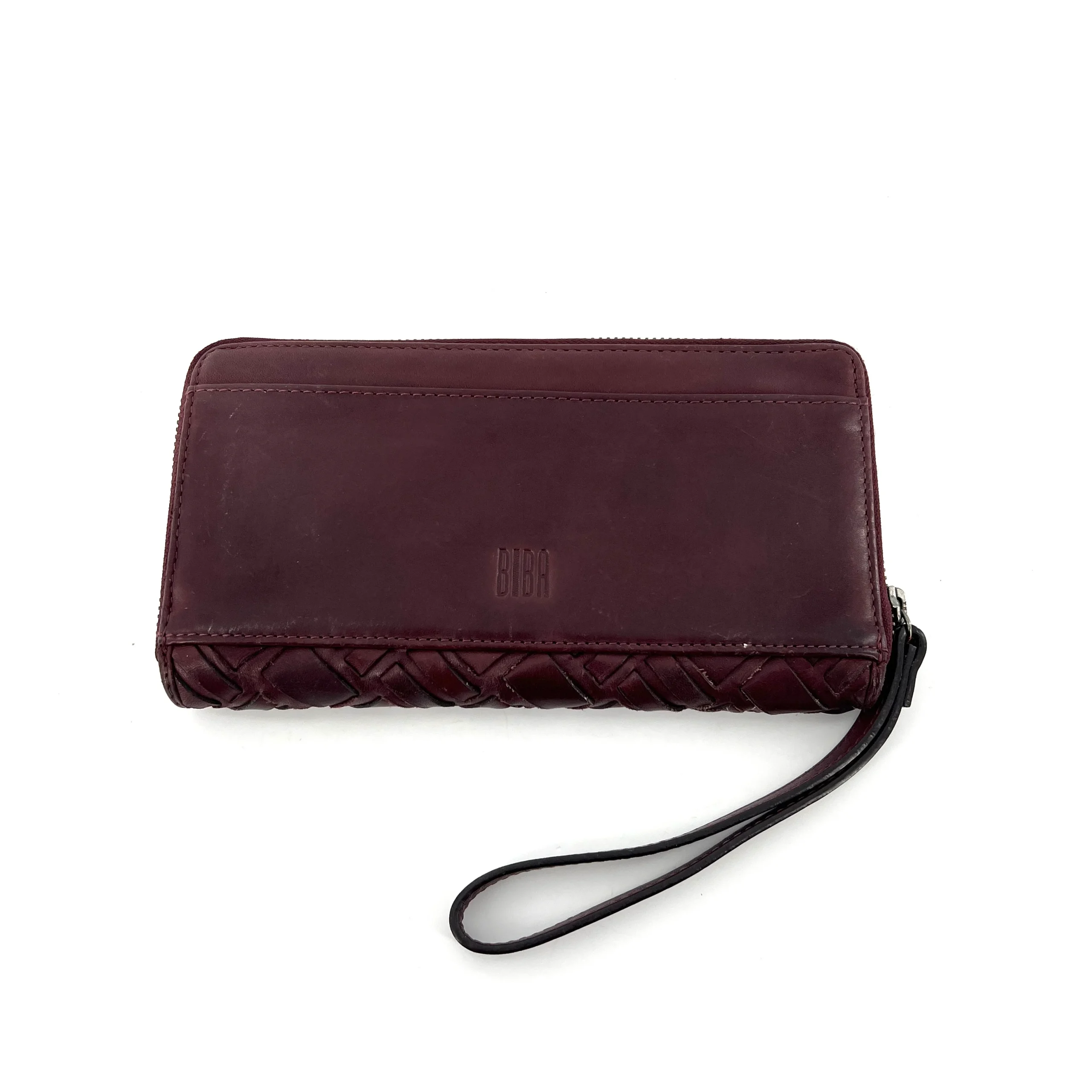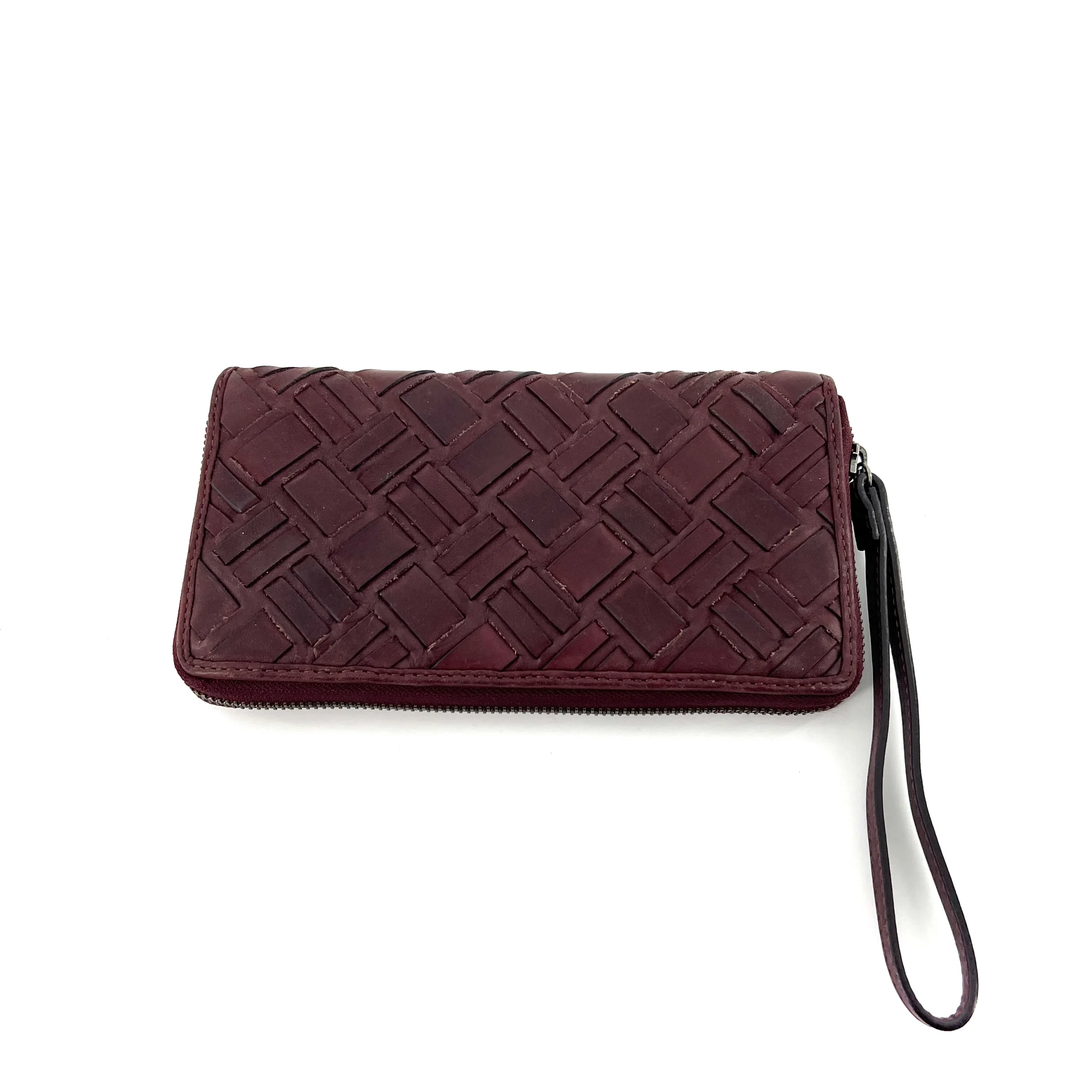 Ce portefeuille, en cuir tressé Bordeaux, propose une large ouverture zippée.