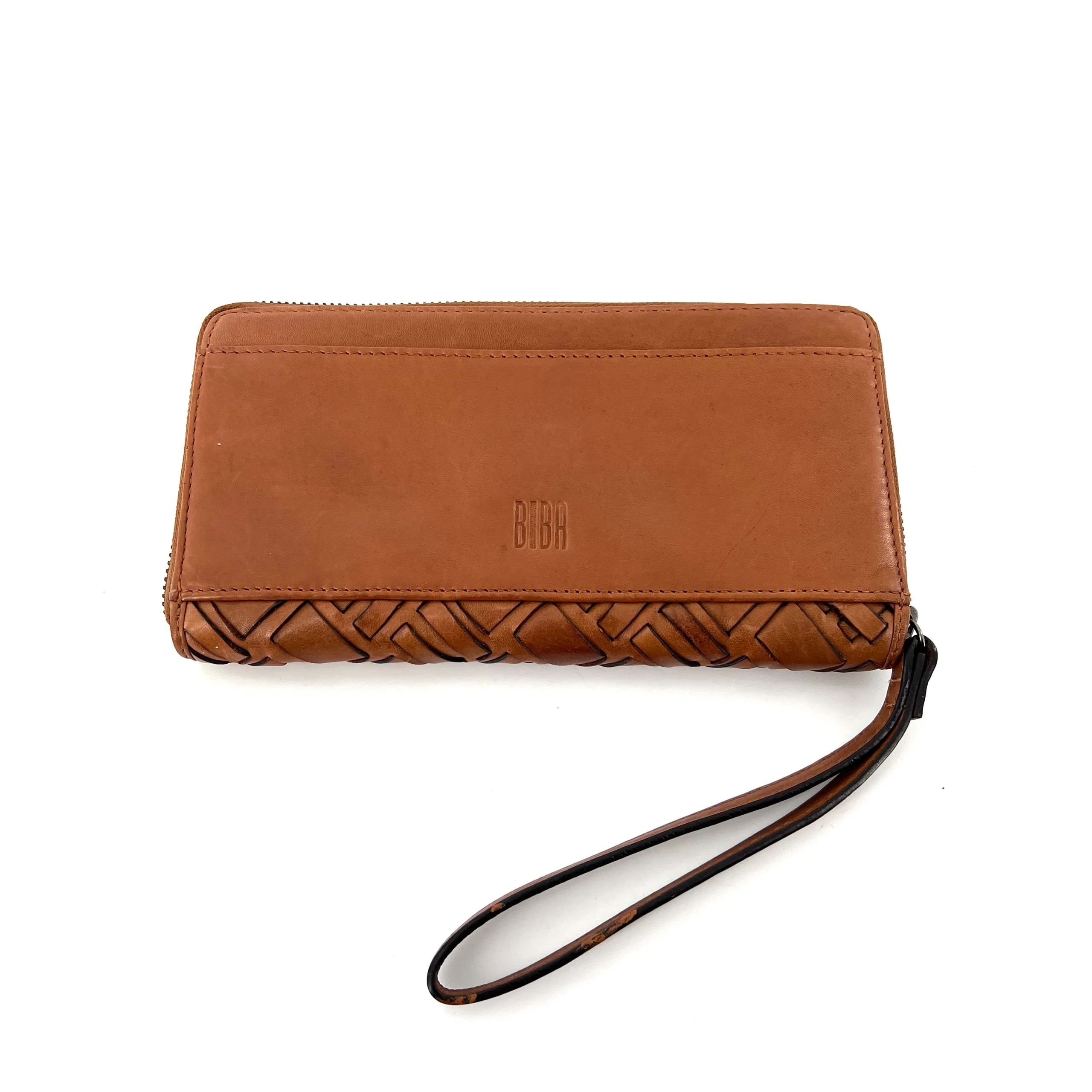 Ce portefeuille, en cuir tressé Camel, propose une large ouverture zippée.