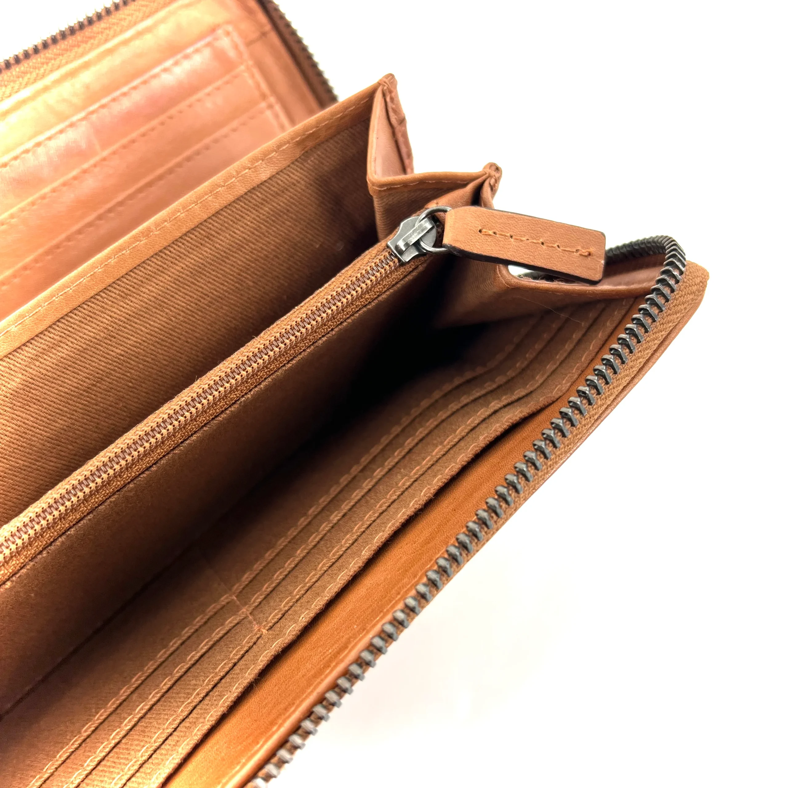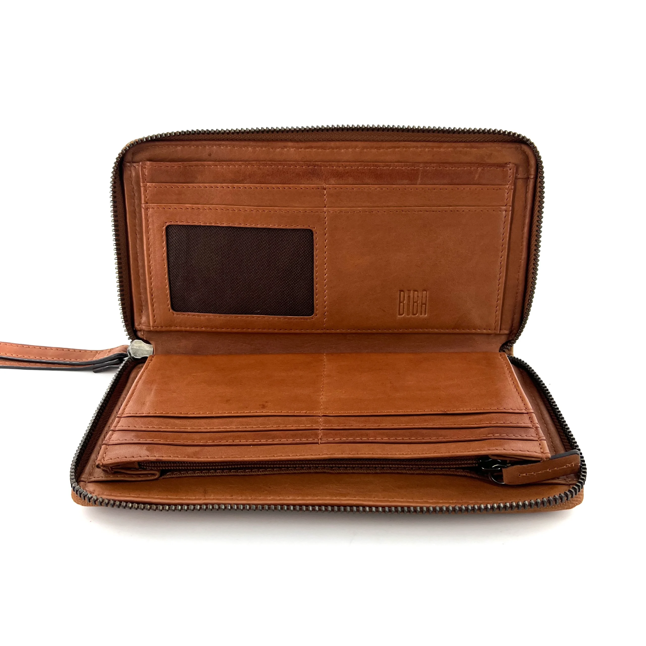 À l’intérieur de nombreux rangements cartes et pièce d’identité, ainsi qu’une pochette zippée pour la monnaie et des cartes.