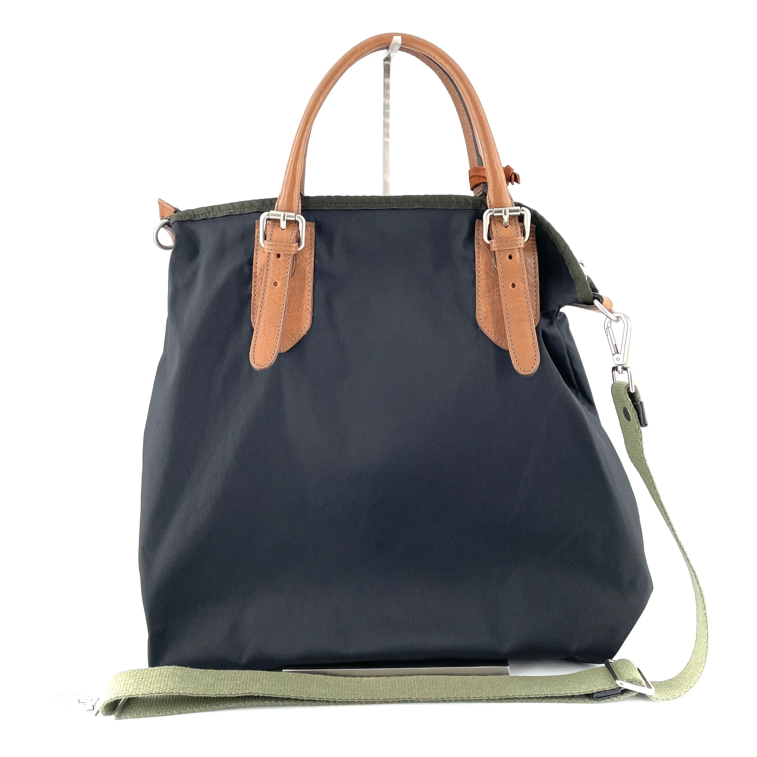 Une bandoulière amovible et réglable en toile kaki.