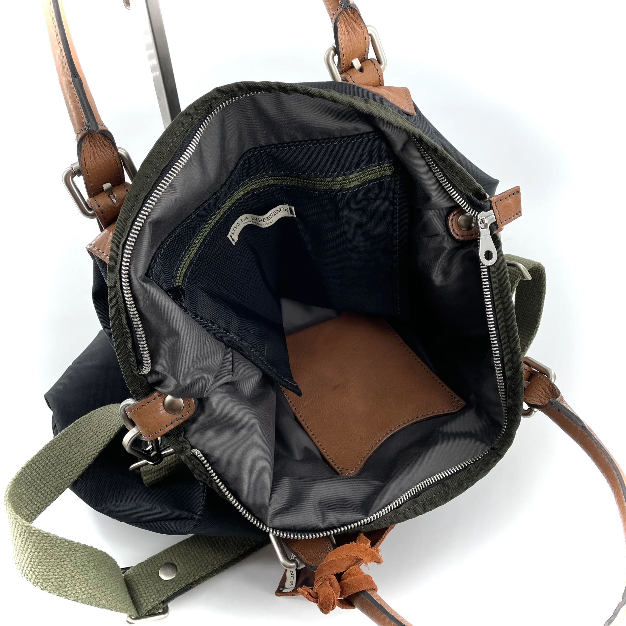 À l’intérieur une pochette zippée et une pochette plaquée en cuir camel.