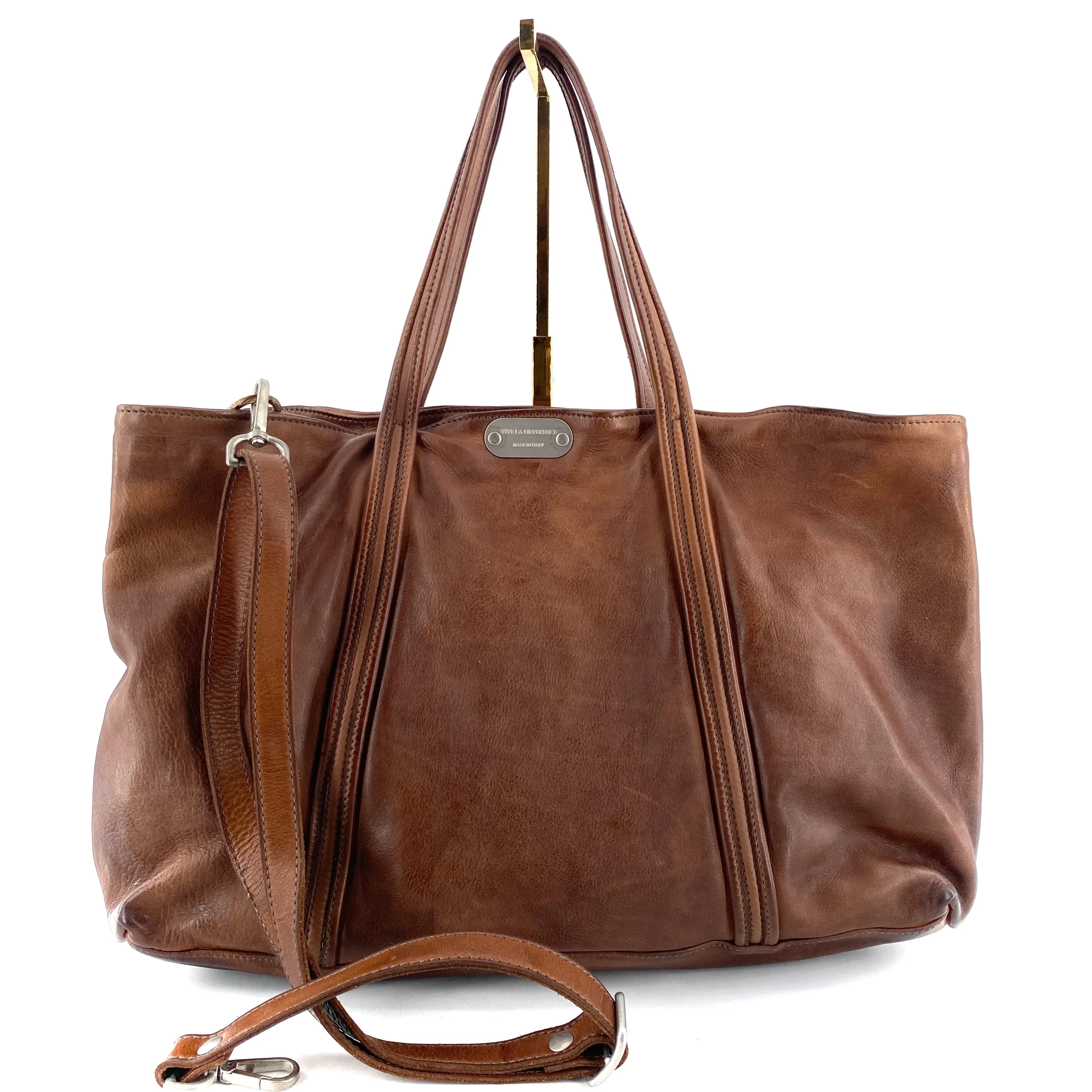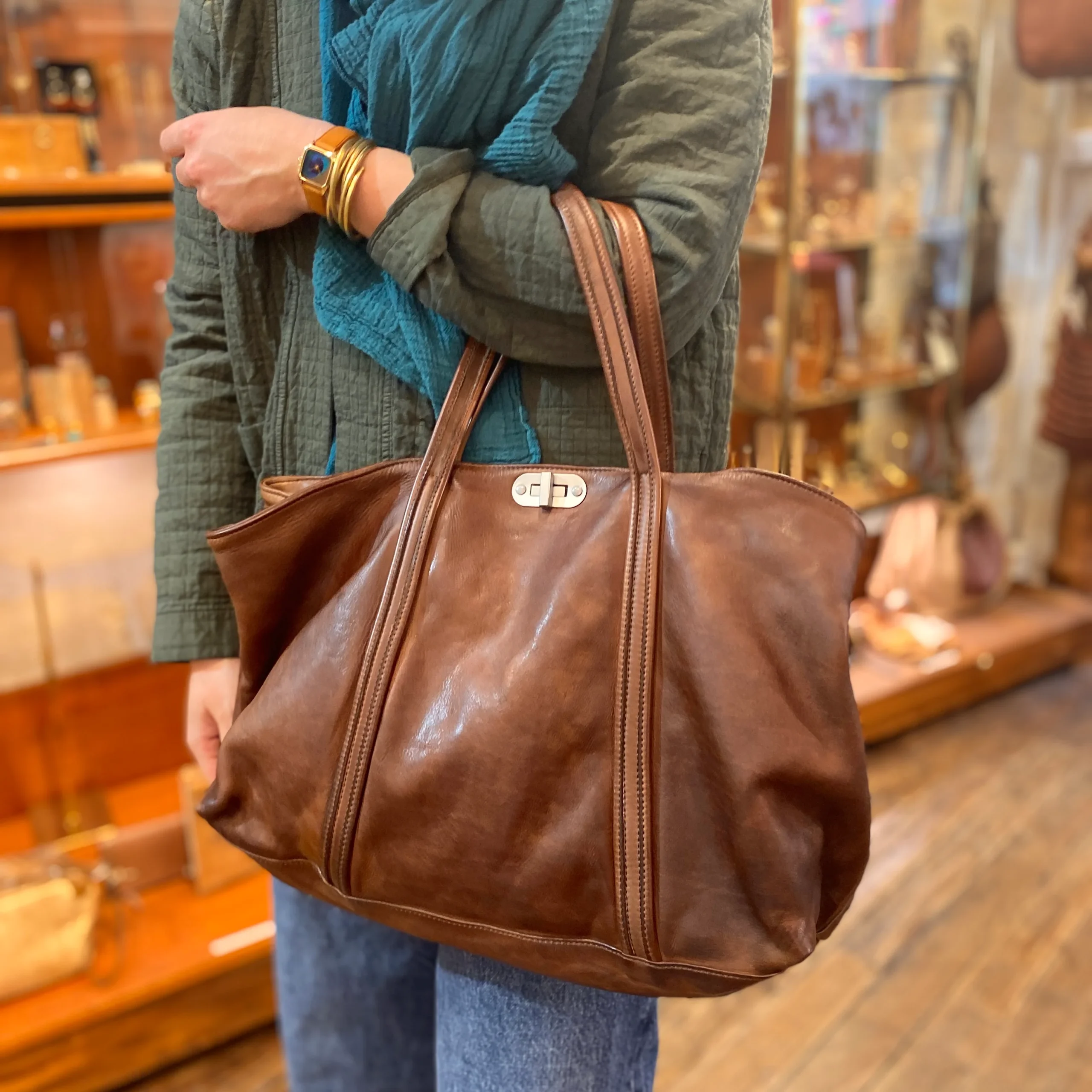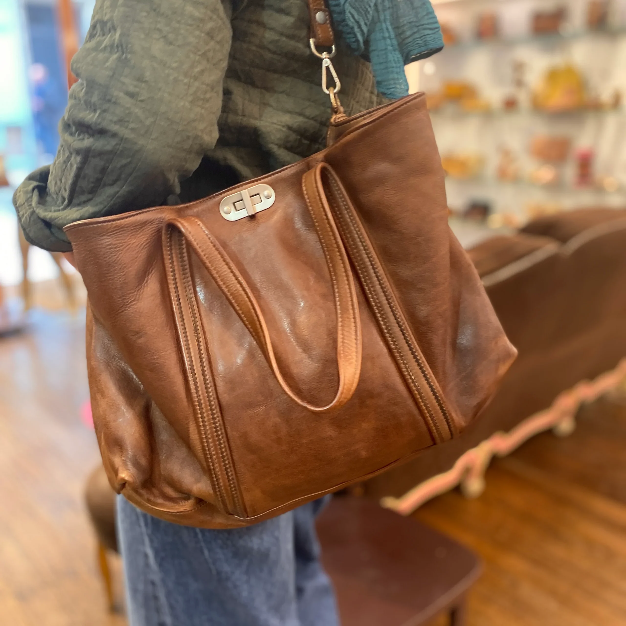 Ce sac tanné, teinté, et vieilli artisanalement à la main, est d’une simplicité et d’une élégance certaine.