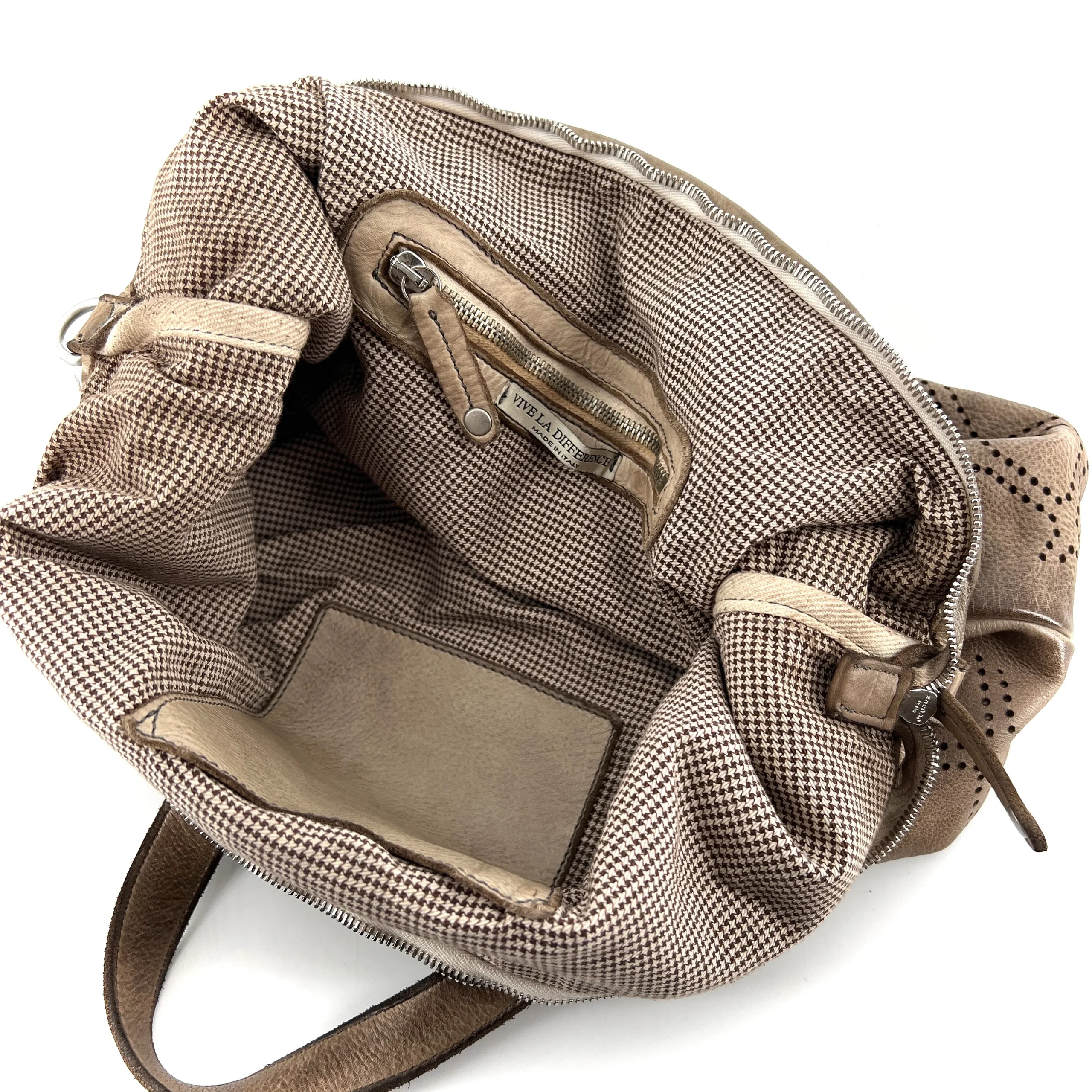 À l’intérieur, une pochette zippée et une pochette plaquée en cuir.