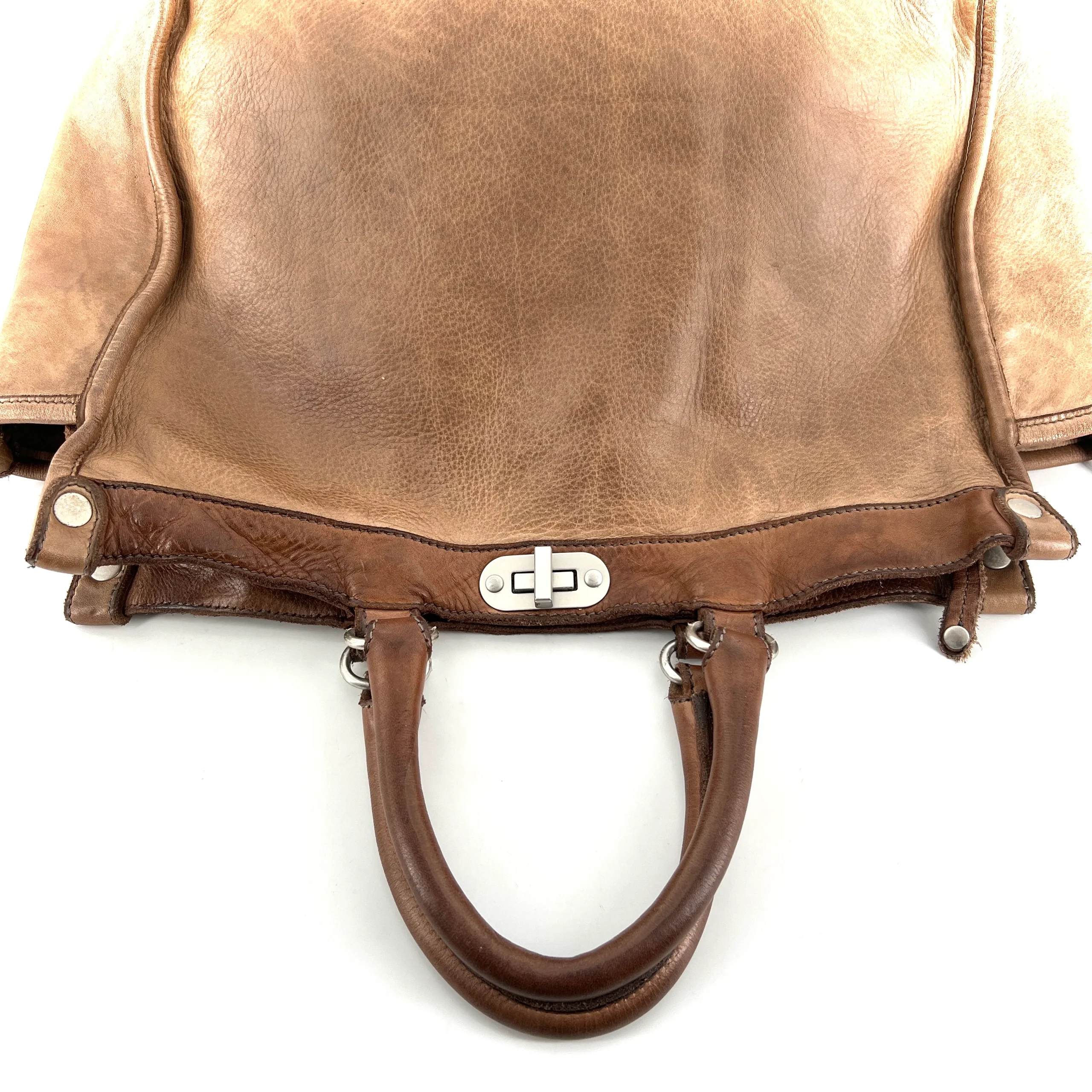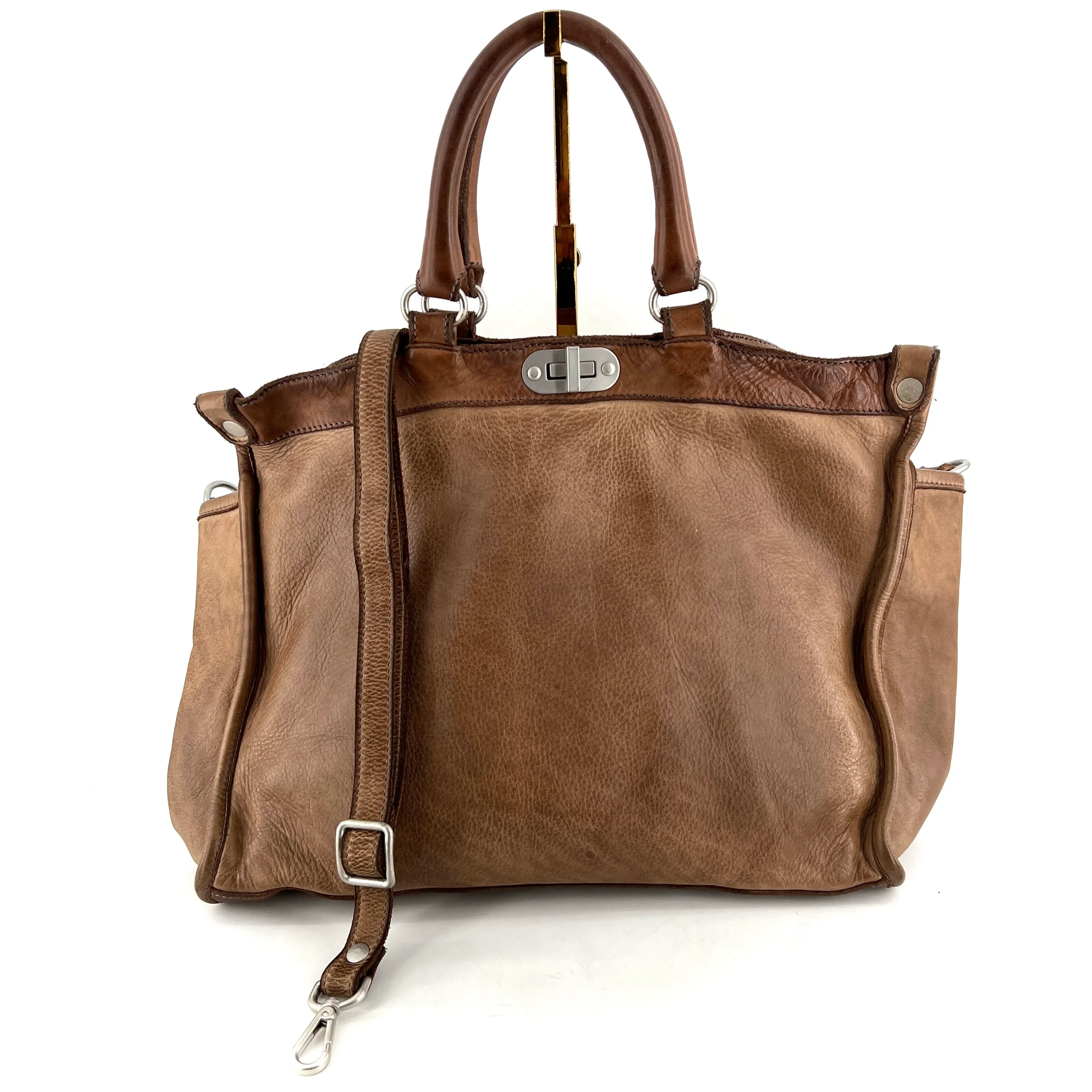 Deux poignées, en cuir patiné lavé, une bandoulière amovible et réglable en cuir.