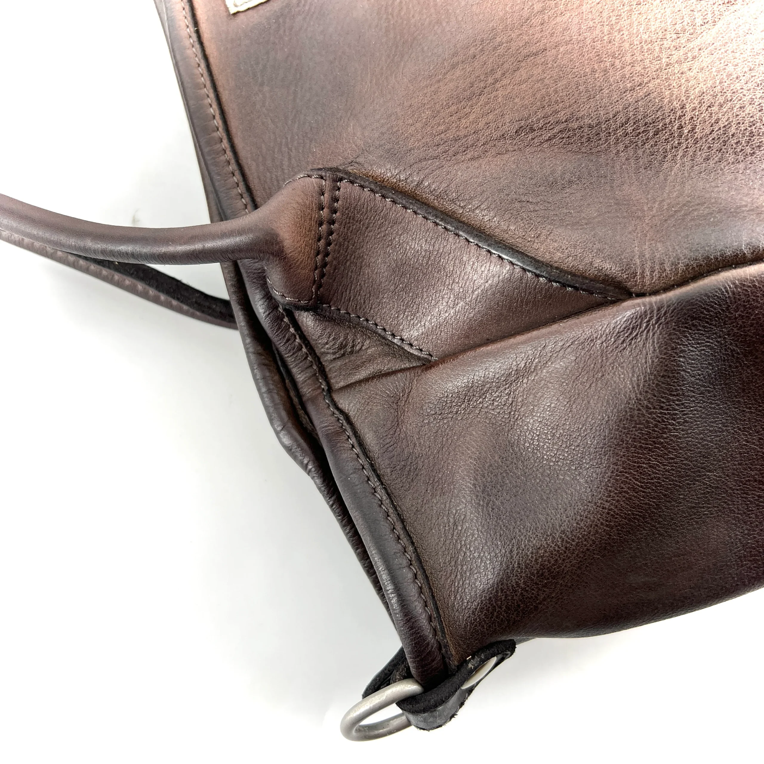 Ce sac en cuir, tanné, teinté, vieilli artisanalement à la main est d’une simplicité élégante.