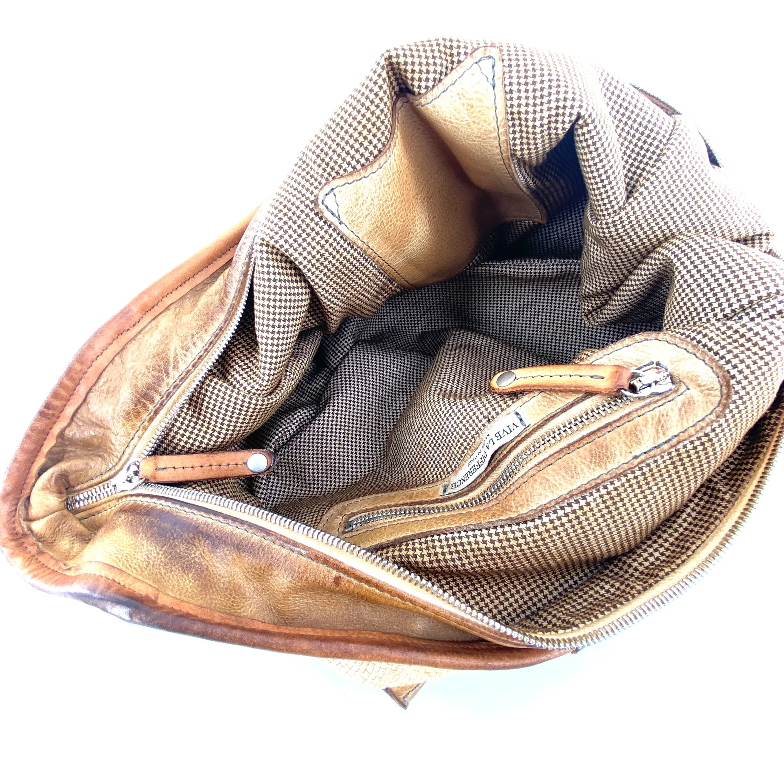 À l’intérieur, une pochette zippée et une pochette plaquée en cuir.