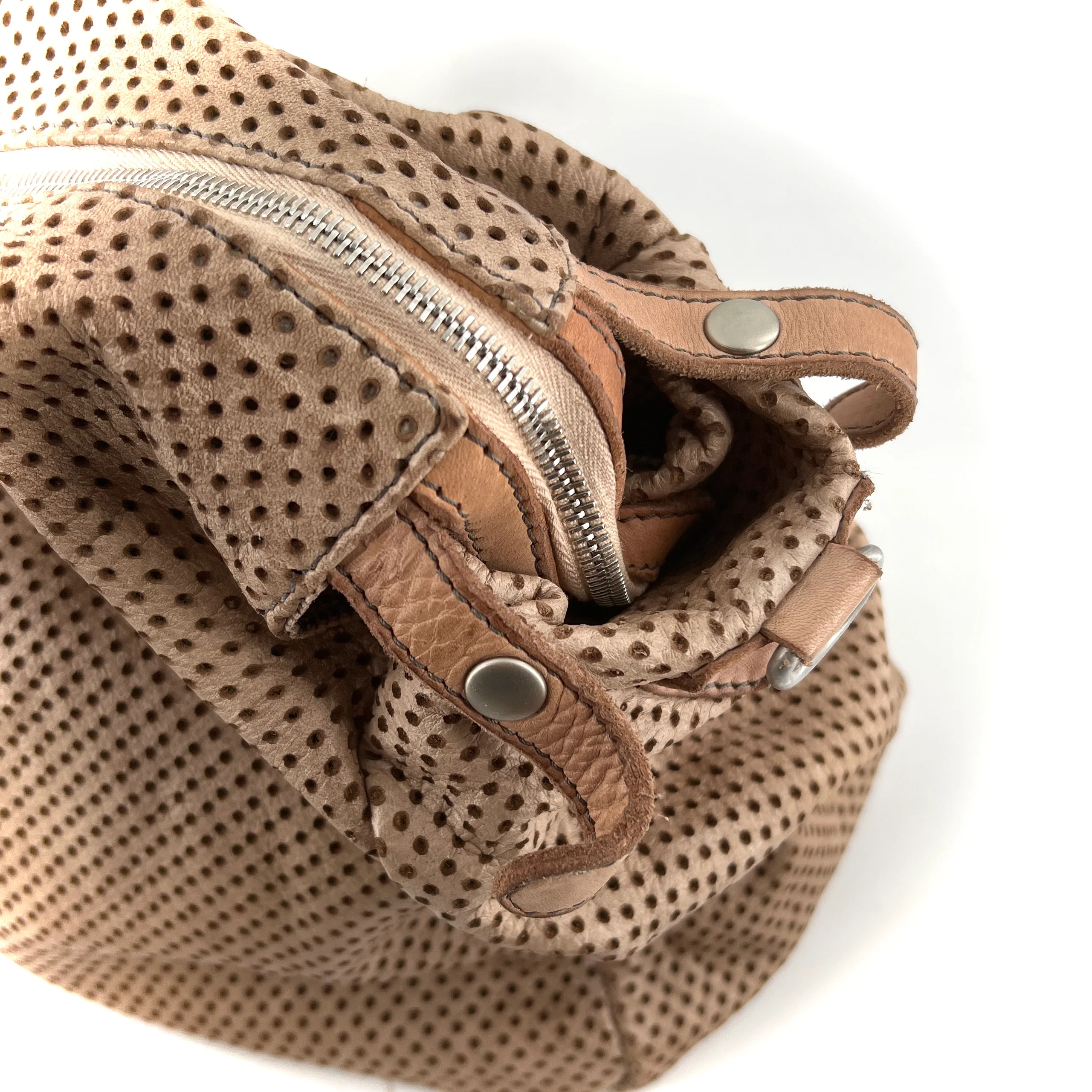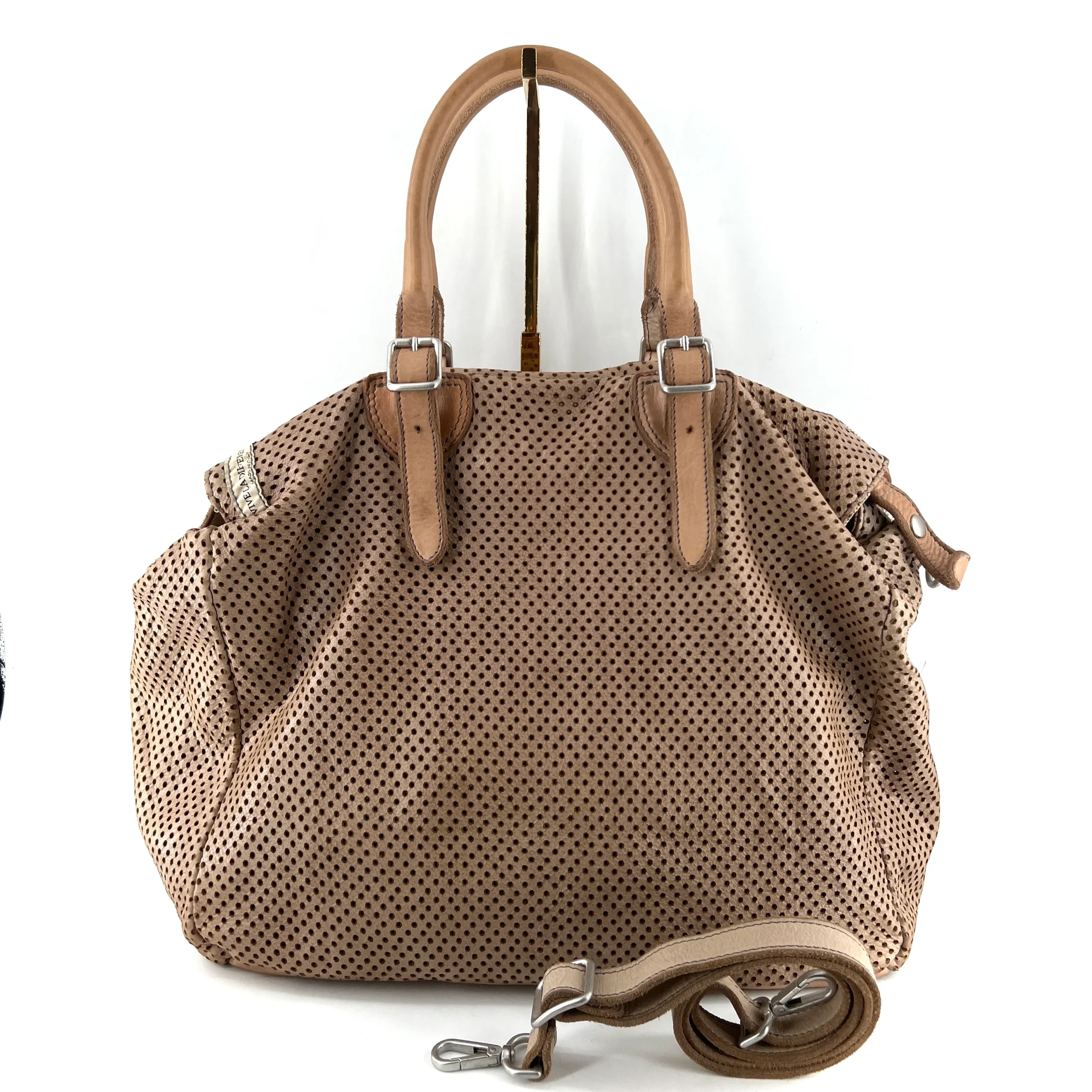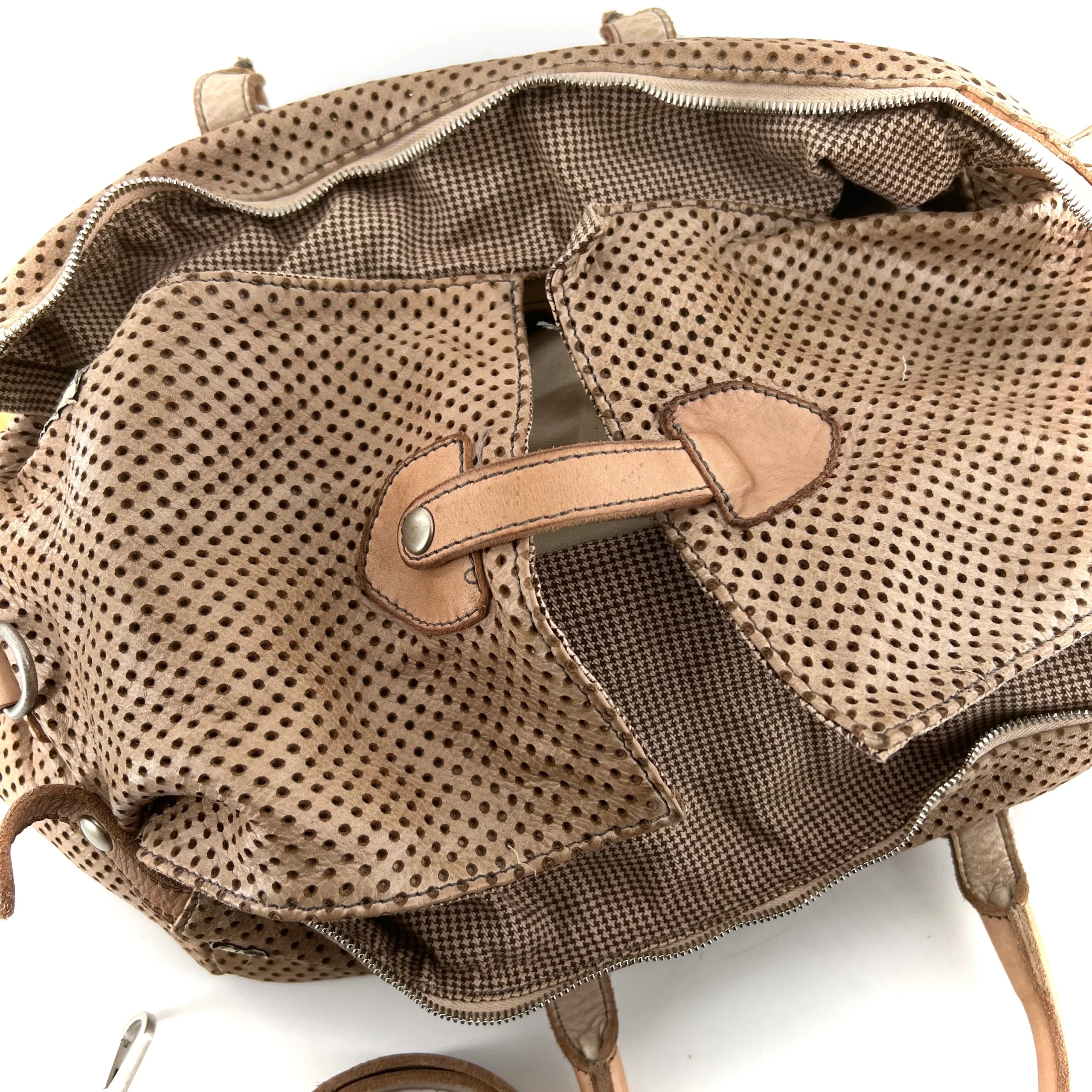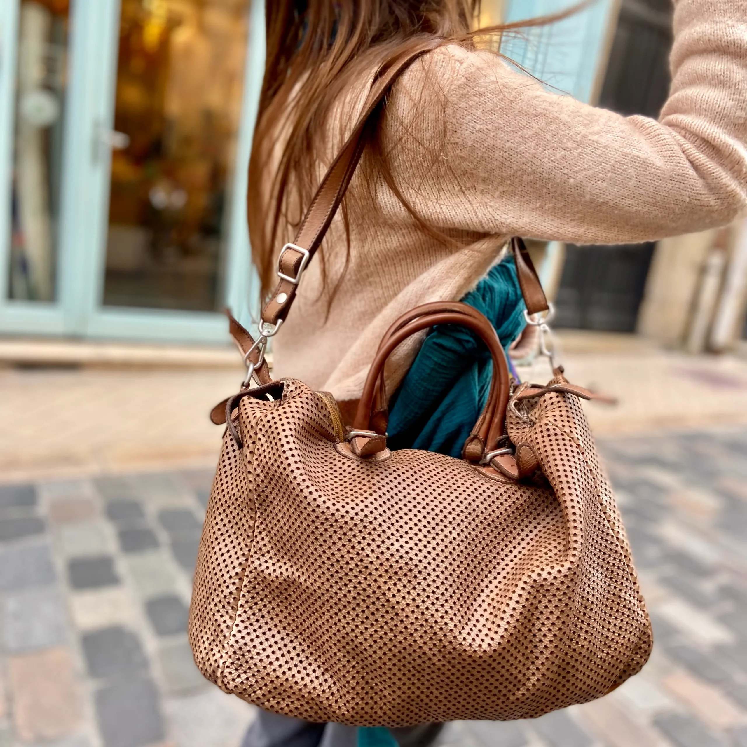 Deux poignées, réglables, en cuir patiné lavé pour un porté main ou épaule.