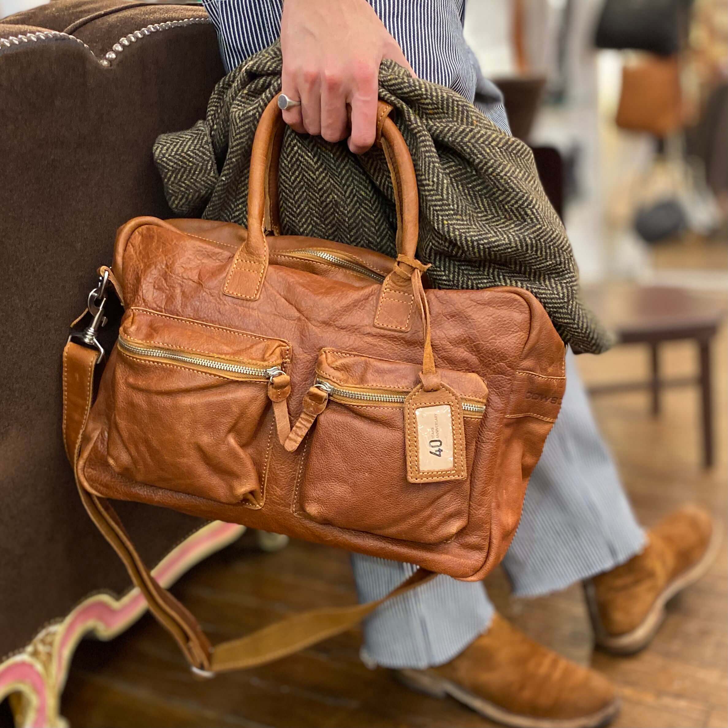 Sac en cuir Cognac à ouverture zippée. À l’intérieur une pochette plaquée zippée et une grande pochette plaquée. À l’avant, deux poches « soufflées » zippées. Une longue pochette zippée au dos. Deux poignées en cuir. Une bandoulière en cuir amovible et réglable. Existe aussi en Noir, Camel, et Kaki foncé. On aime : sac […]